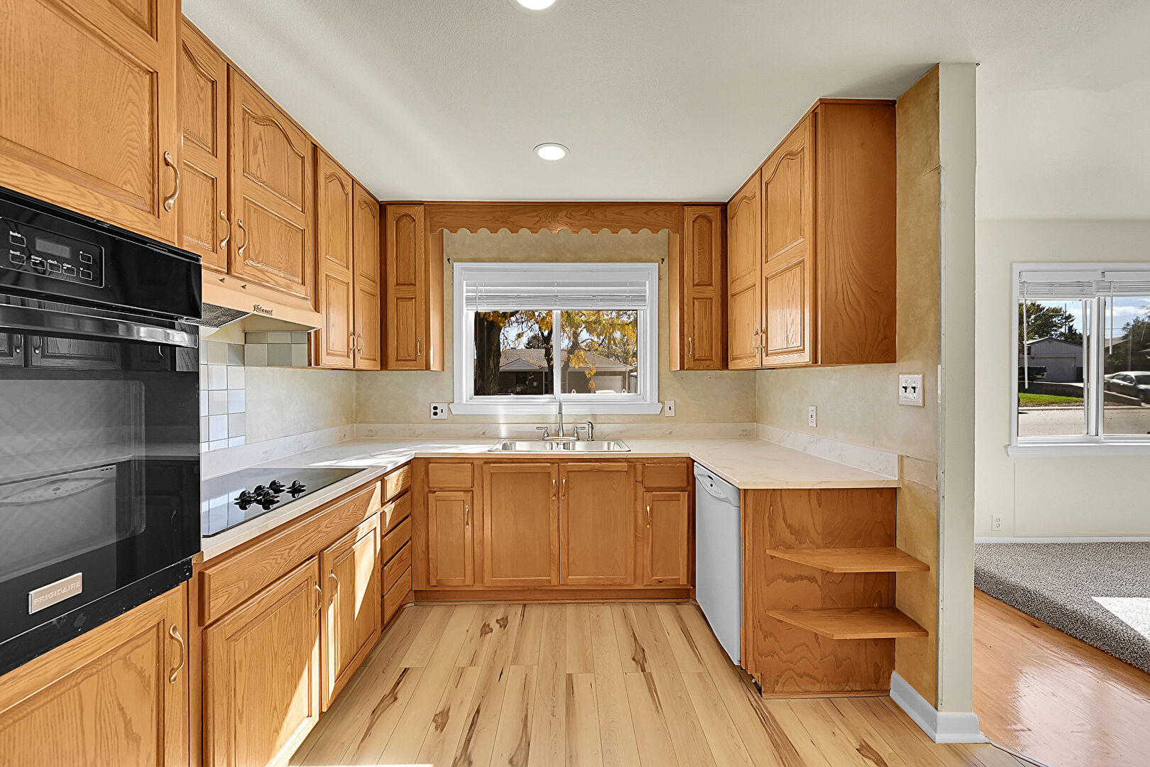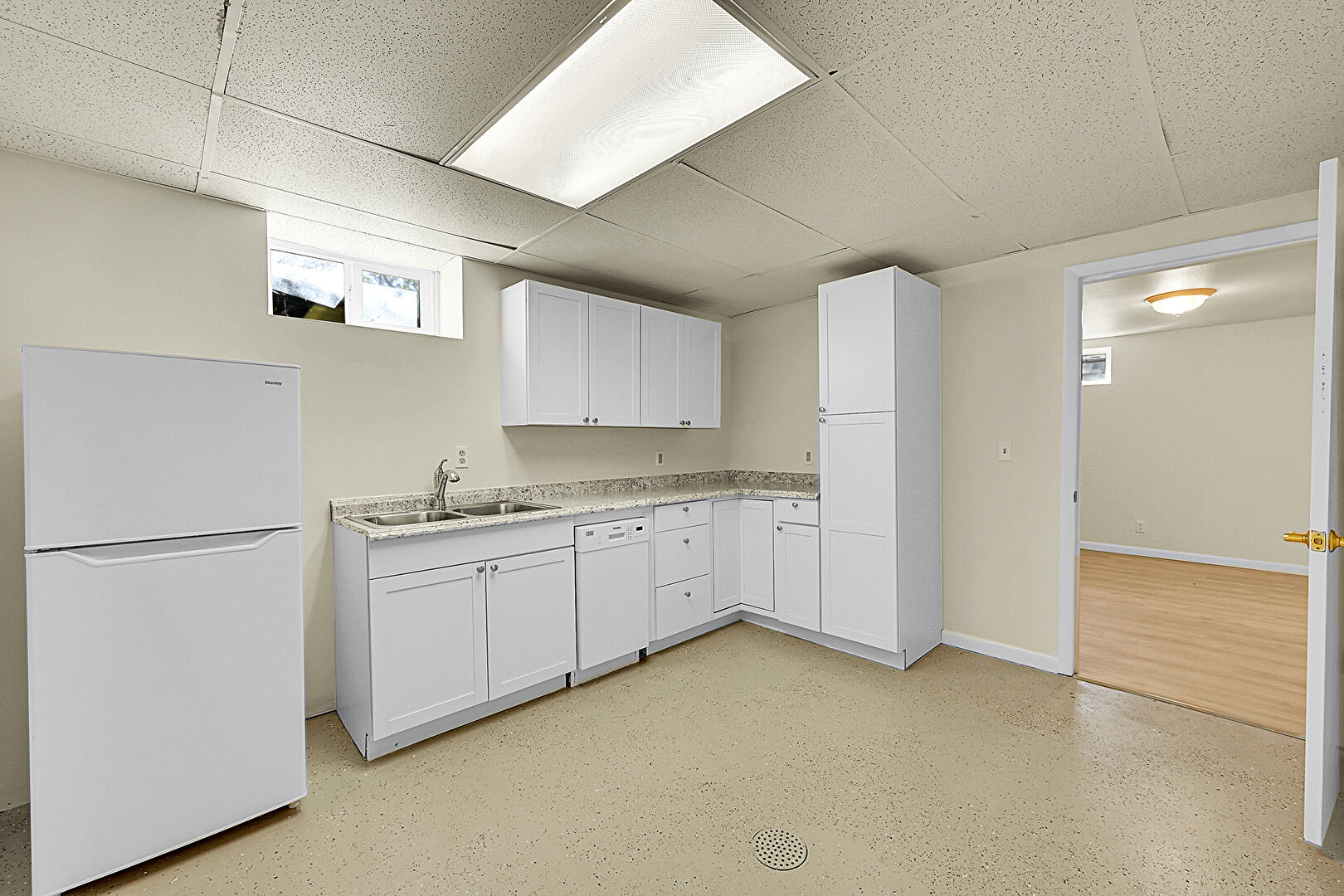 Arched Cabinets, Baseboards Wall, Basement, Drop Ceiling, Drywall, L Shaped Kitchen, Medium Brown Cabinets, Natural Light, Open Shelves, Recessed Lighting, Shaker Cabinets, Stone Countertops, Vent, Wood Finish Floor, Arched Cabinets, Baseboards Wall, Drop Ceiling, Shaker Cabinets