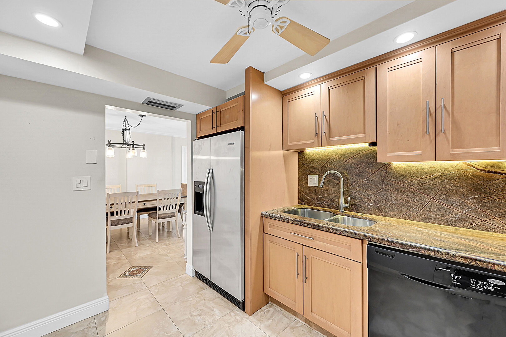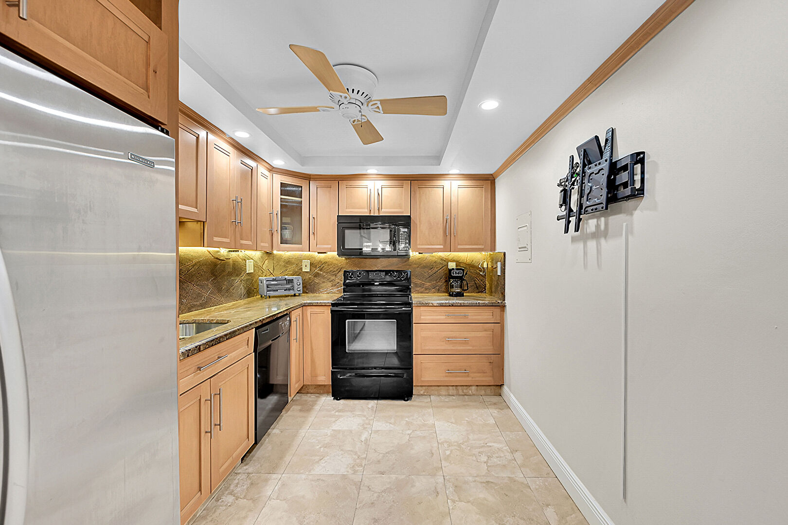 Baseboards Wall,  Ceiling Fan,  Crown Molding,  Crown Molding Cabinets,  Drywall,  Medium Brown Cabinets,  Notable Chandelier,  Pendant Lighting,  Recessed Lighting,  Shaker Cabinets,  Stone Countertops,  Tile Floor,  Toaster,  Tray Ceiling,  Vent, Crown Molding Cabinets, Glass Insert Cabinets