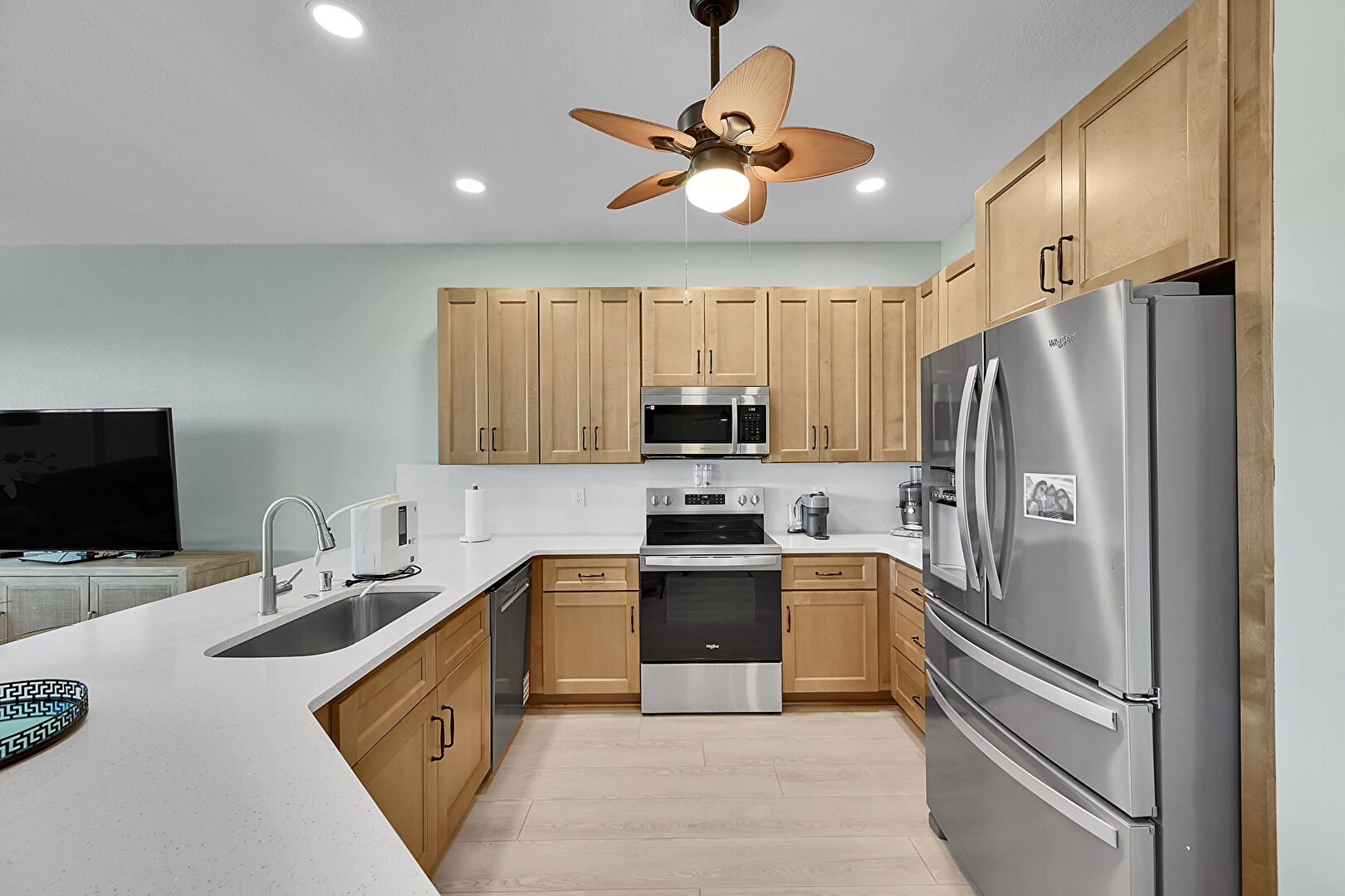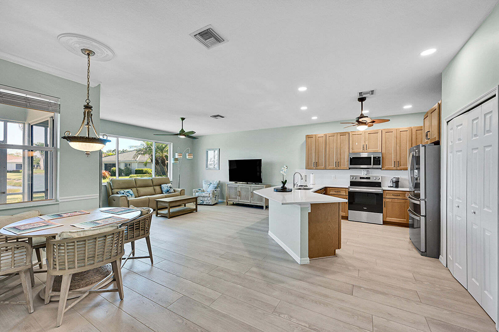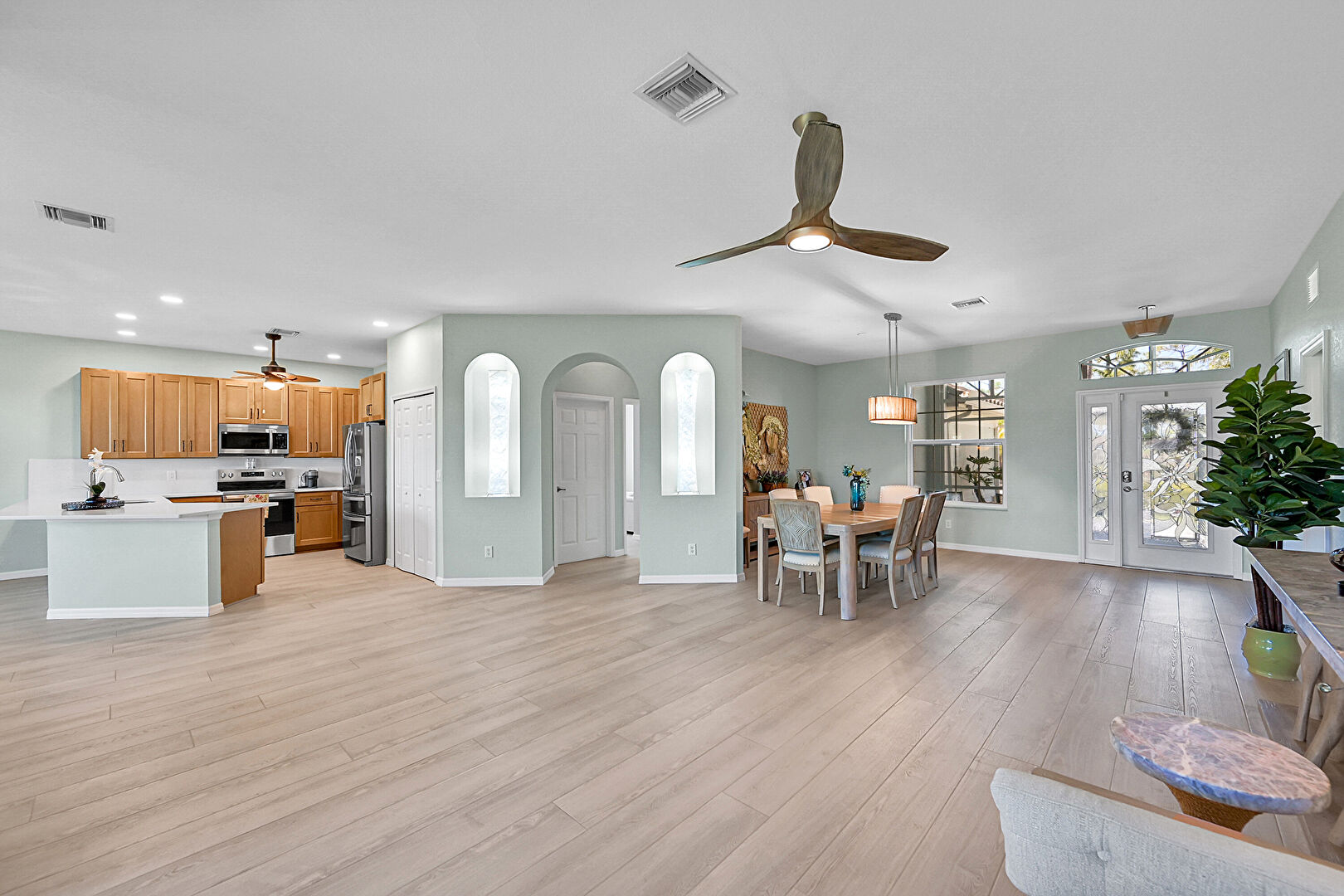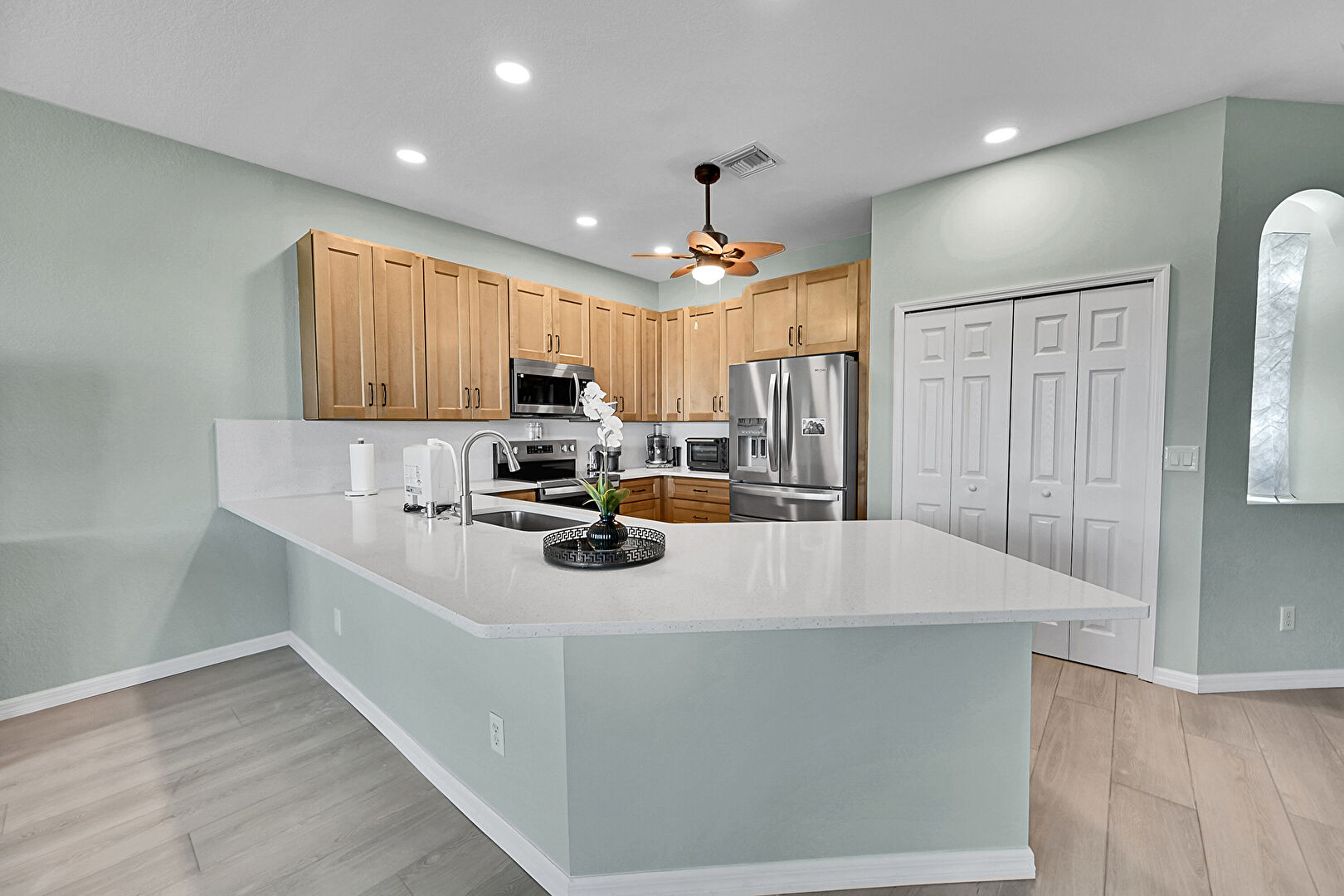 Baseboards Wall,  Ceiling Fan,  Drywall,  Natural Light,  Recessed Lighting,  Vent,  Wood Finish Floor, U Shaped Kitchen