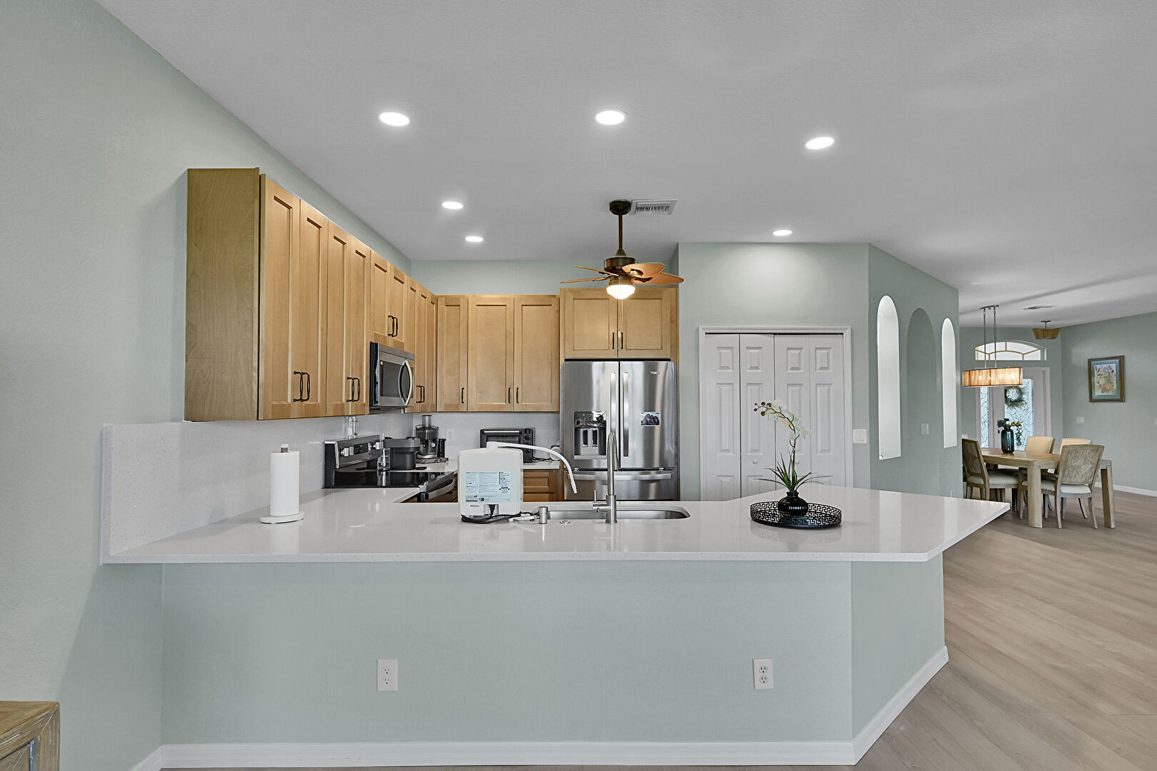 Arched Walkways,  Baseboards Wall,  Ceiling Fan,  Drywall,  Kitchen Bar,  Kitchen Peninsula,  Medium Brown Cabinets,  Natural Light,  Opens To Living Area,  Pendant Lighting,  Recessed Lighting,  Shaker Cabinets,  Stone Countertops,  Toaster,  U Shaped Kitchen,  Vent,  Wood Finish Floor, Baseboards Wall, Ceiling Fan, Shaker Cabinets, Vent