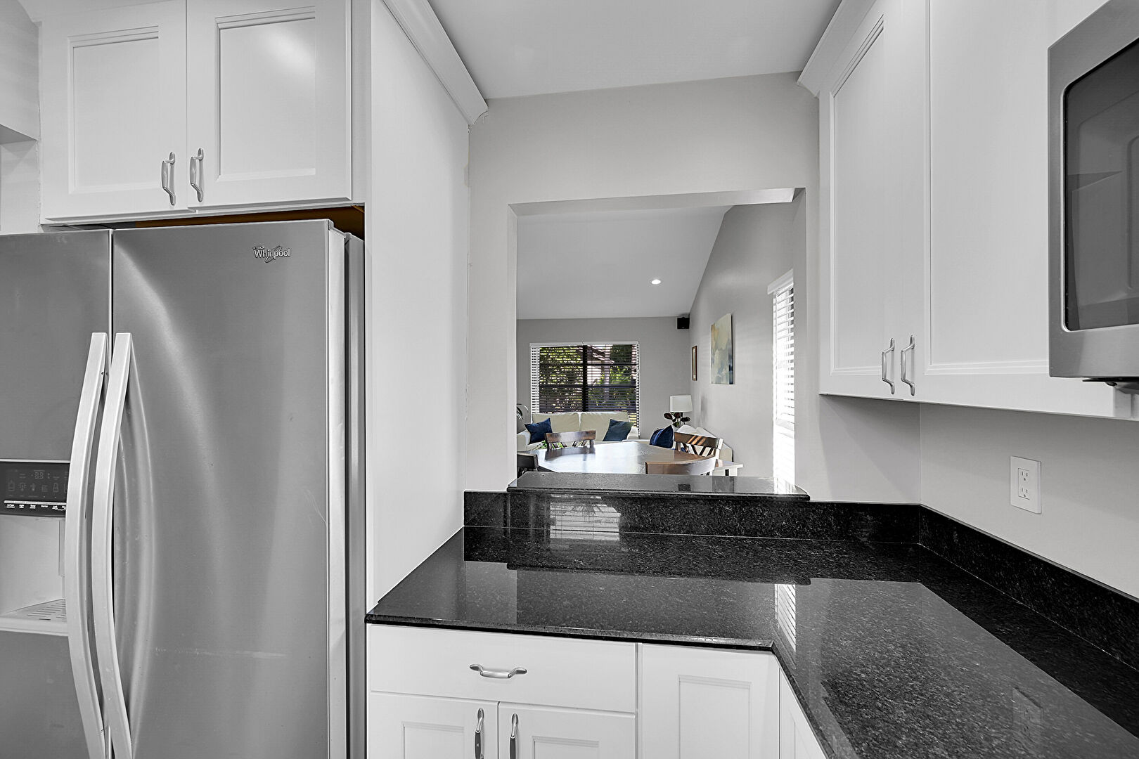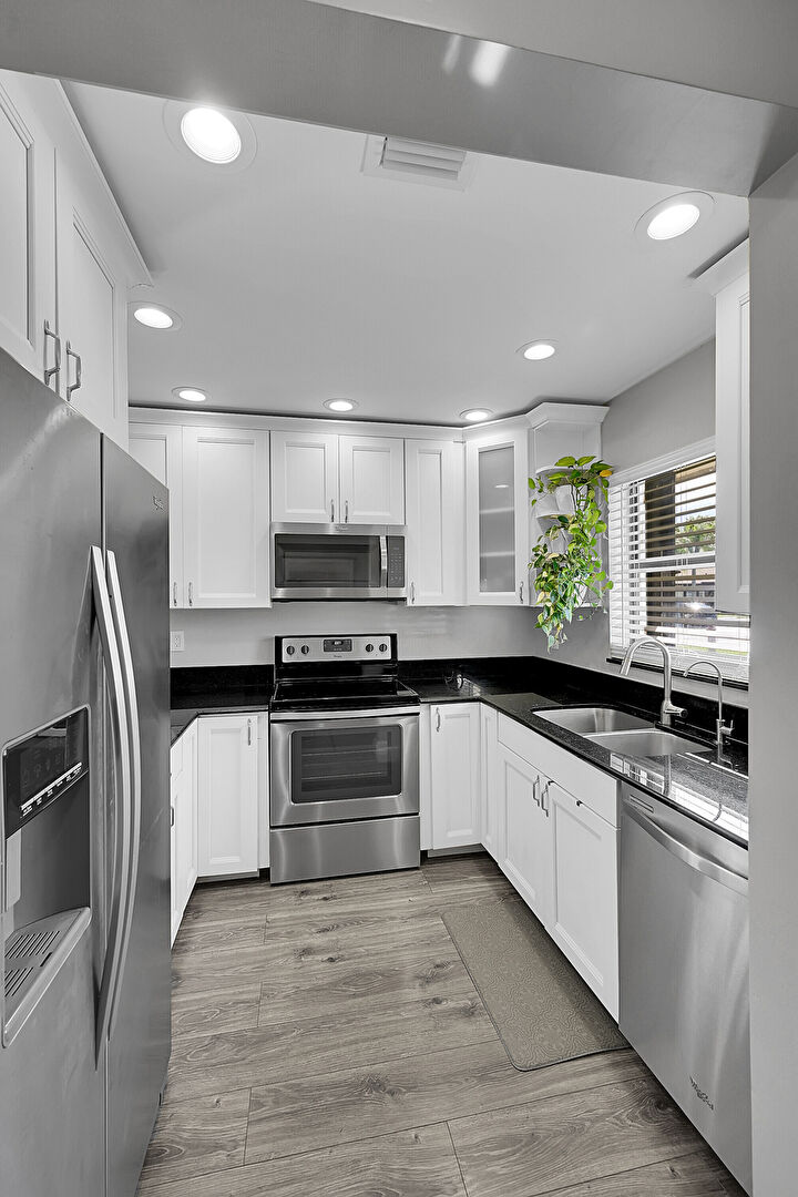 Crown Molding Cabinets, Drywall, Glass Insert Cabinets, Natural Light, Pass Through Window, Recessed Lighting, Shaker Cabinets, Stone Countertops, Vent, Wood Finish Floor, Crown Molding Cabinets, Drywall, Natural Light, Recessed Lighting