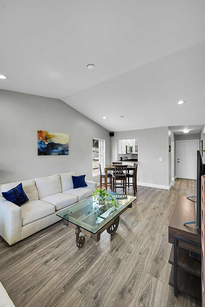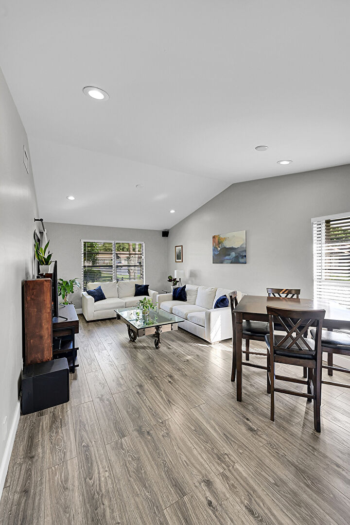Baseboards Wall, Drywall, Recessed Lighting, Vaulted Ceiling, Wood Finish Floor, Natural Light