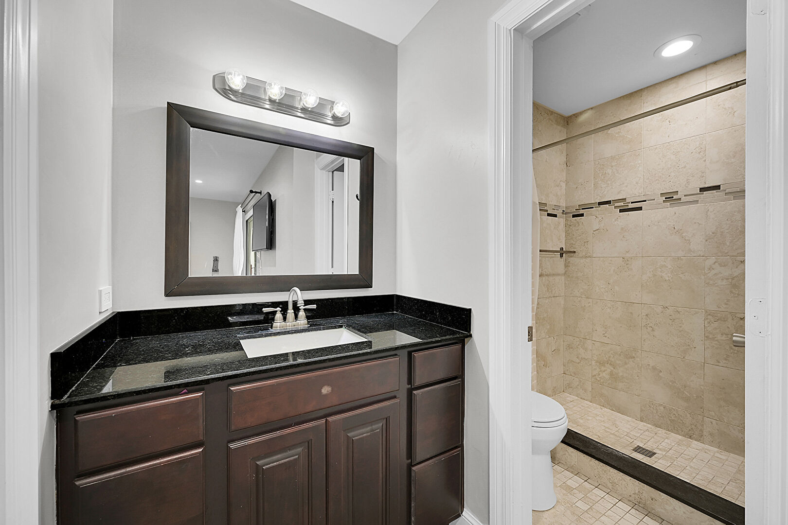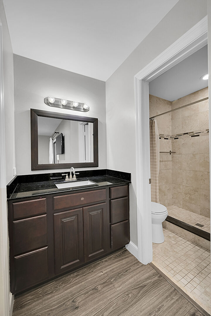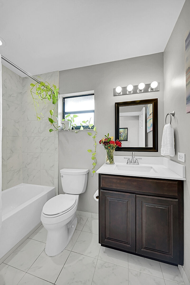 Baseboards Wall, Combined Bath Shower, Drywall, Full Bathroom, Marble Finish Floor, Natural Light, Recessed Lighting, Vanity, Wood Finish Floor, Baseboards Wall, Full Bathroom, Vanity