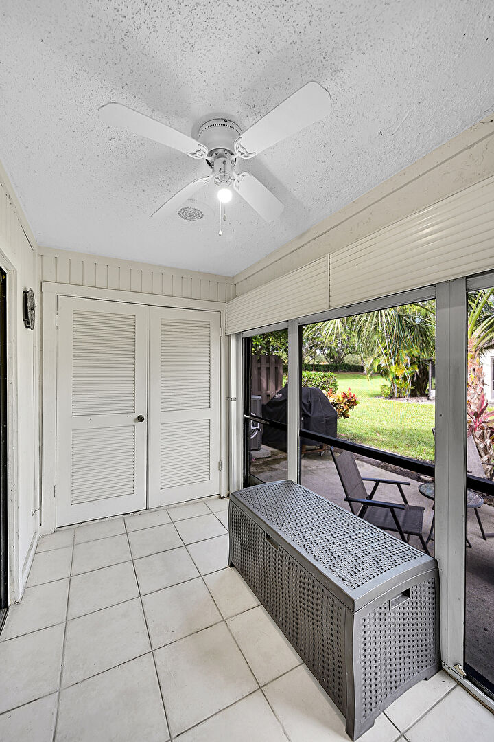 Baseboards Wall, Ceiling Fan, French Doors, Grill, Natural Light, Sunroom, Textured Ceiling, Tile Floor, Wood Wall, Ceiling Fan, Sunroom