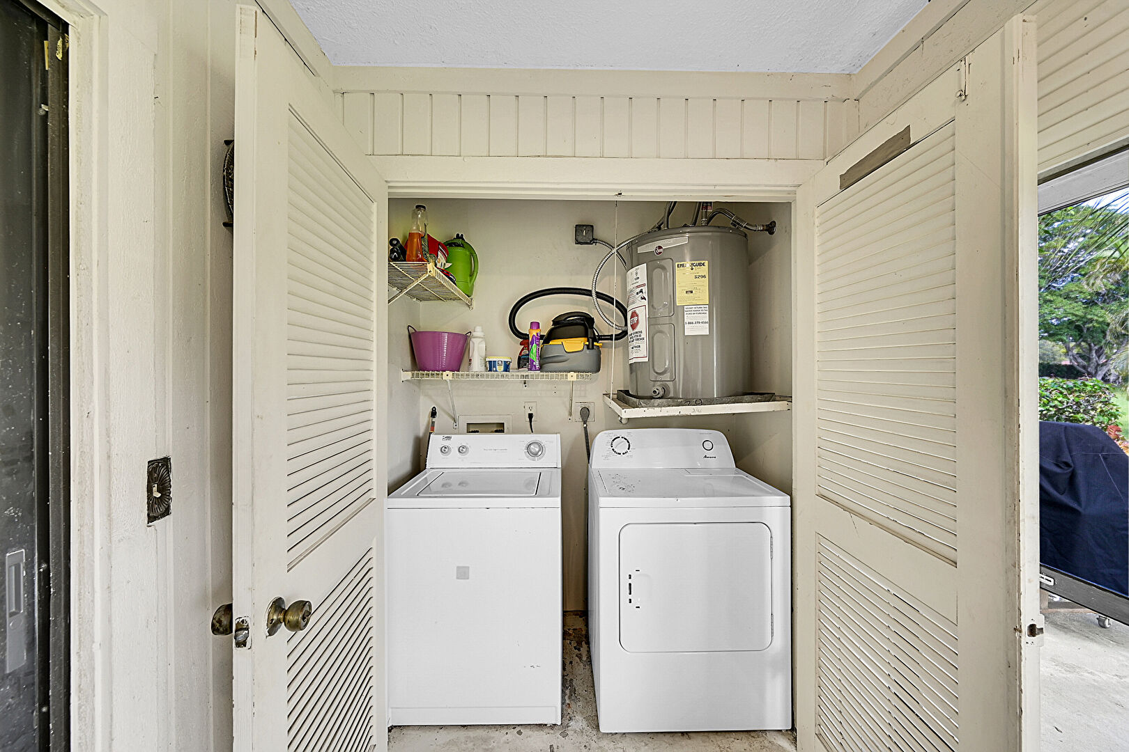 Concrete Floor, Electric Dryer Hookup, Grill, Laundry, Natural Light, Water Heater, Wood Wall, Washer Hookup