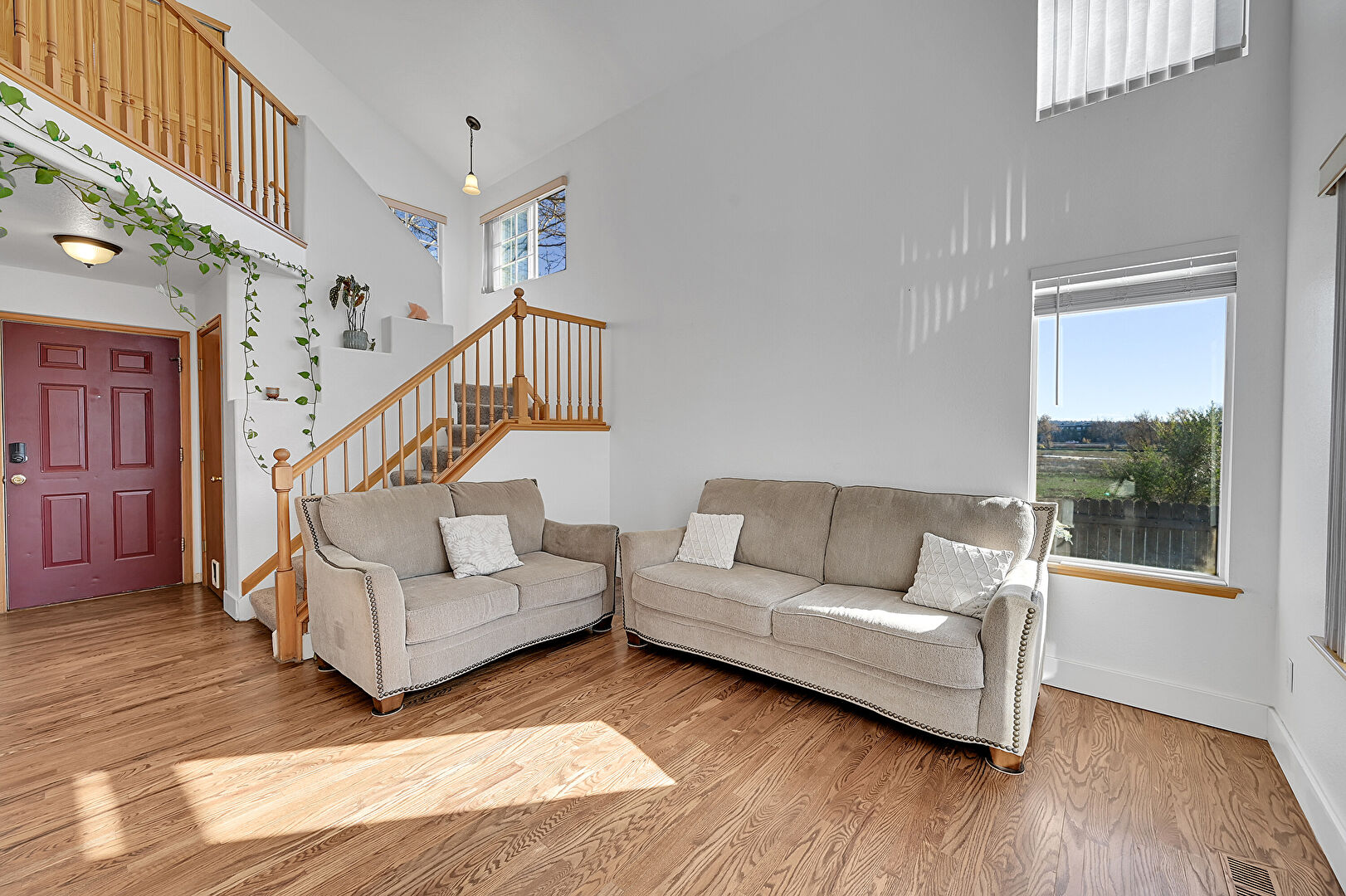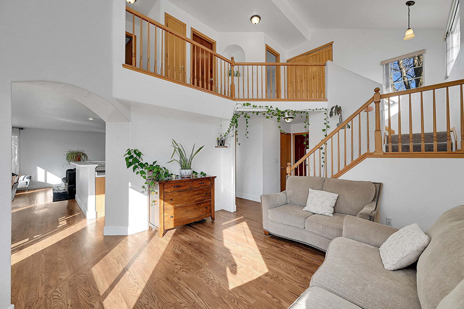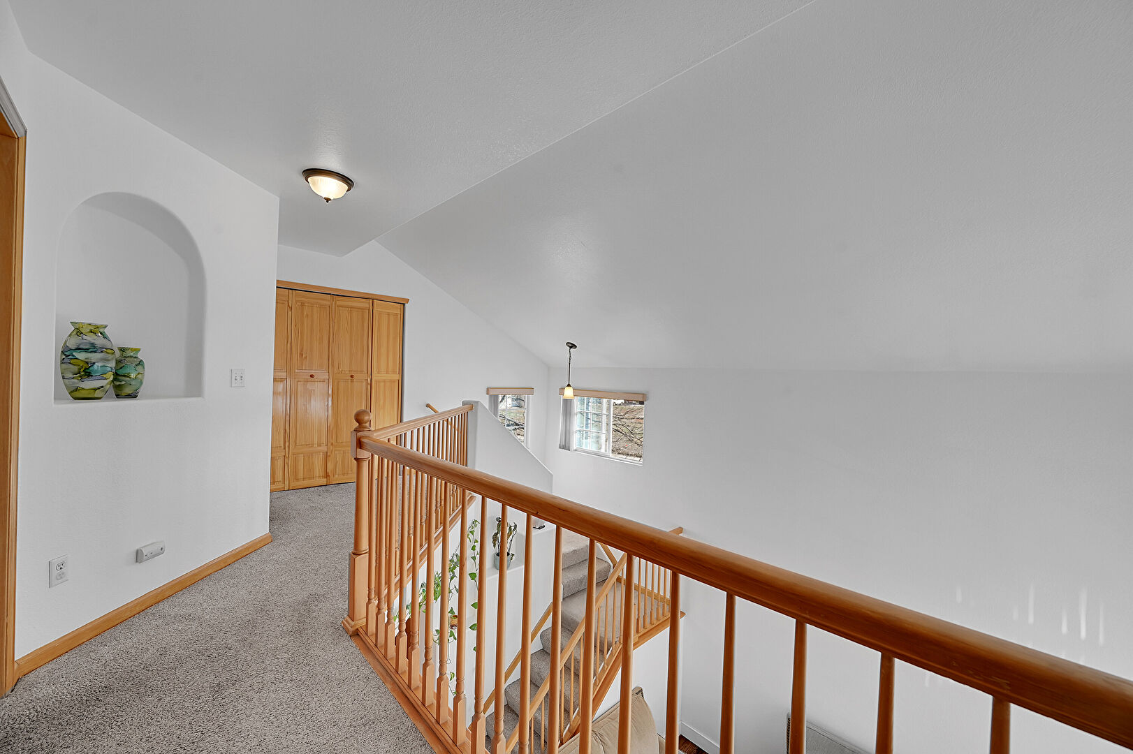 Baseboards Wall, Carpet, Drywall, Loft, Upstairs Landing, Vaulted Ceiling, Natural Light