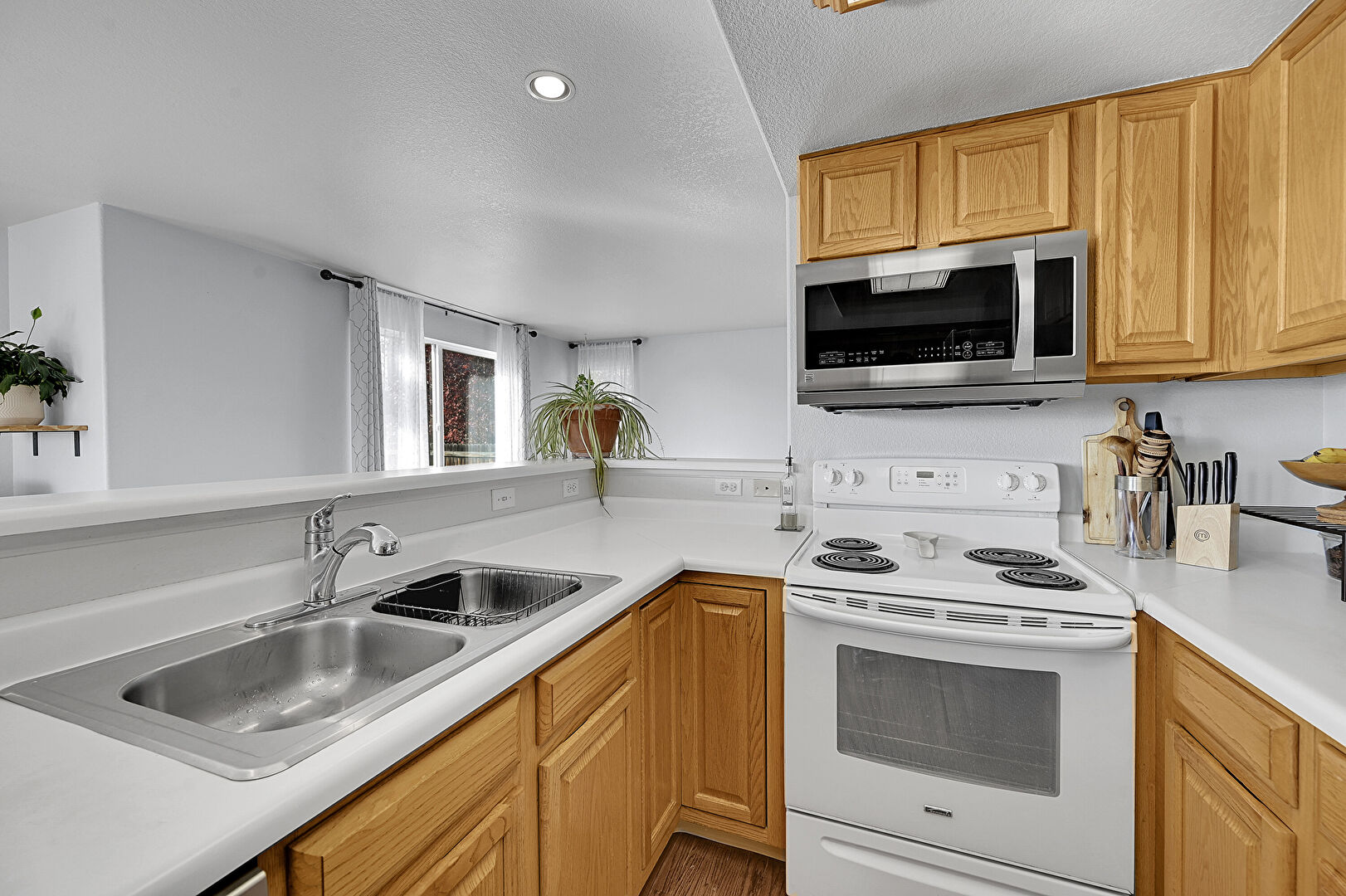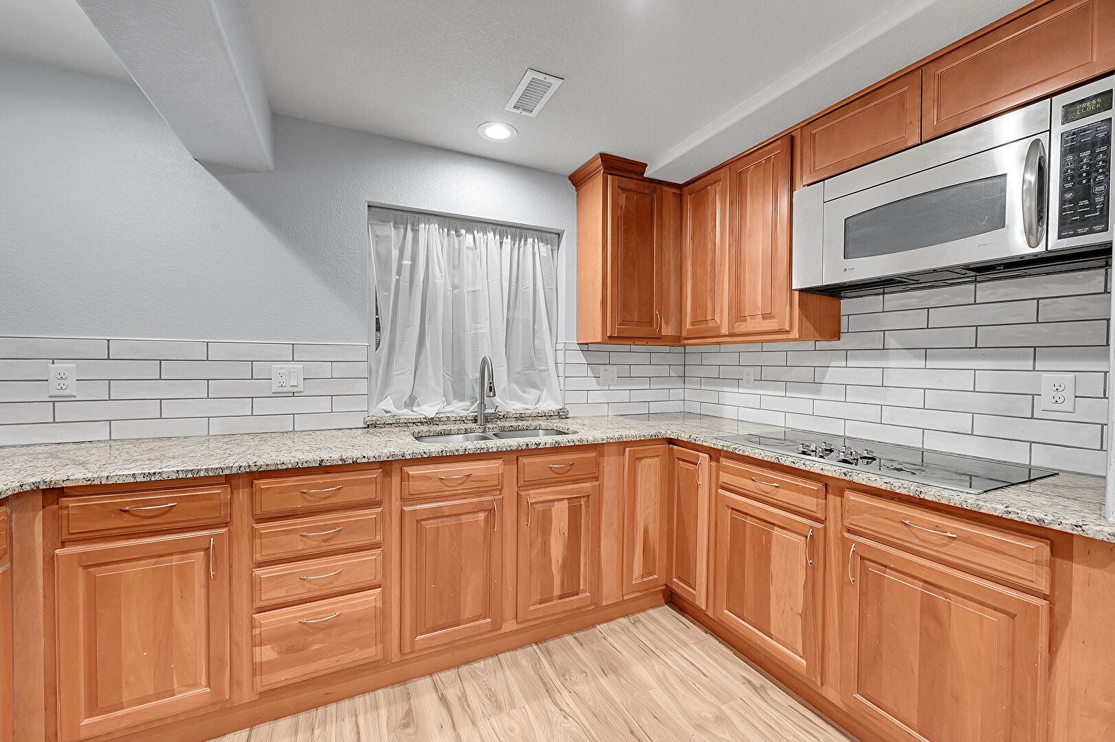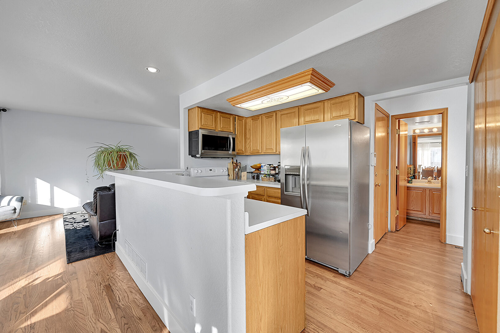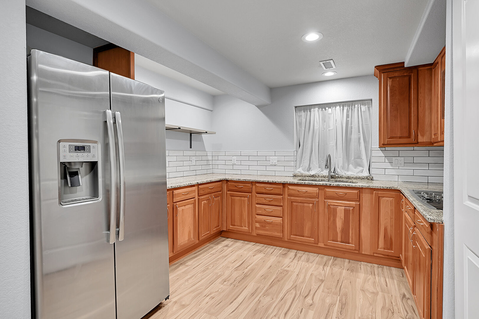 Crown Molding Cabinets, Drywall, Kitchen Peninsula, Medium Brown Cabinets, Natural Light, Raised Cabinets, Recessed Lighting, Stone Countertops, Textured Ceiling, U Shaped Kitchen, Vent, Wood Finish Floor, Drywall, Medium Brown Cabinets, Recessed Lighting, Vent