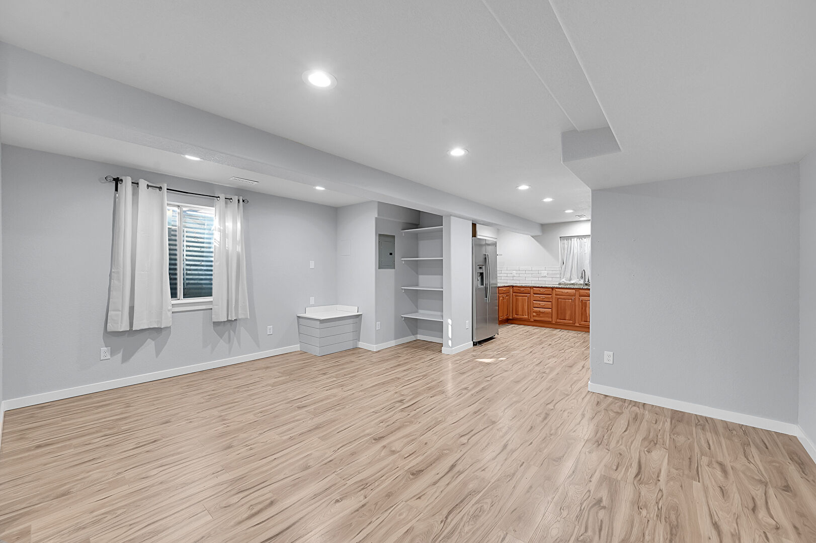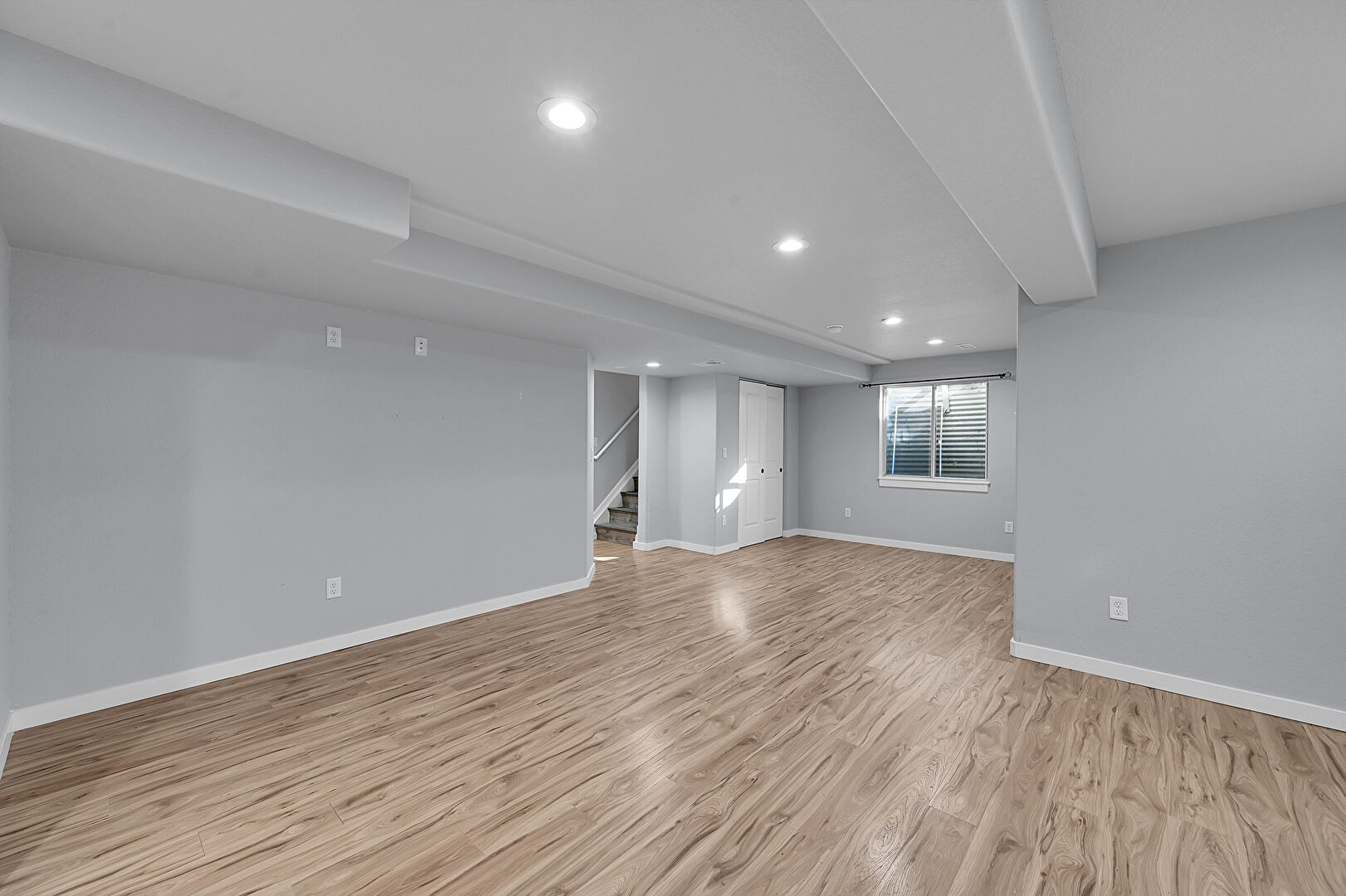 Baseboards Wall, Basement, Drywall, Natural Light, Recessed Lighting, Stairs, Wood Finish Floor, Basement, Drywall