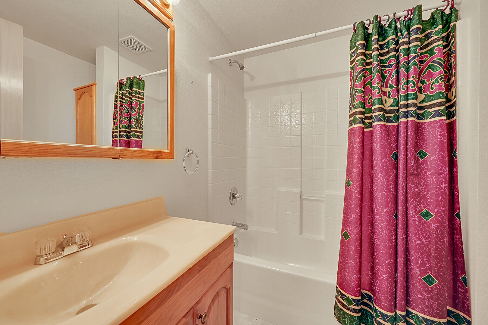 Baseboards Wall, Combined Bath Shower, Double Vanity, Drywall, Full Bathroom, Tile Floor, Vanity, Vent, Baseboards Wall, Combined Bath Shower, Half Bathroom