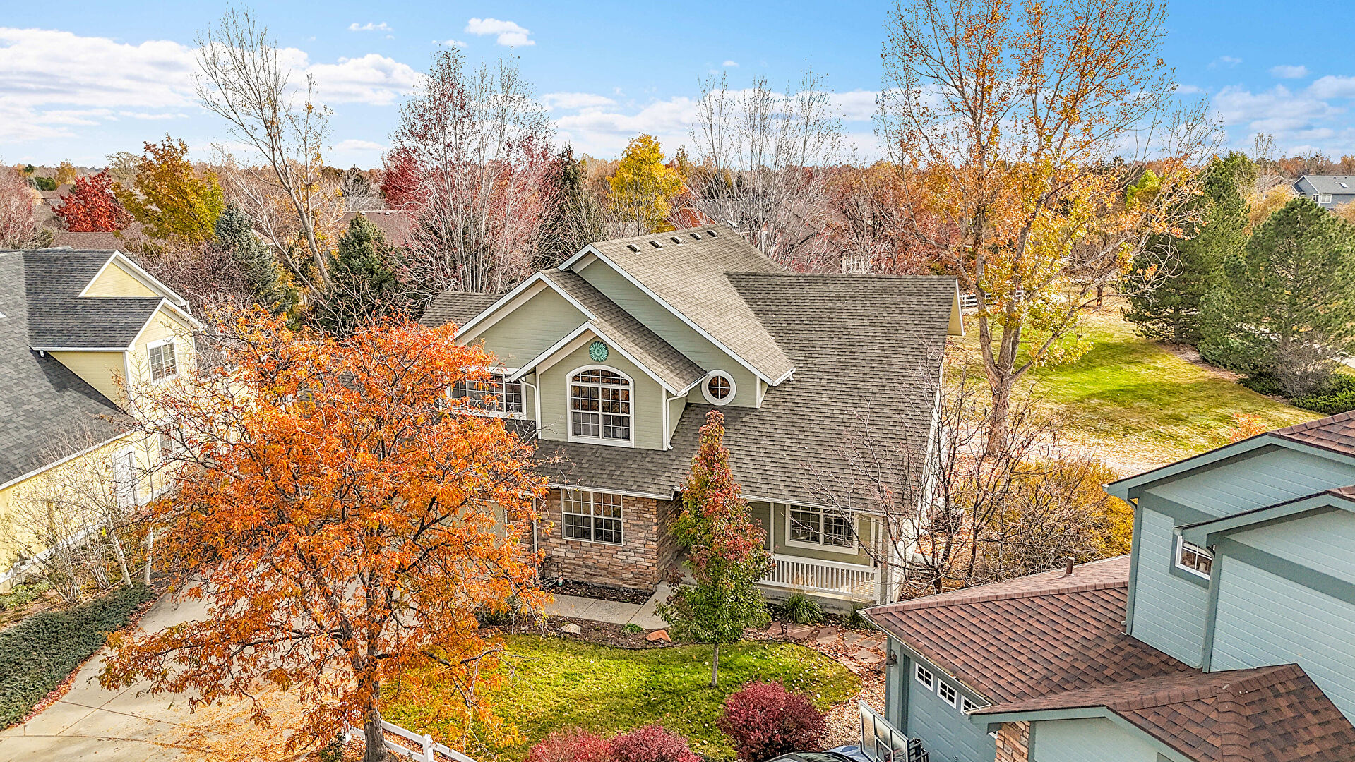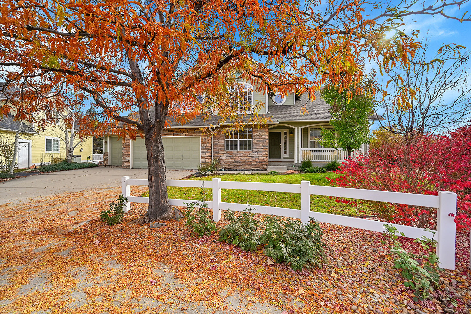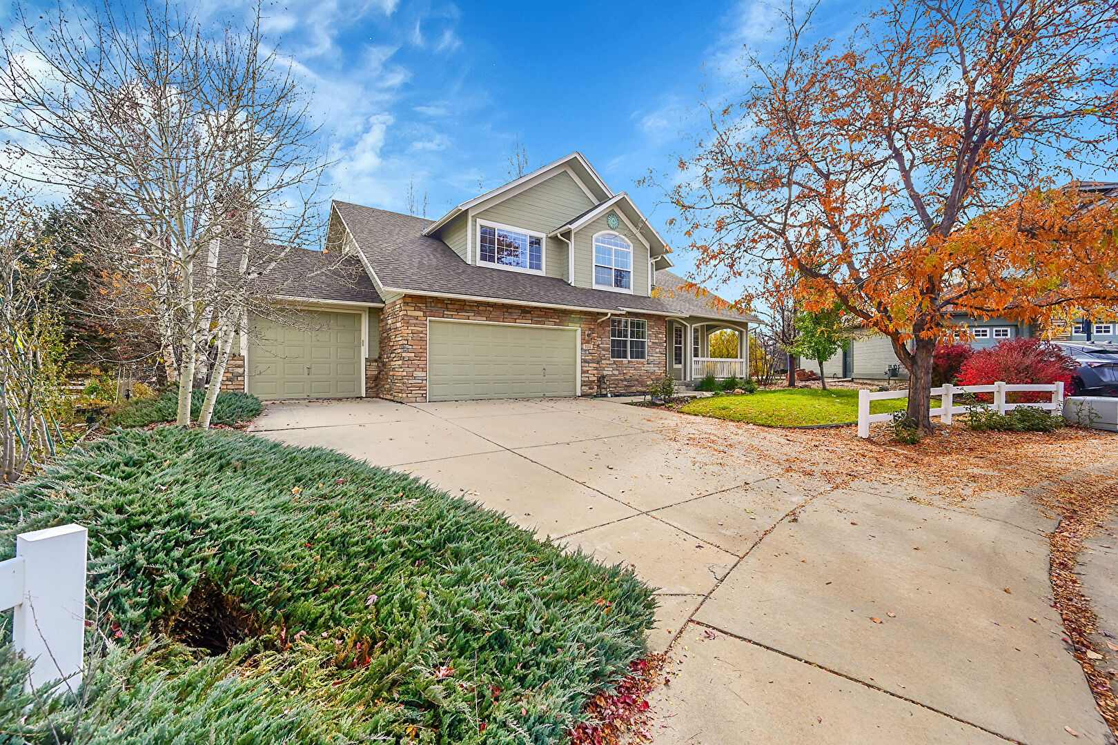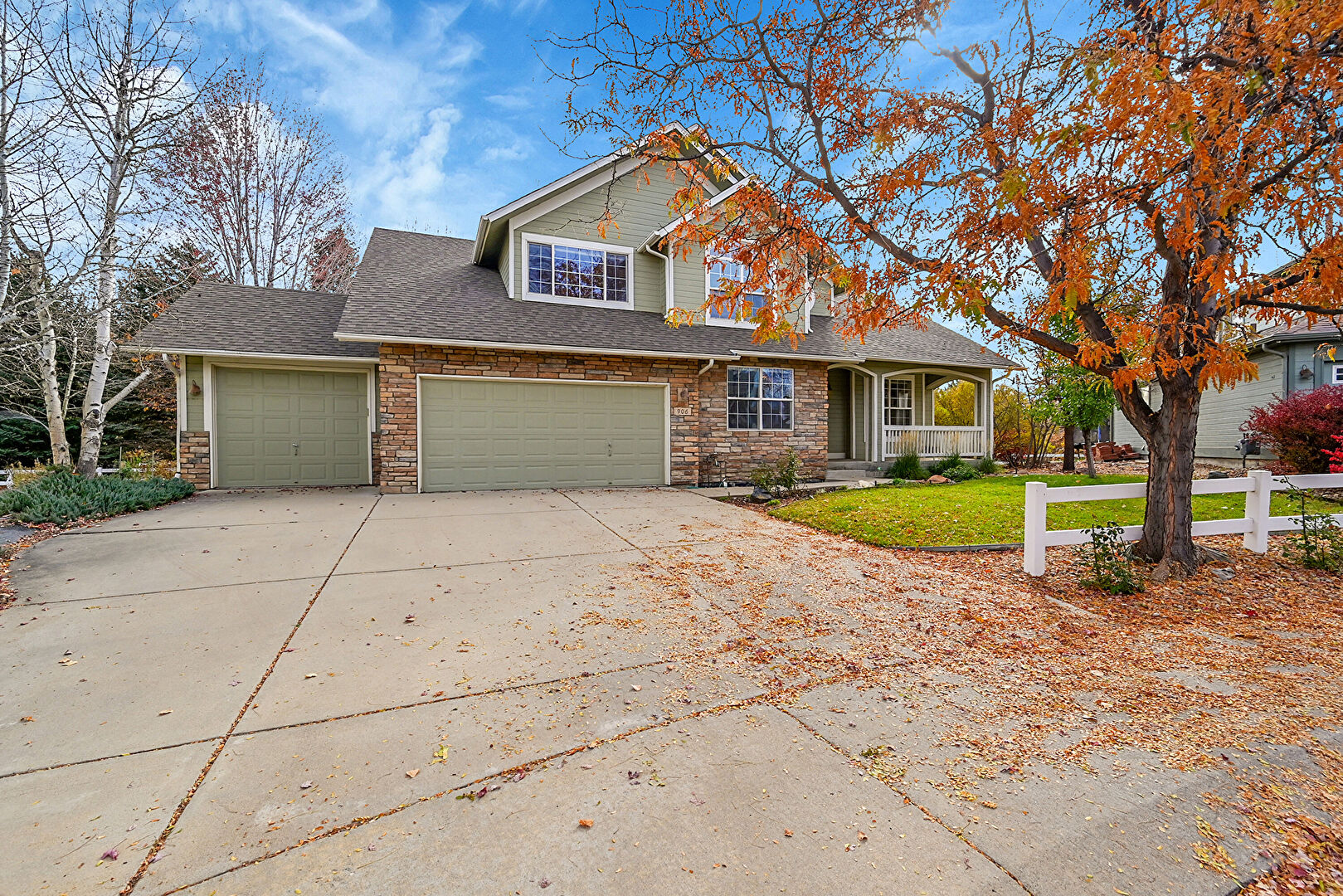 Dormer Roof, Downspout, Driveway, Fence, Gutters, Horizontal Siding, Lawn, Porch, Shingle Roof, Stone Siding, Driveway, Gutters, Horizontal Siding, Stone Siding