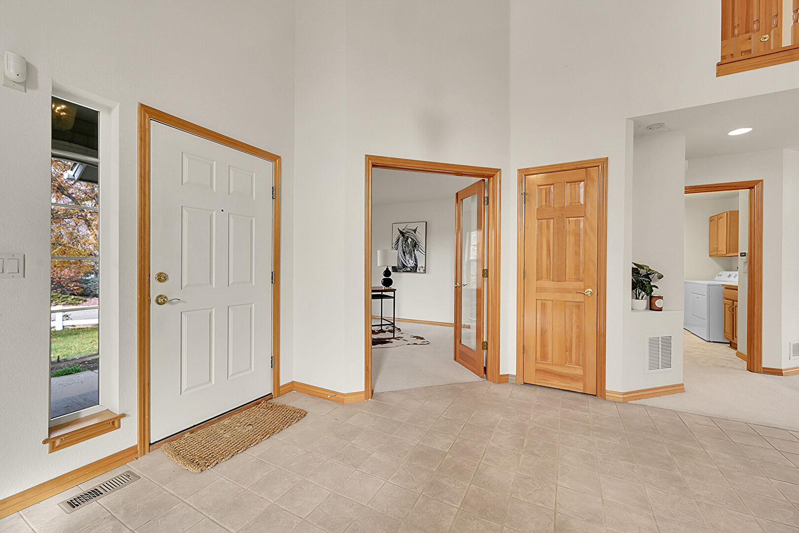 Baseboards Wall, Drywall, High Ceiling, Laundry, Natural Light, Recessed Lighting, Vent, Washer Dryer, French Doors