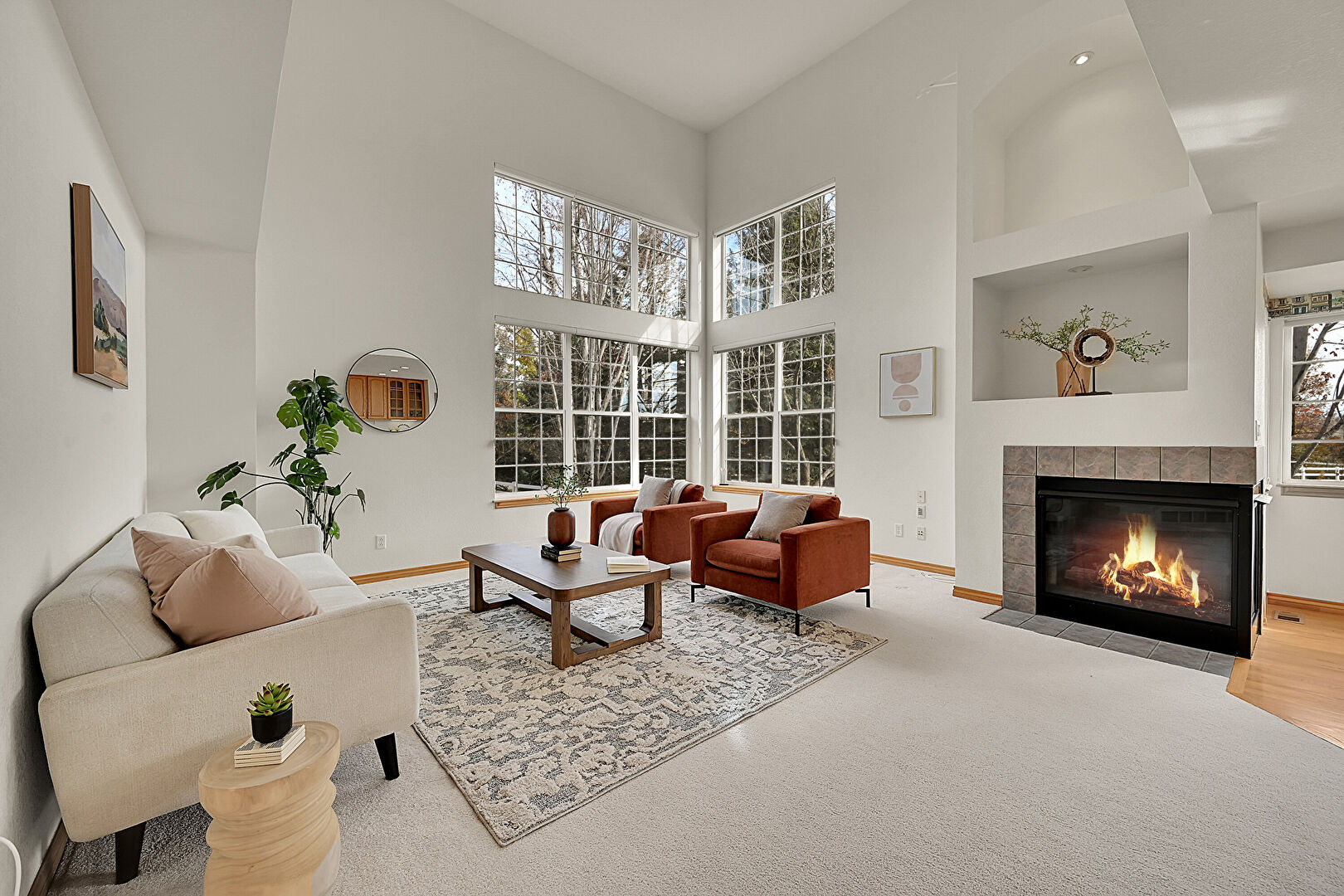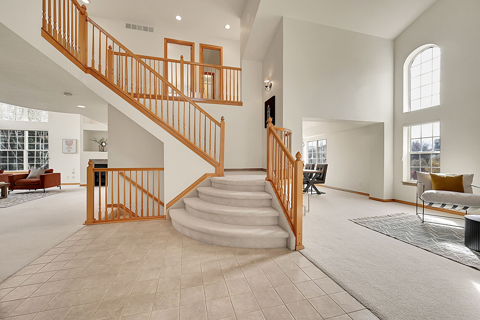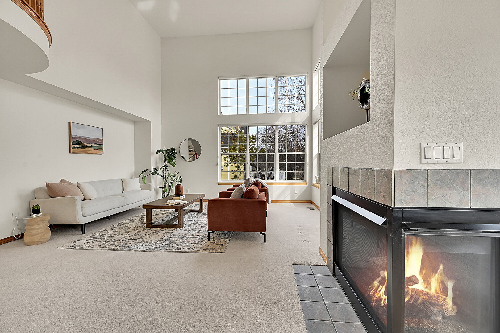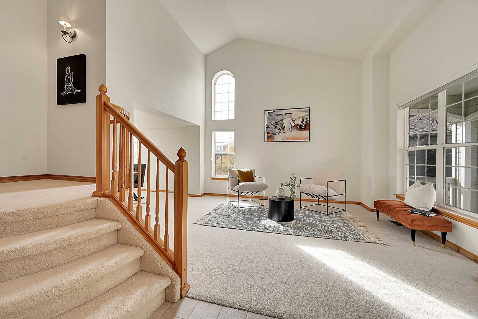 Baseboards Wall, Carpet, Drywall, Fireplace, High Ceiling, Natural Light, Recessed Lighting, Stairs, Tile Floor, Vaulted Ceiling, Vent, High Ceiling, Natural Light, Tile Floor