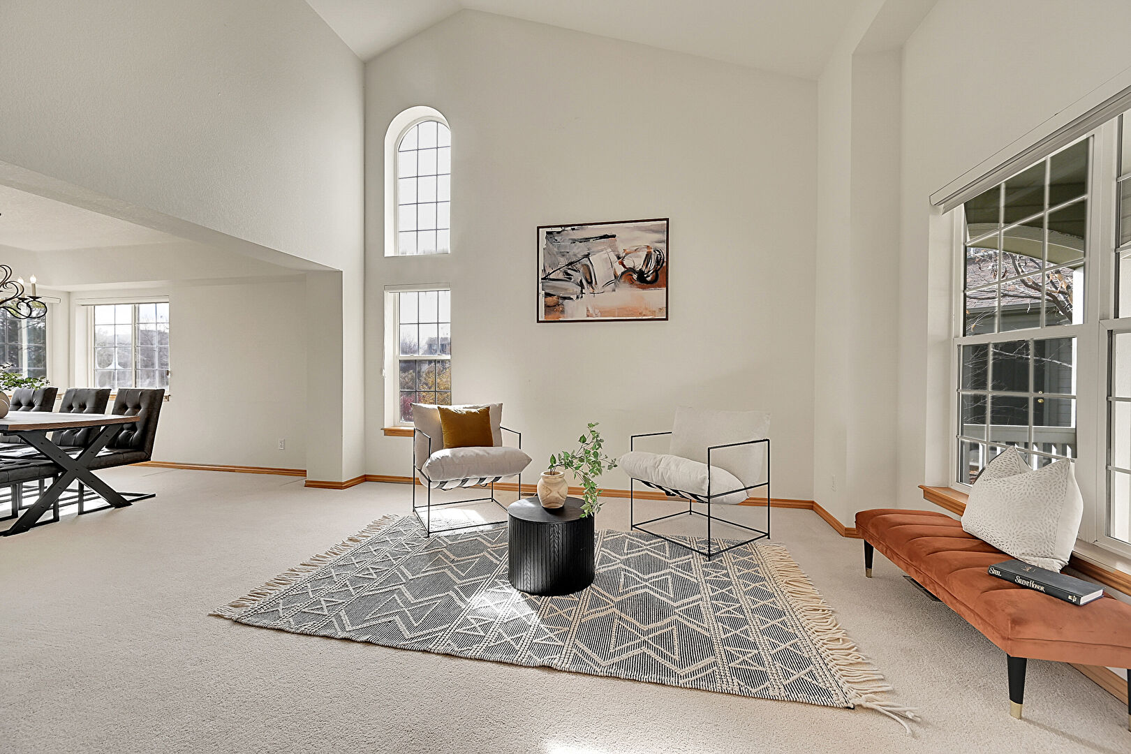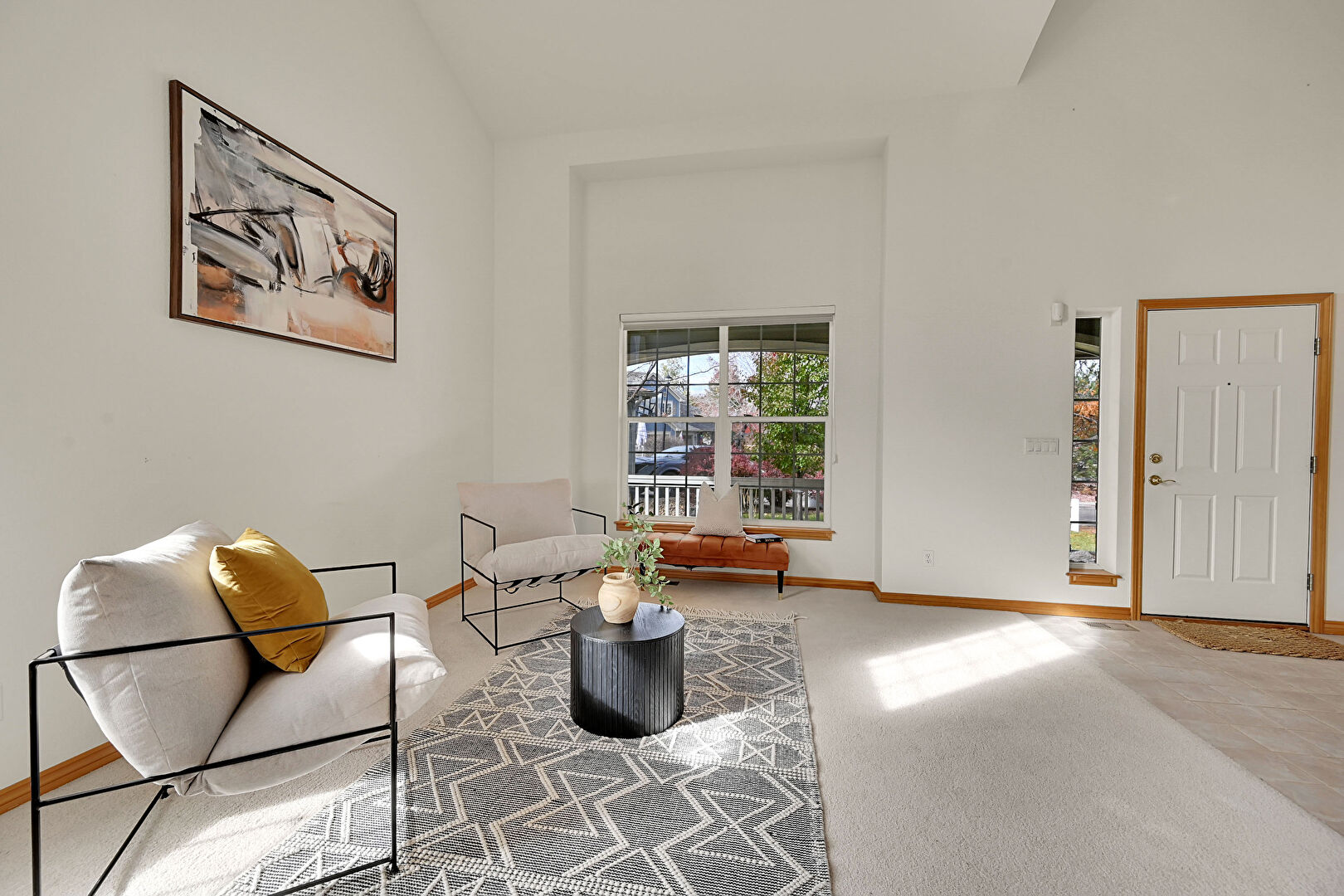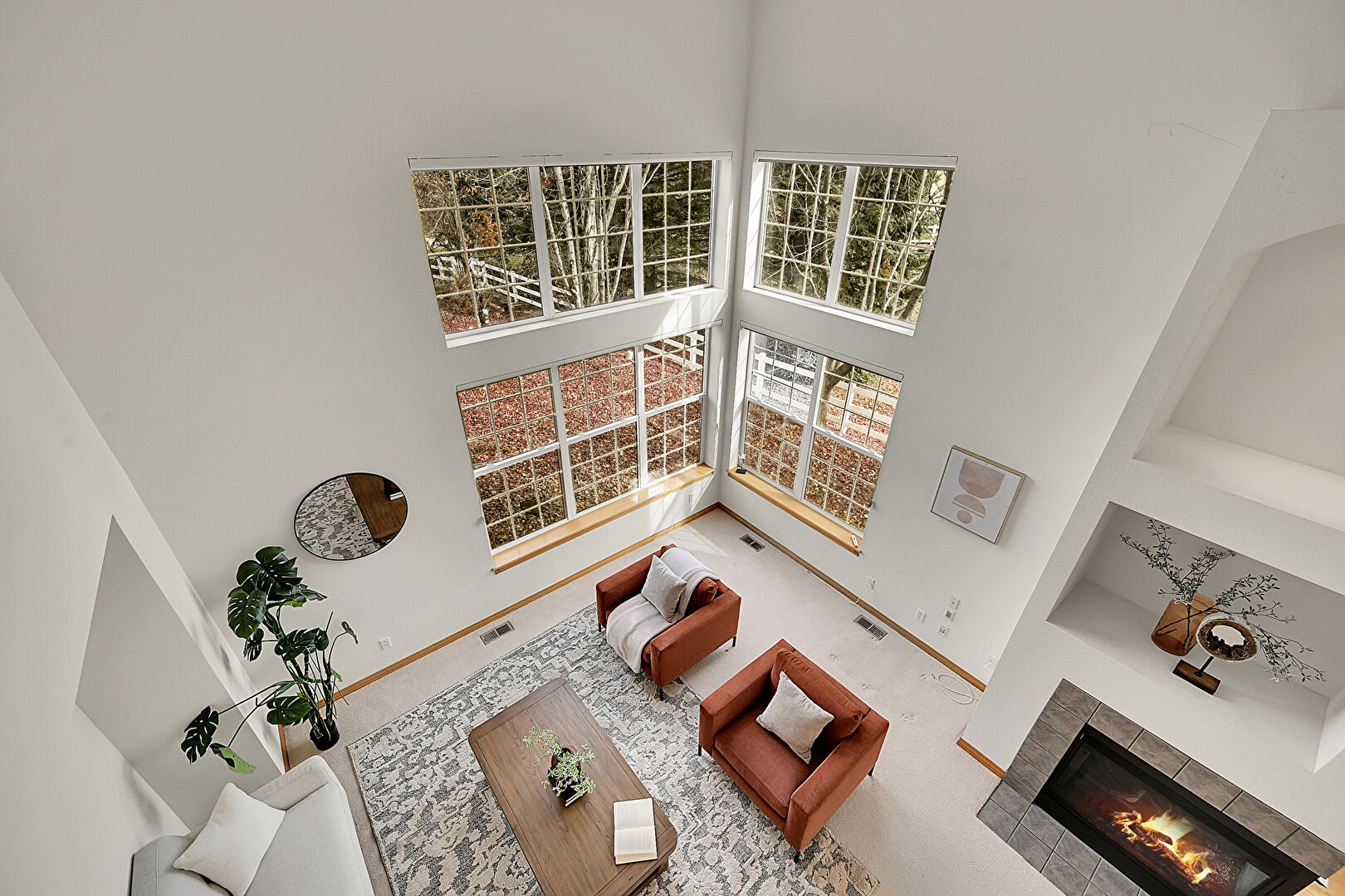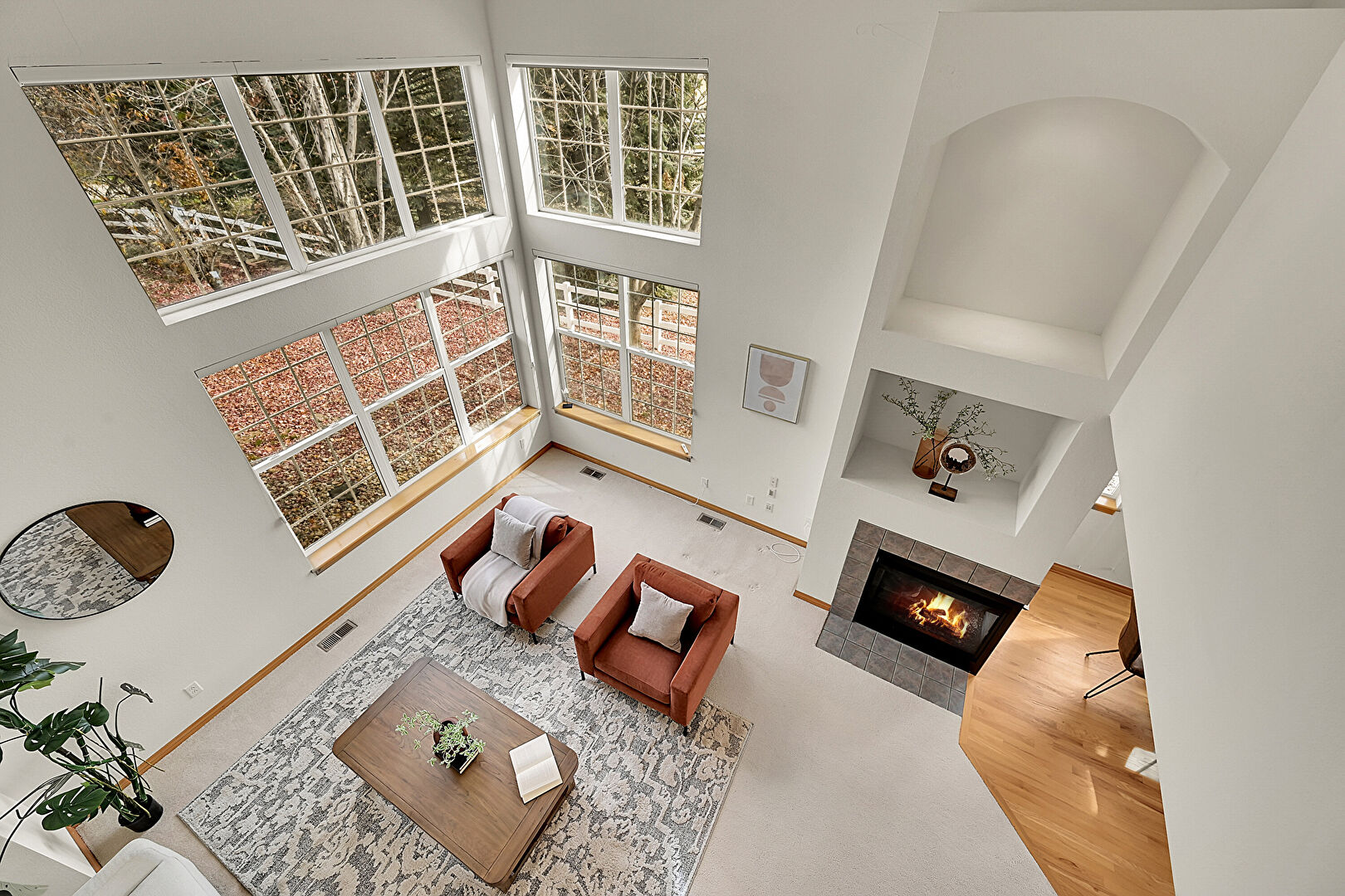 Baseboards Wall, Carpet, Drywall, Fireplace, High Ceiling, Natural Light, Recessed Lighting, Stairs, Tile Floor, Vaulted Ceiling, Vent, High Ceiling, Natural Light, Tile Floor