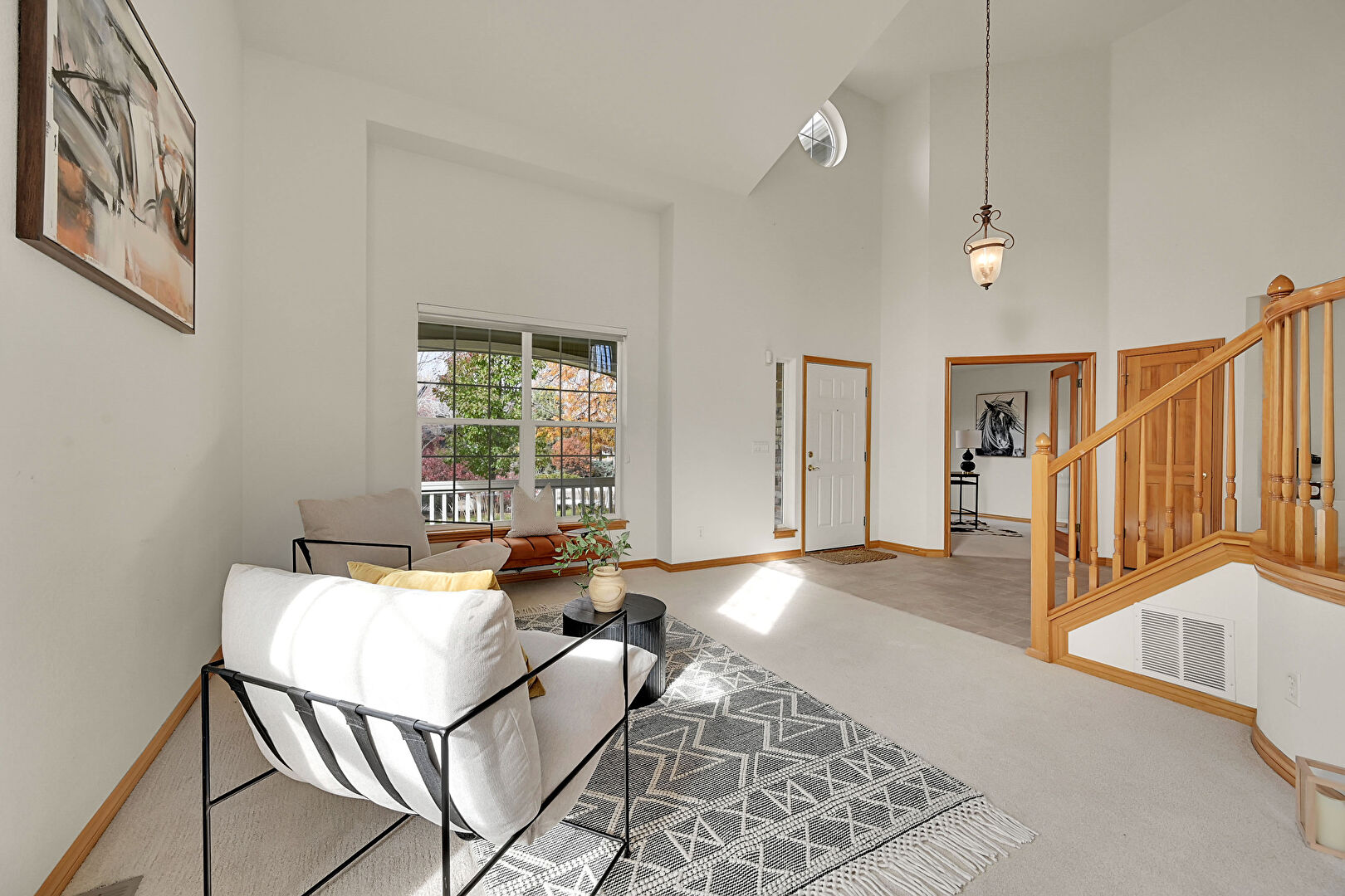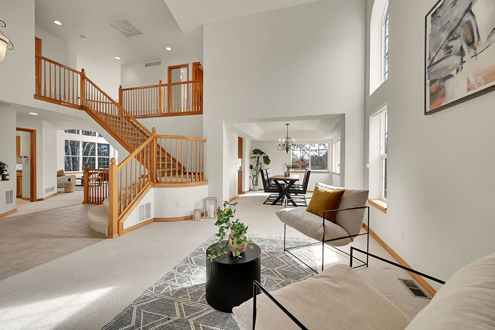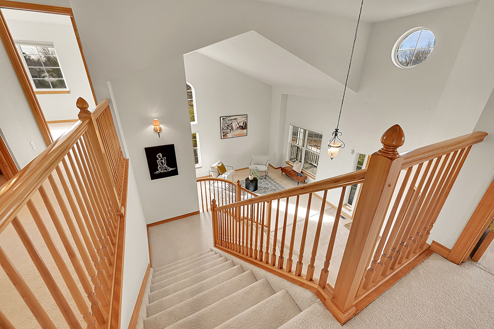 Baseboards Wall, Carpet, Drywall, High Ceiling, Natural Light, Notable Chandelier, Recessed Lighting, Stairs, Upstairs Landing, Vaulted Ceiling, Vent, Baseboards Wall, Carpet, Natural Light, Tile Floor