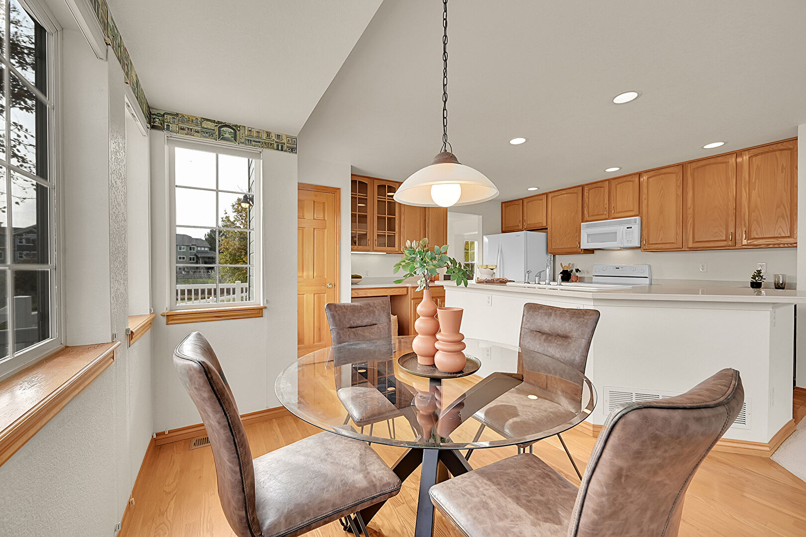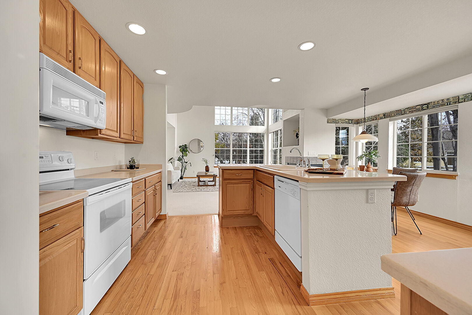Arched Cabinets, Baseboards Wall, Drywall, Glass Insert Cabinets, Kitchen Bar, Kitchen Island, Kitchen Peninsula, Medium Brown Cabinets, Natural Light, Notable Chandelier, Opens To Living Area, Pendant Lighting, Raised Cabinets, Recessed Lighting, Vent, Wood Finish Floor, Arched Cabinets, Baseboards Wall, L Shaped Kitchen, Natural Light