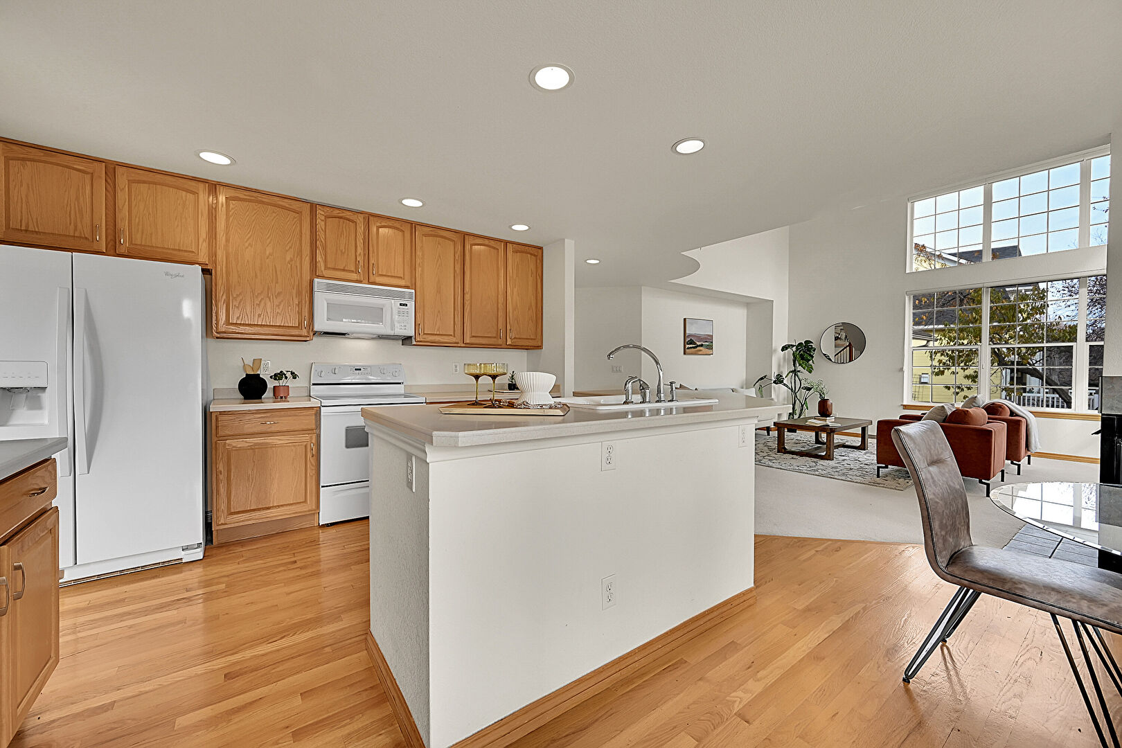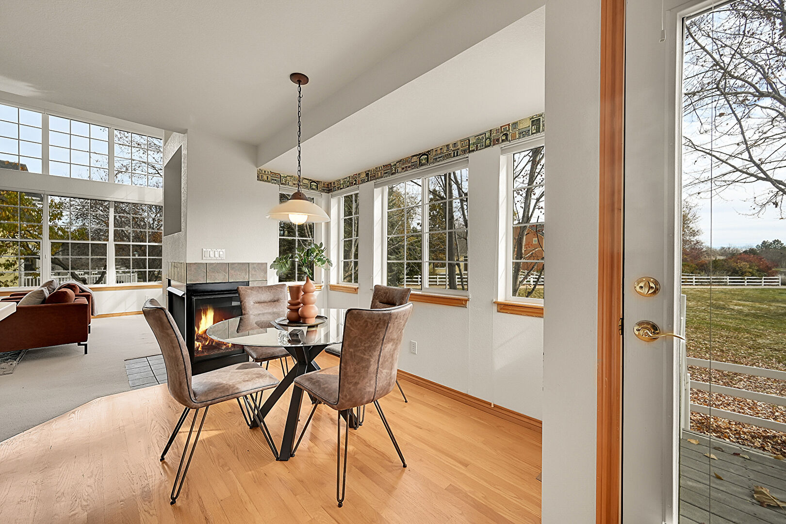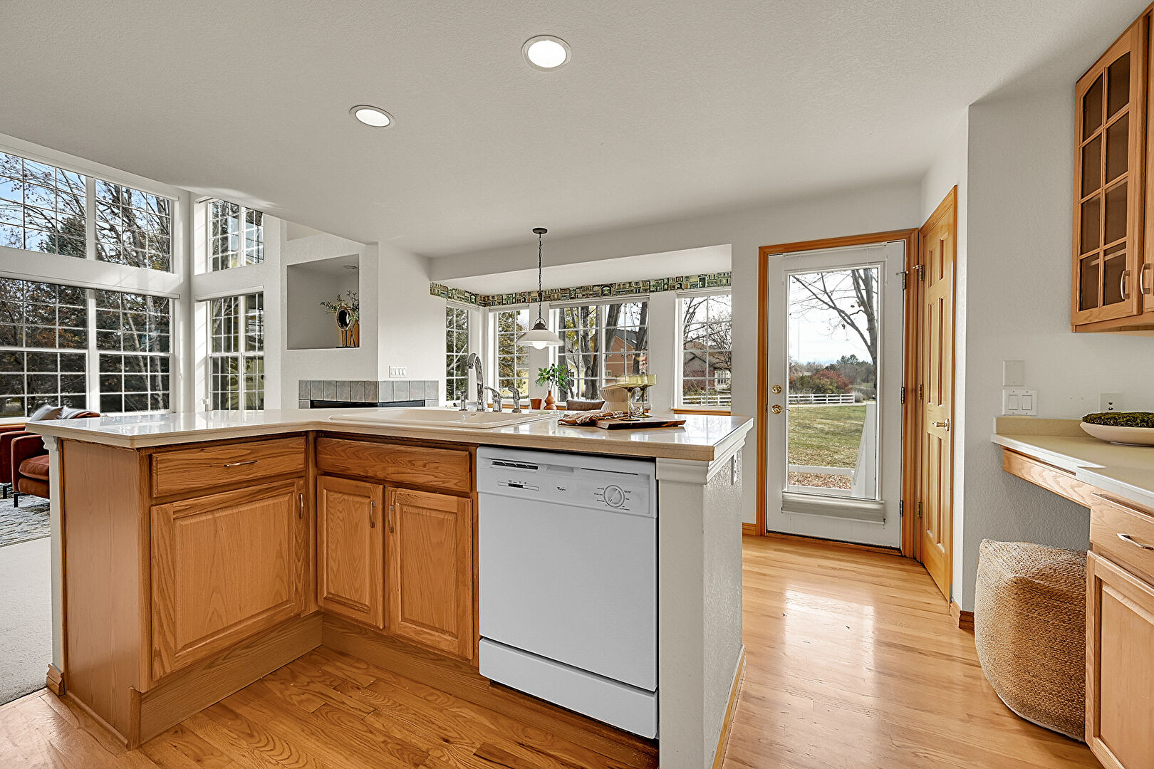Baseboards Wall, Drywall, G Shaped Kitchen, Natural Light, Recessed Lighting, Sunroom, Vent, Wood Finish Floor, Fireplace, Natural Light, Wood Finish Floor