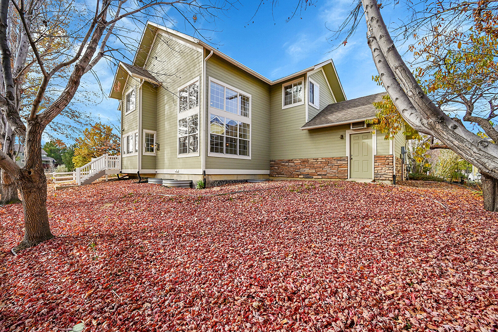 Deck, Downspout, Fence, Gutters, Horizontal Siding, Shingle Roof, Stone Siding, Concrete Foundation, Deck, Horizontal Siding