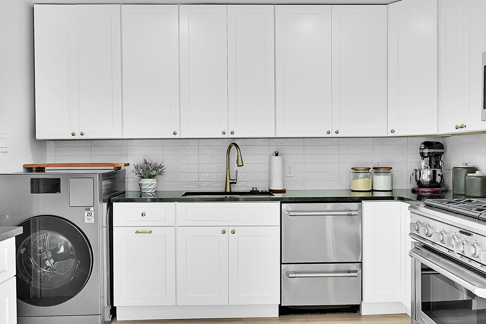 Baseboards Wall, Drywall, Laundry, Natural Light, Recessed Lighting, Shaker Cabinets, Stone Countertops, Vent, Washer Dryer, Wood Finish Floor, Laundry, Shaker Cabinets, U Shaped Kitchen, Wood Finish Floor