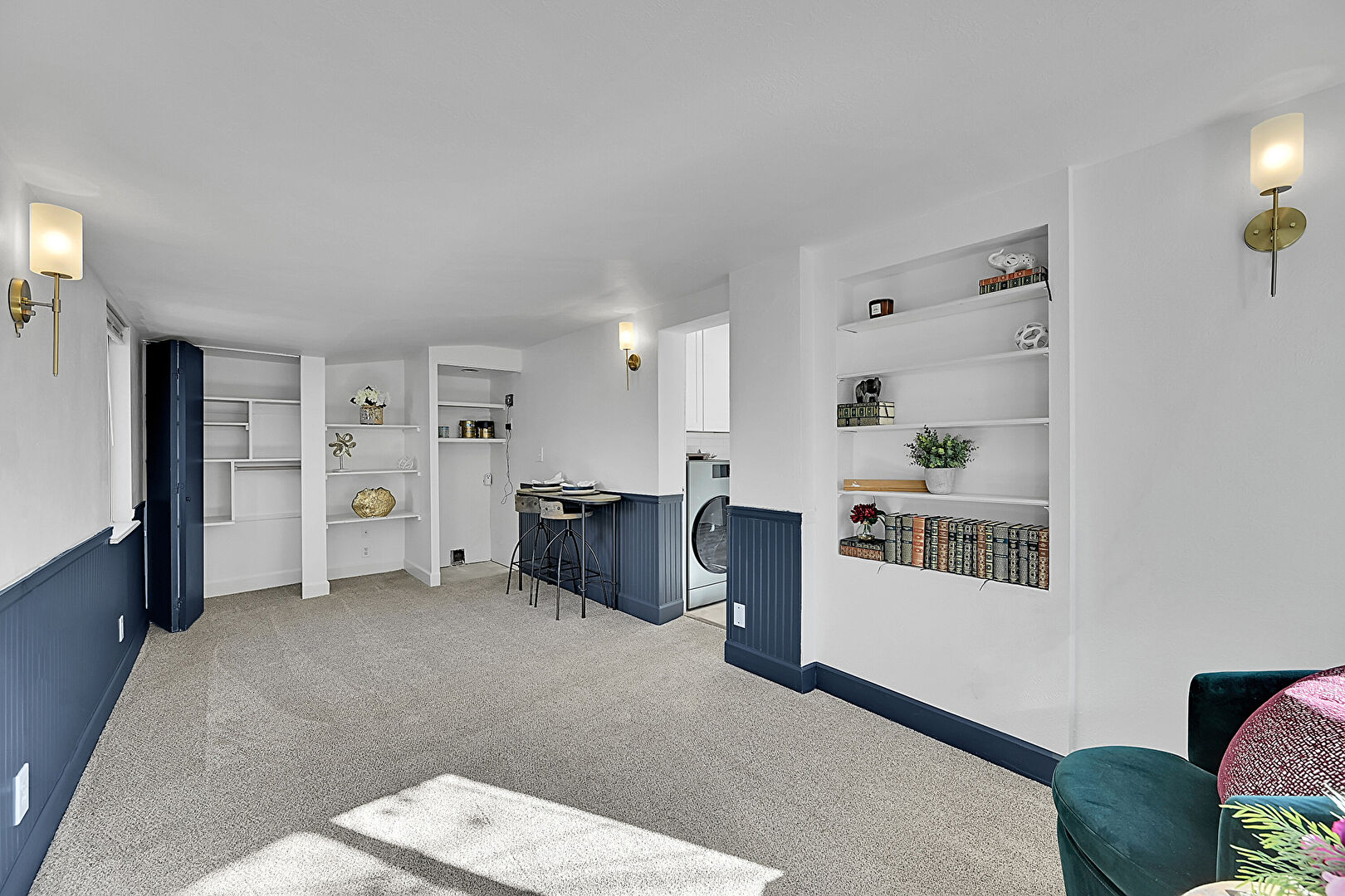 Baseboards Wall, Built In Shelves, Carpet, Drywall, Laundry, Natural Light, Sunroom, Vaulted Ceiling, Wainscot Wall, Wood Wall, Baseboards Wall, Washer Dryer