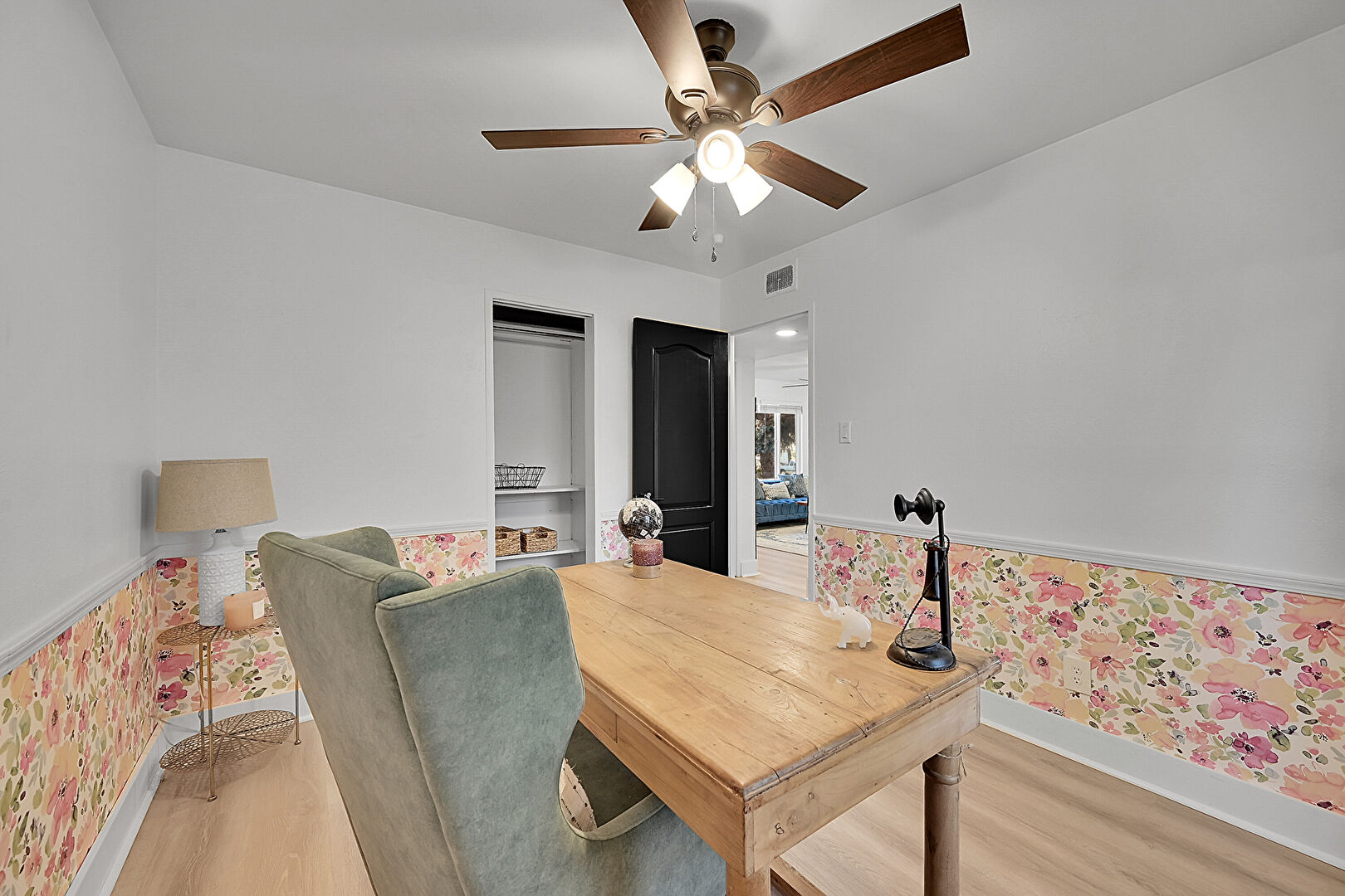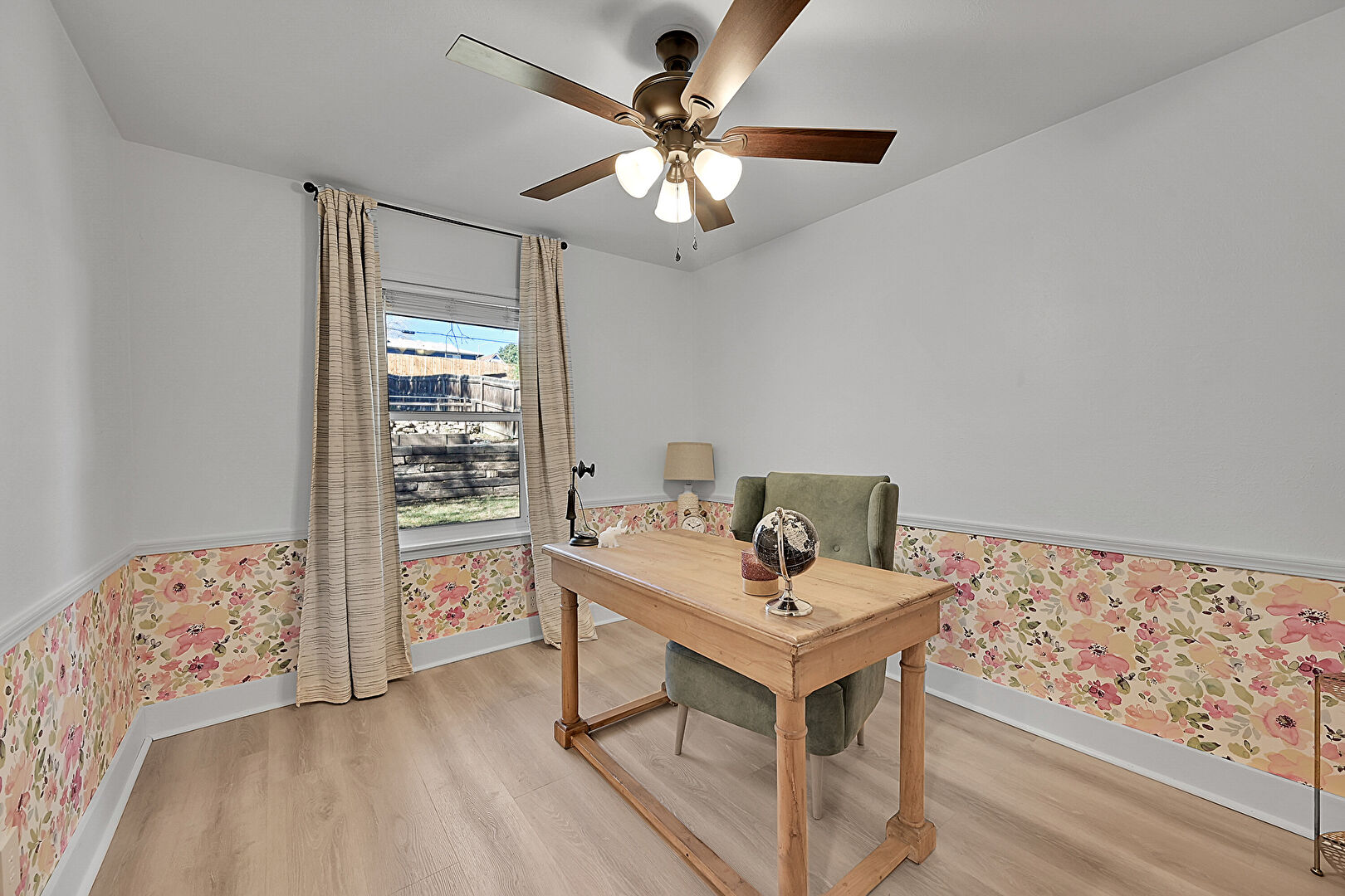 Baseboards Wall, Ceiling Fan, Drywall, Natural Light, Office Area, Vent, Wainscot Wall, Wallpaper Wall, Wood Finish Floor, Office Area, Wood Finish Floor