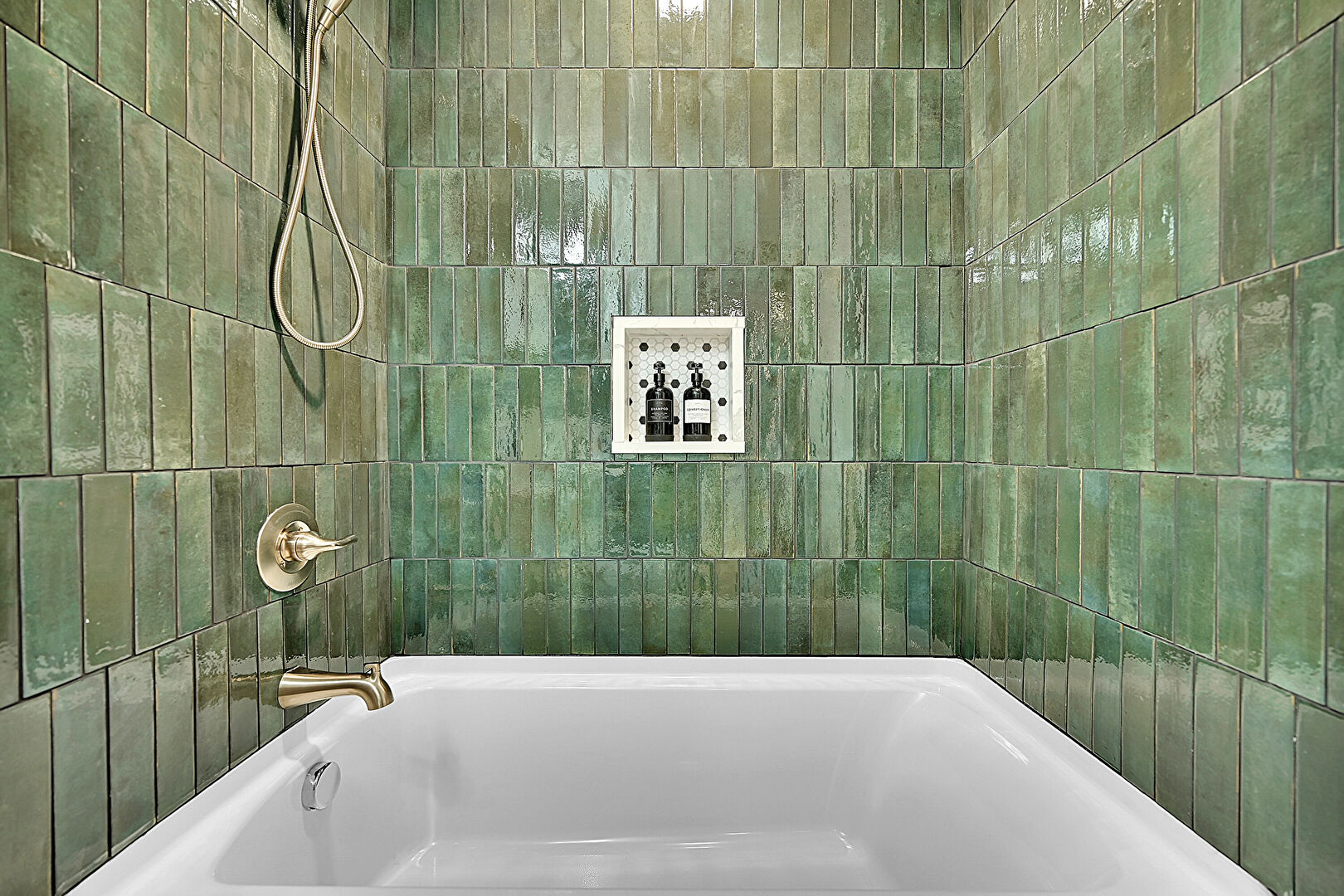 Full Bathroom, Tile Wall, Vanity, Combined Bath Shower, Shaker Cabinets, Textured Wall