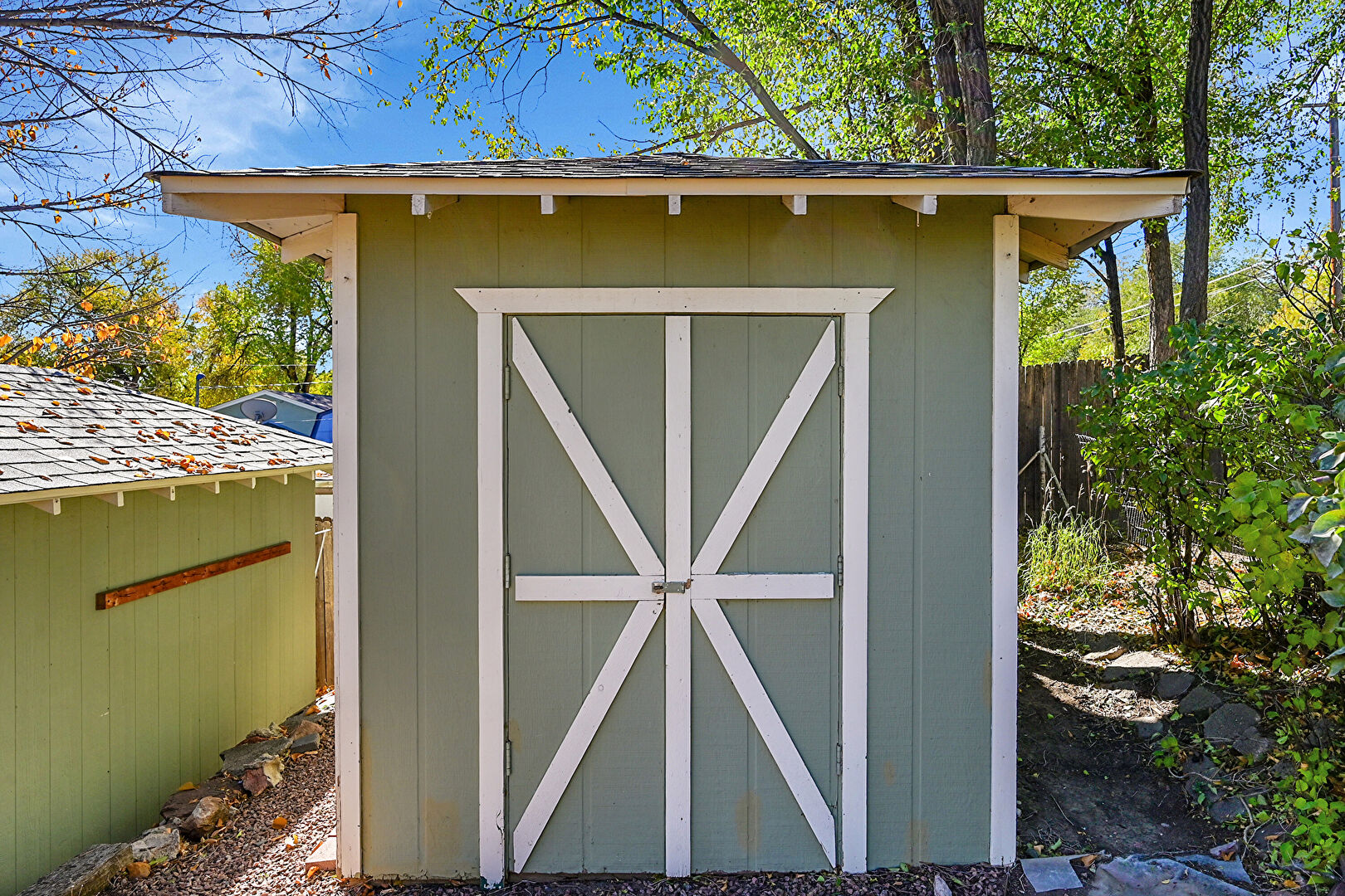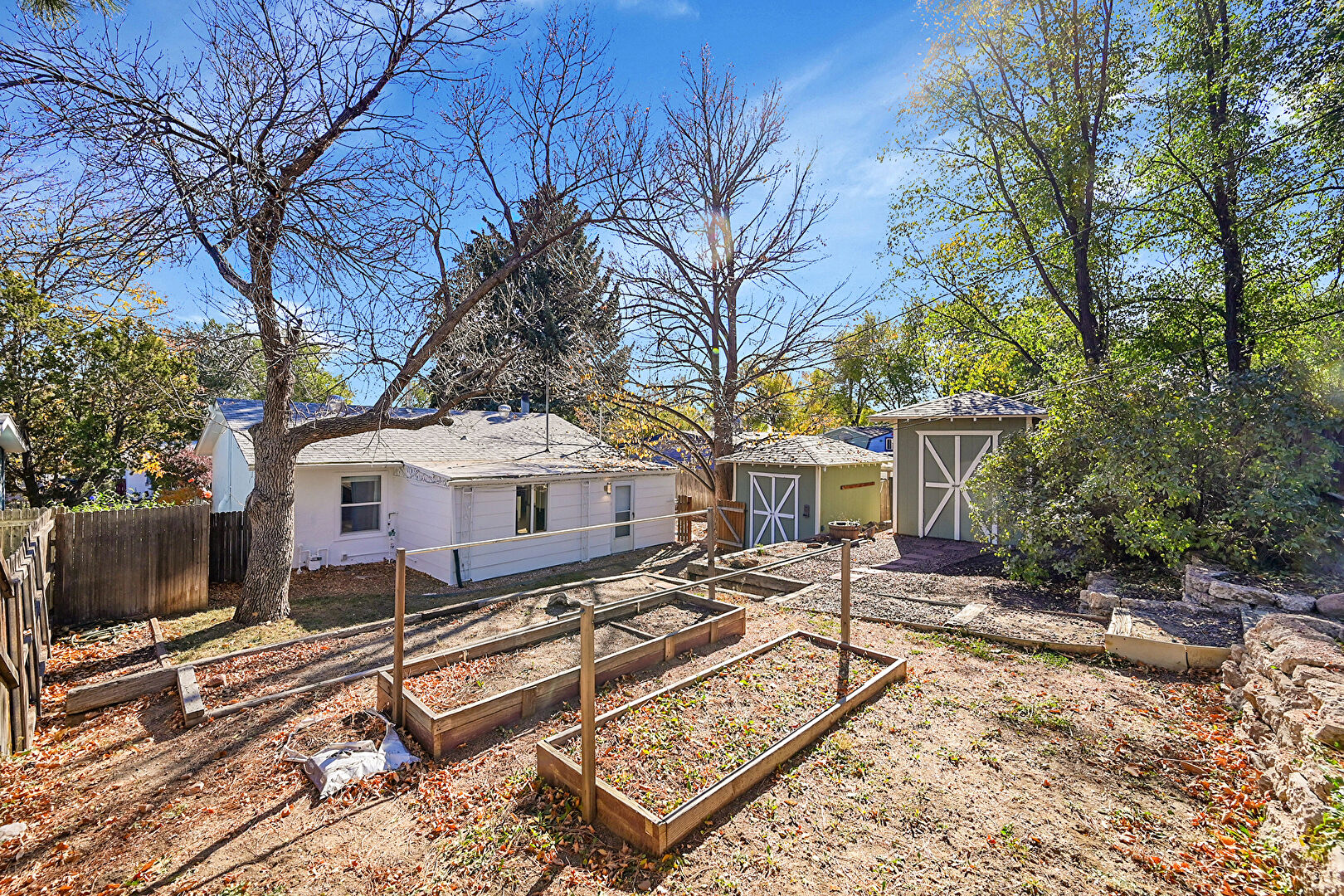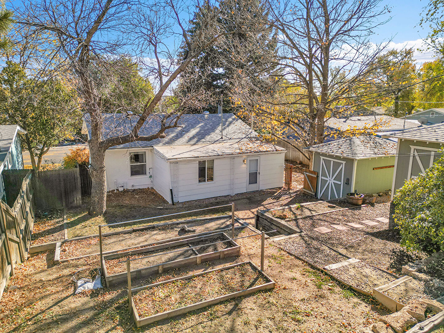 Fence, Fire Pit, Garden, Gutters, Horizontal Siding, Lawn, Outdoor Structure, Shed, Shingle Roof, Stucco Siding, Downspout, Fence, Lawn, Stucco Siding