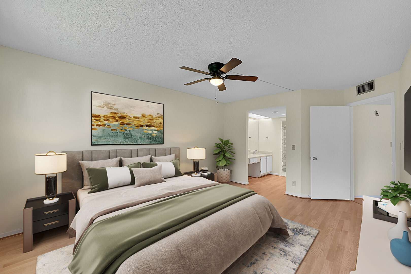 Baseboards Wall,  Ceiling Fan,  Drywall,  Ensuite Bathroom,  Natural Light,  Textured Ceiling,  Vent,  Wood Finish Floor, Baseboards Wall, Ceiling Fan, Drywall, Textured Ceiling