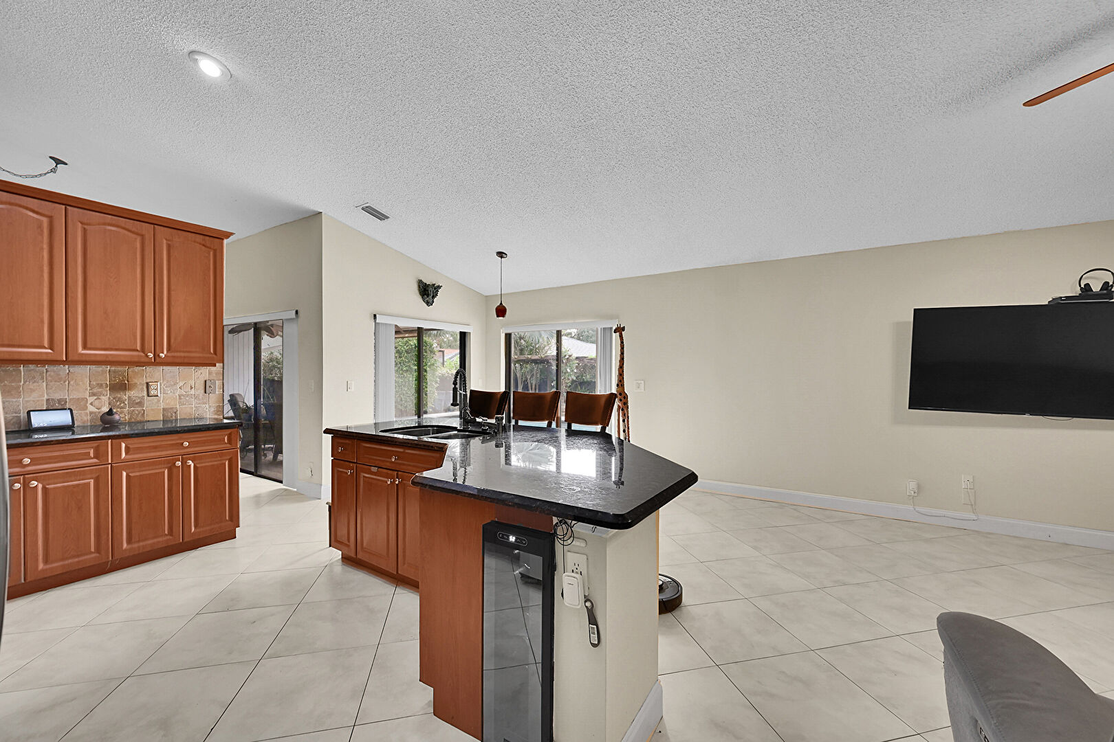 Arched Cabinets, Baseboards Wall, Ceiling Fan, Crown Molding Cabinets, Drywall, French Doors, Kitchen Bar, Kitchen Island, L Shaped Kitchen, Medium Brown Cabinets, Natural Light, Opens To Living Area, Pendant Lighting, Raised Cabinets, Recessed Lighting, Stone Countertops, Textured Ceiling, Tile Floor, Vaulted Ceiling, Vent, Wine Cooler, Arched Cabinets, Kitchen Bar, Stone Countertops, Vaulted Ceiling