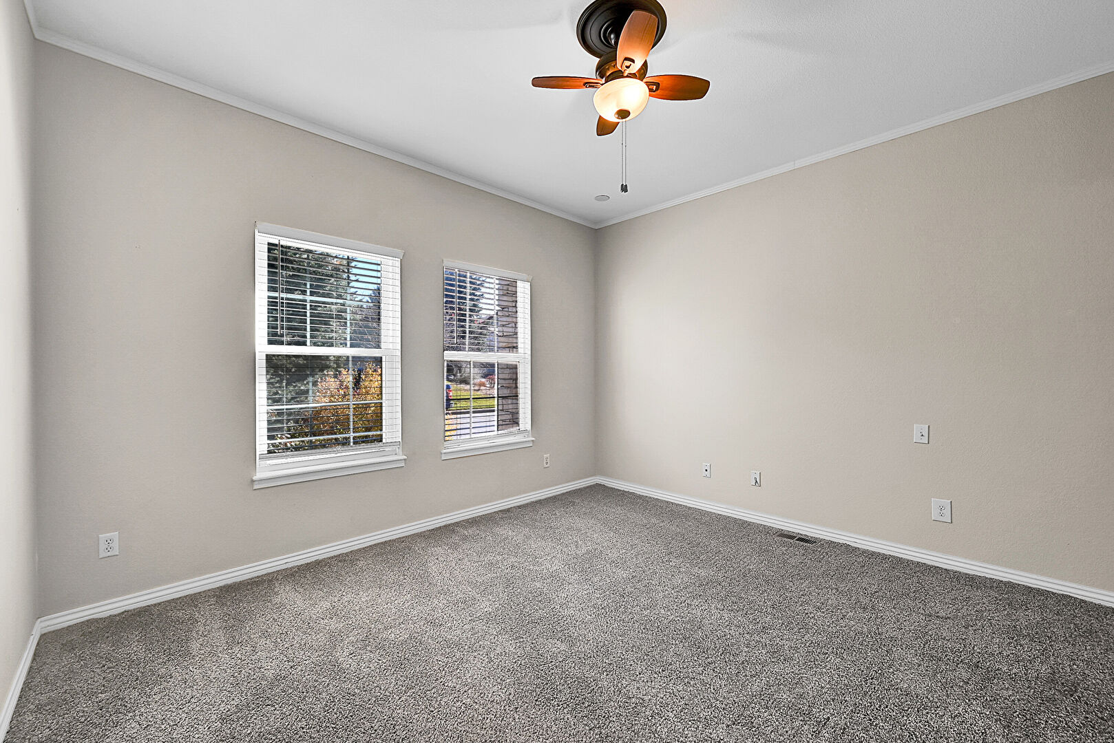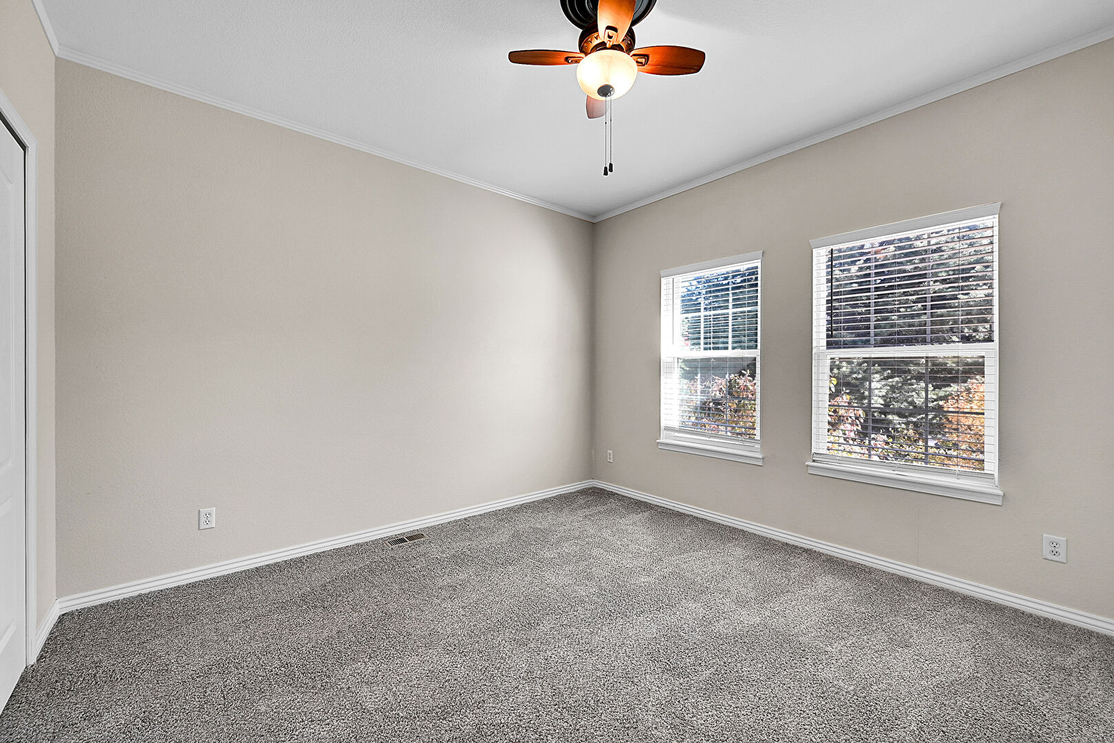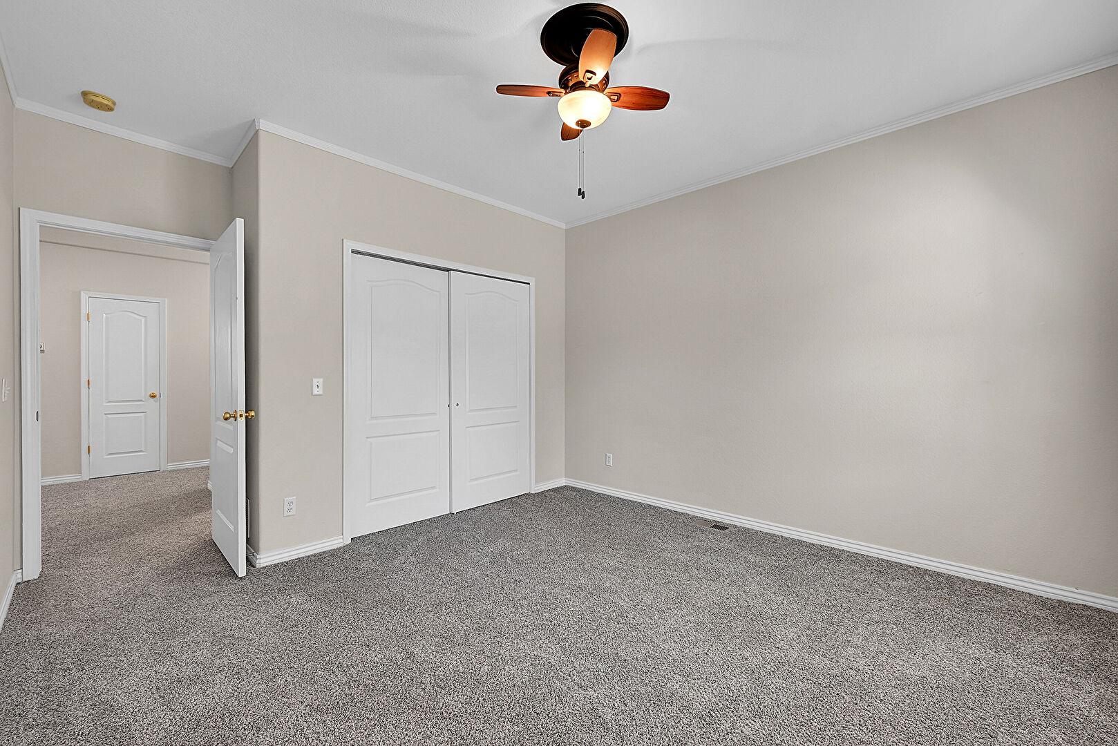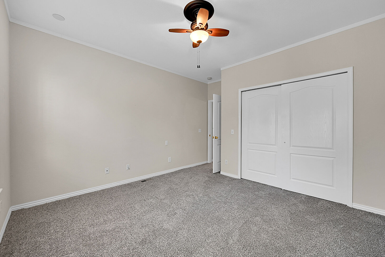 Baseboards Wall, Carpet, Ceiling Fan, Closet, Crown Molding, Drywall, Natural Light, Vent, Ceiling Fan, Crown Molding, Drywall