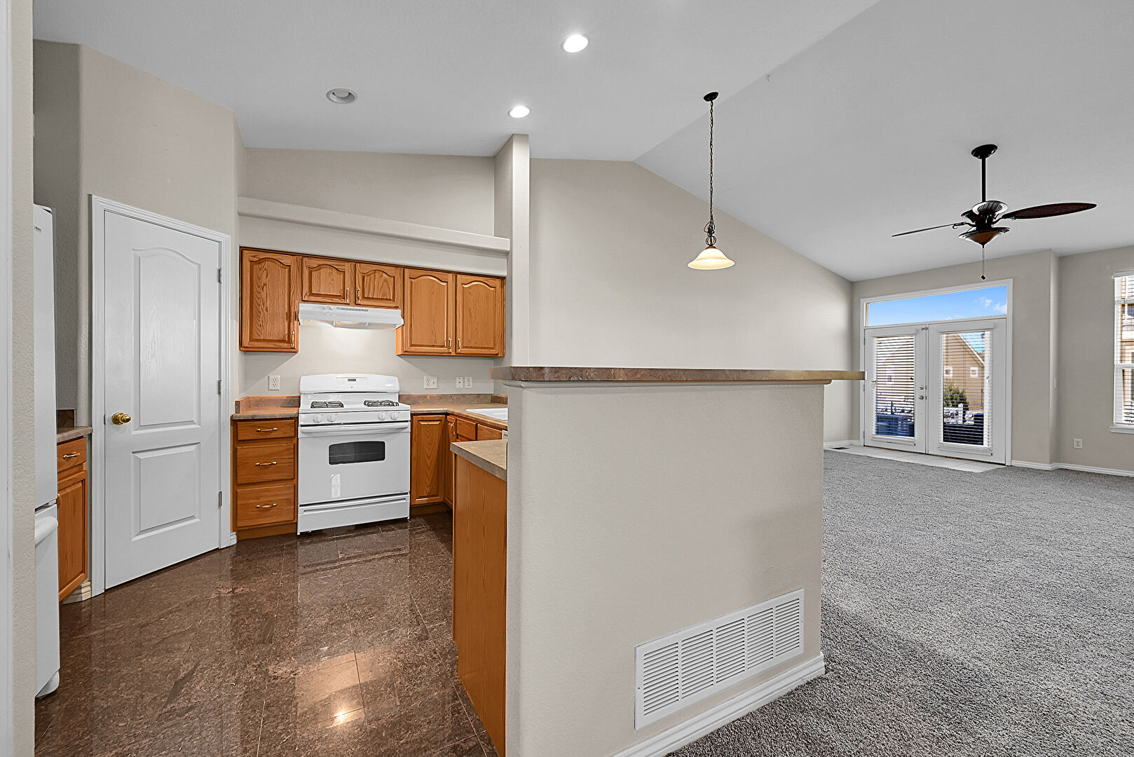 Arched Cabinets, Baseboards Wall, Carpet, Ceiling Fan, Drywall, French Doors, Granite Finish Floor, High Ceiling, Kitchen Peninsula, Medium Brown Cabinets, Natural Light, Opens To Living Area, Pendant Lighting, Raised Cabinets, Recessed Lighting, Vaulted Ceiling, Vent, Drywall, Natural Light, Opens To Living Area, Vaulted Ceiling