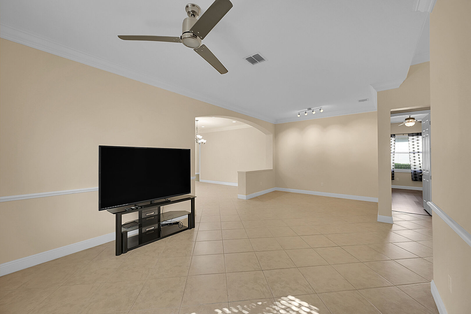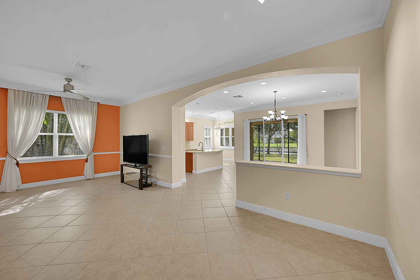 Arched Walkways, Baseboards Wall, Ceiling Fan, Crown Molding, Drywall, Natural Light, Notable Chandelier, Recessed Lighting, Tile Floor, Vent, Baseboards Wall, Natural Light