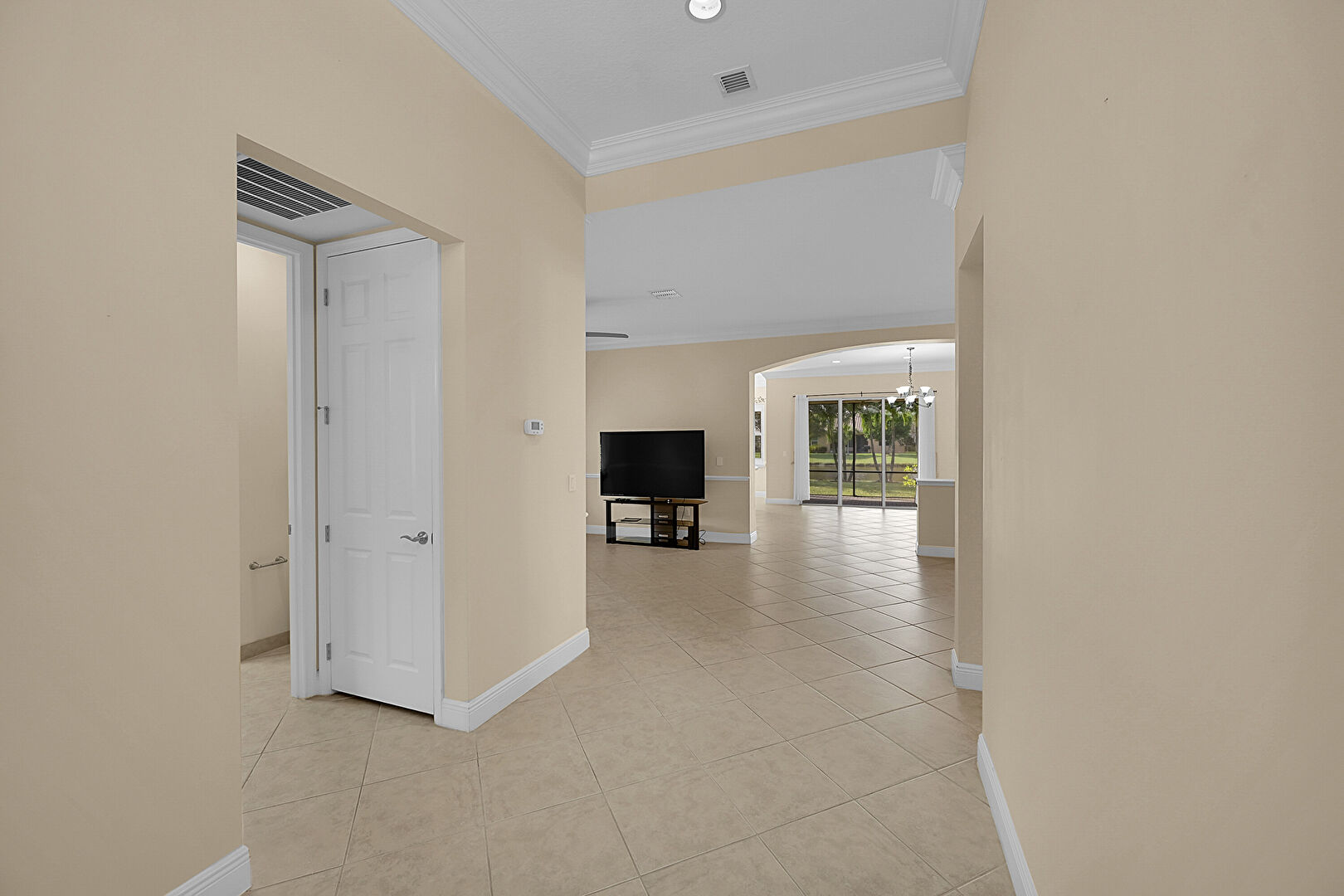 Arched Walkways, Crown Molding, Drywall, Natural Light, Notable Chandelier, Tile Floor, Vent, Baseboards Wall