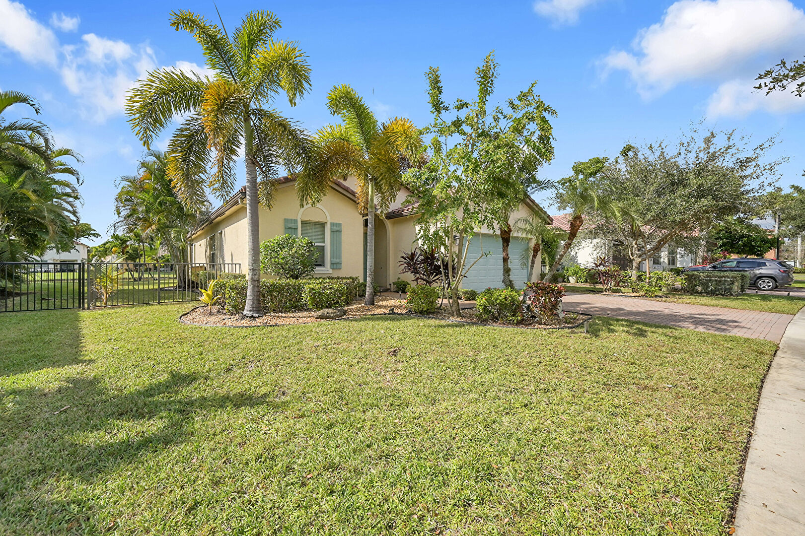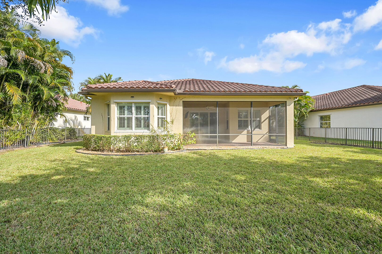 Downspout, Driveway, Fence, Gutters, Lawn, Stucco Siding, Tile Roof, Fence, Stucco Siding