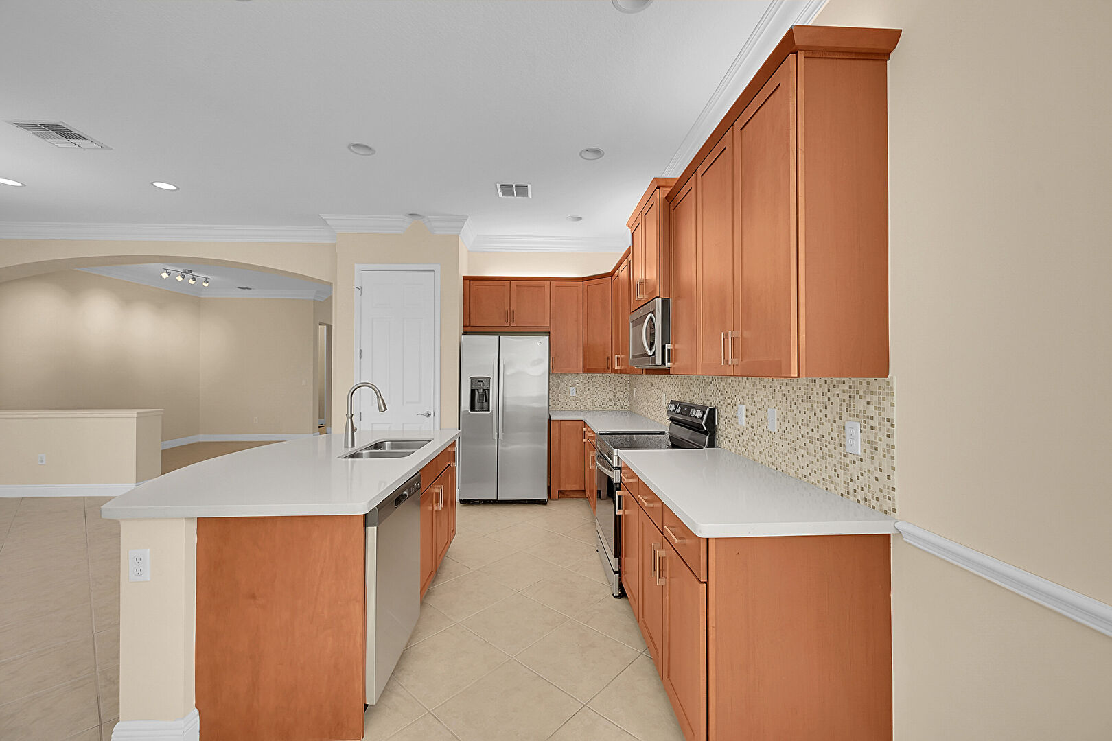 Arched Walkways, Baseboards Wall, Crown Molding, Crown Molding Cabinets, Drywall, Kitchen Island, L Shaped Kitchen, Medium Brown Cabinets, Natural Light, Notable Chandelier, Opens To Living Area, Pendant Lighting, Recessed Lighting, Shaker Cabinets, Stone Countertops, Tile Floor, Vent, Crown Molding Cabinets, Drywall, Stone Countertops, Tile Floor
