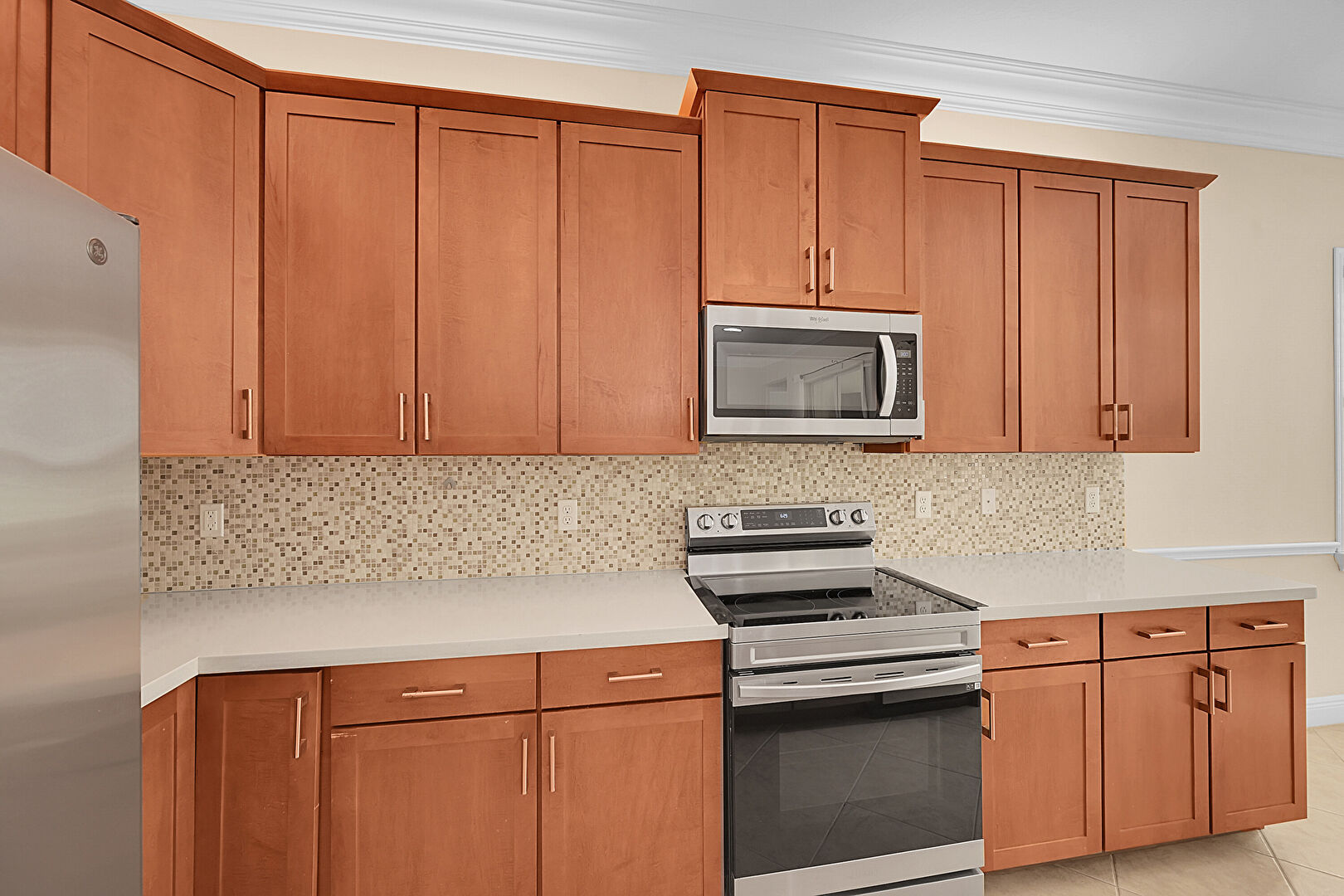 Arched Walkways, Baseboards Wall, Crown Molding, Crown Molding Cabinets, Drywall, Kitchen Island, L Shaped Kitchen, Medium Brown Cabinets, Natural Light, Notable Chandelier, Opens To Living Area, Pendant Lighting, Recessed Lighting, Shaker Cabinets, Stone Countertops, Tile Floor, Vent, Medium Brown Cabinets, Stone Countertops