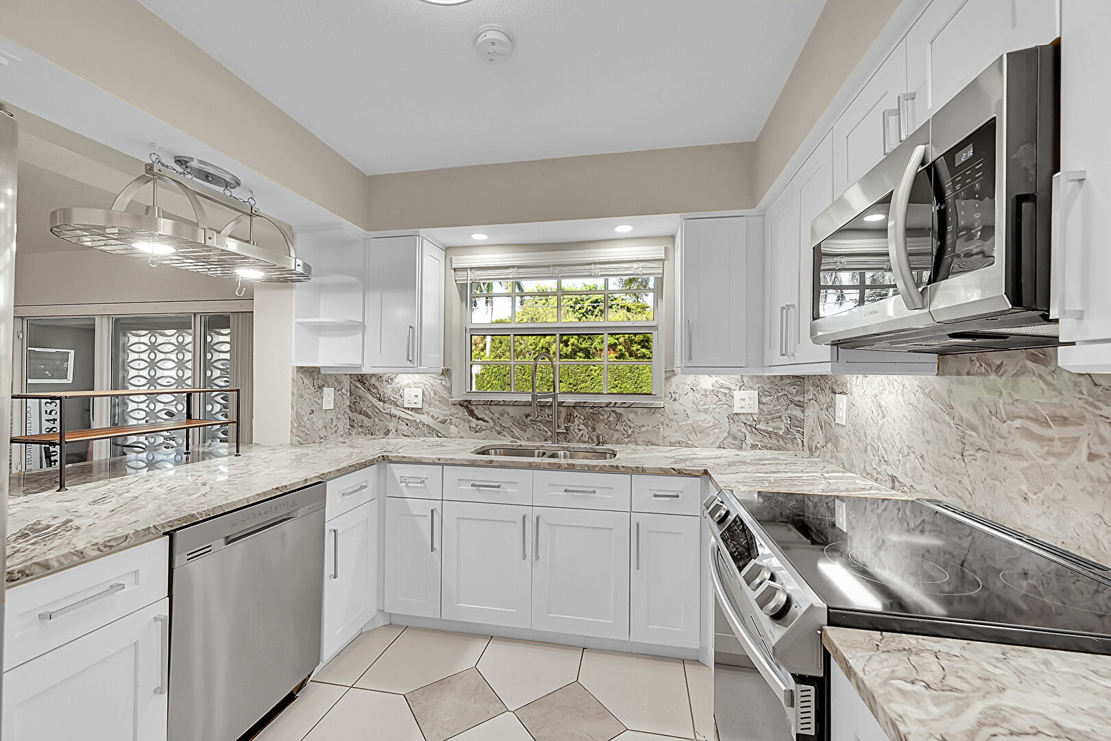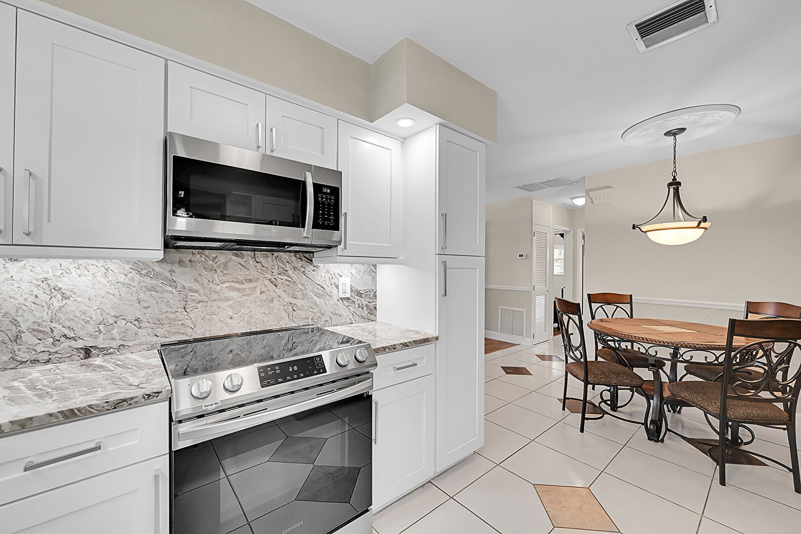Baseboards Wall, Kitchen Peninsula, Natural Light, Open Shelves, Pendant Lighting, Recessed Lighting, Shaker Cabinets, Smoke Carbon Monoxide Detector, Stone Countertops, Tile Floor, Vent, Drywall, Recessed Lighting
