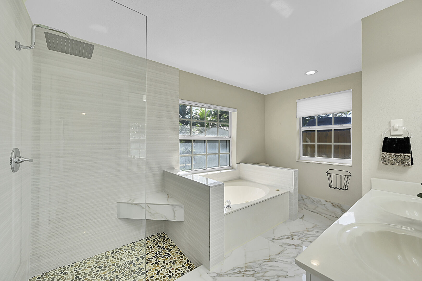 Bidet, Closet, Combined Bath Shower, Double Vanity, Drywall, Full Bathroom, Marble Finish Floor, Natural Light, Recessed Lighting, Textured Wall, Vent, Baseboards Wall, Drywall, Vanity