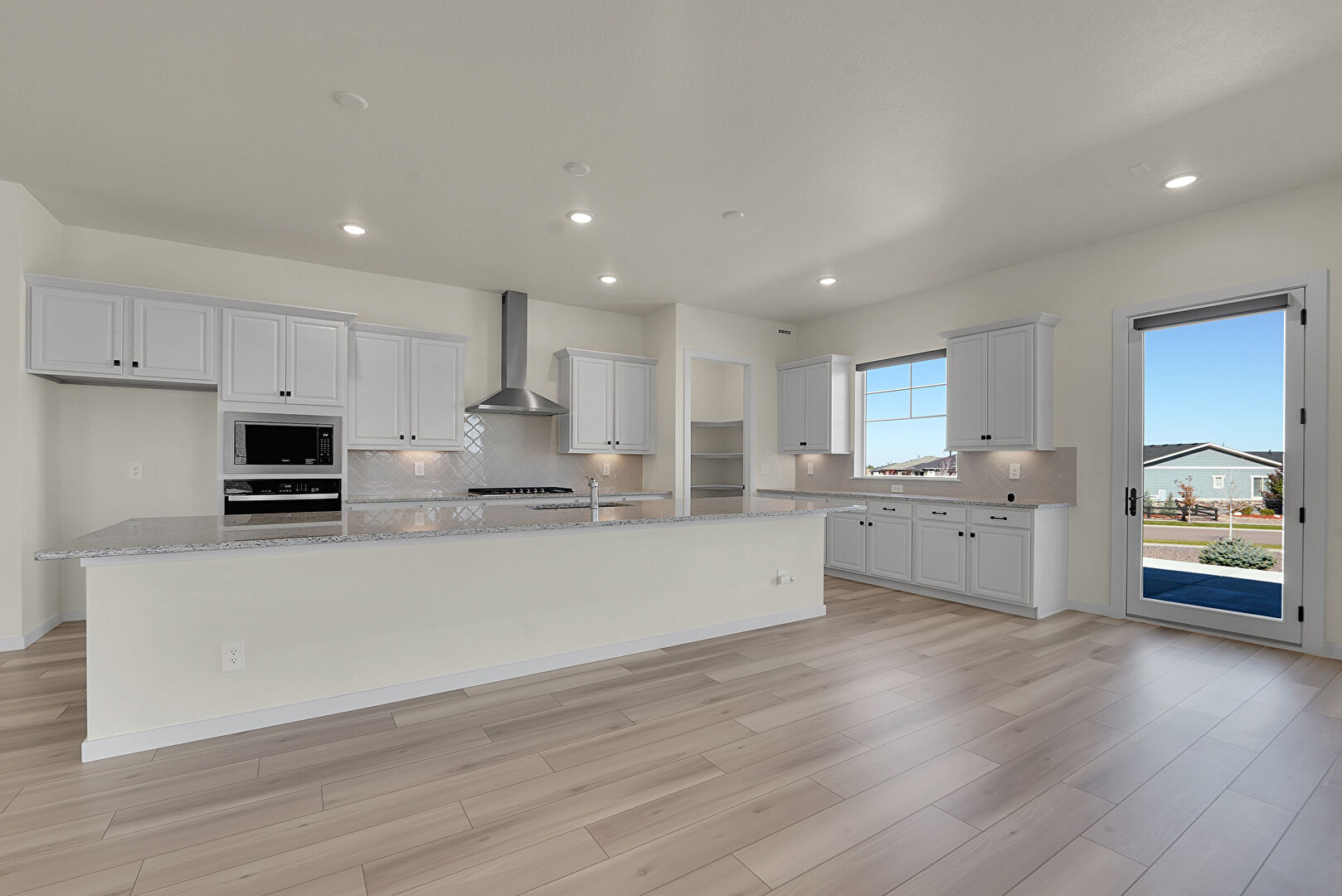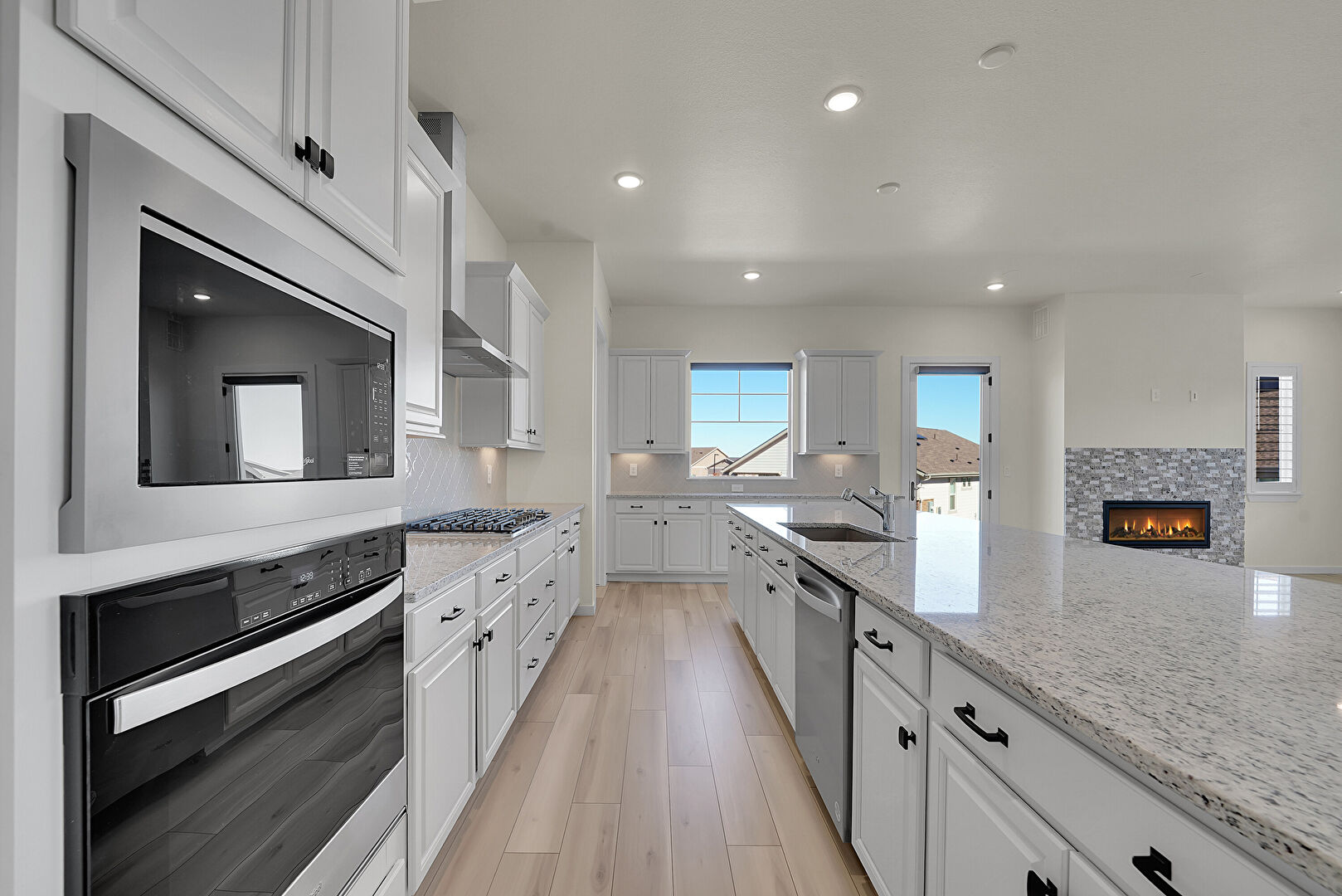 Baseboards Wall, Crown Molding Cabinets, Drywall, Fireplace, Kitchen Island, L Shaped Kitchen, Natural Light, Opens To Living Area, Raised Cabinets, Recessed Lighting, Shaker Cabinets, Stone Countertops, Wood Finish Floor, Baseboards Wall, Drywall, Raised Cabinets, Recessed Lighting, Stone Countertops