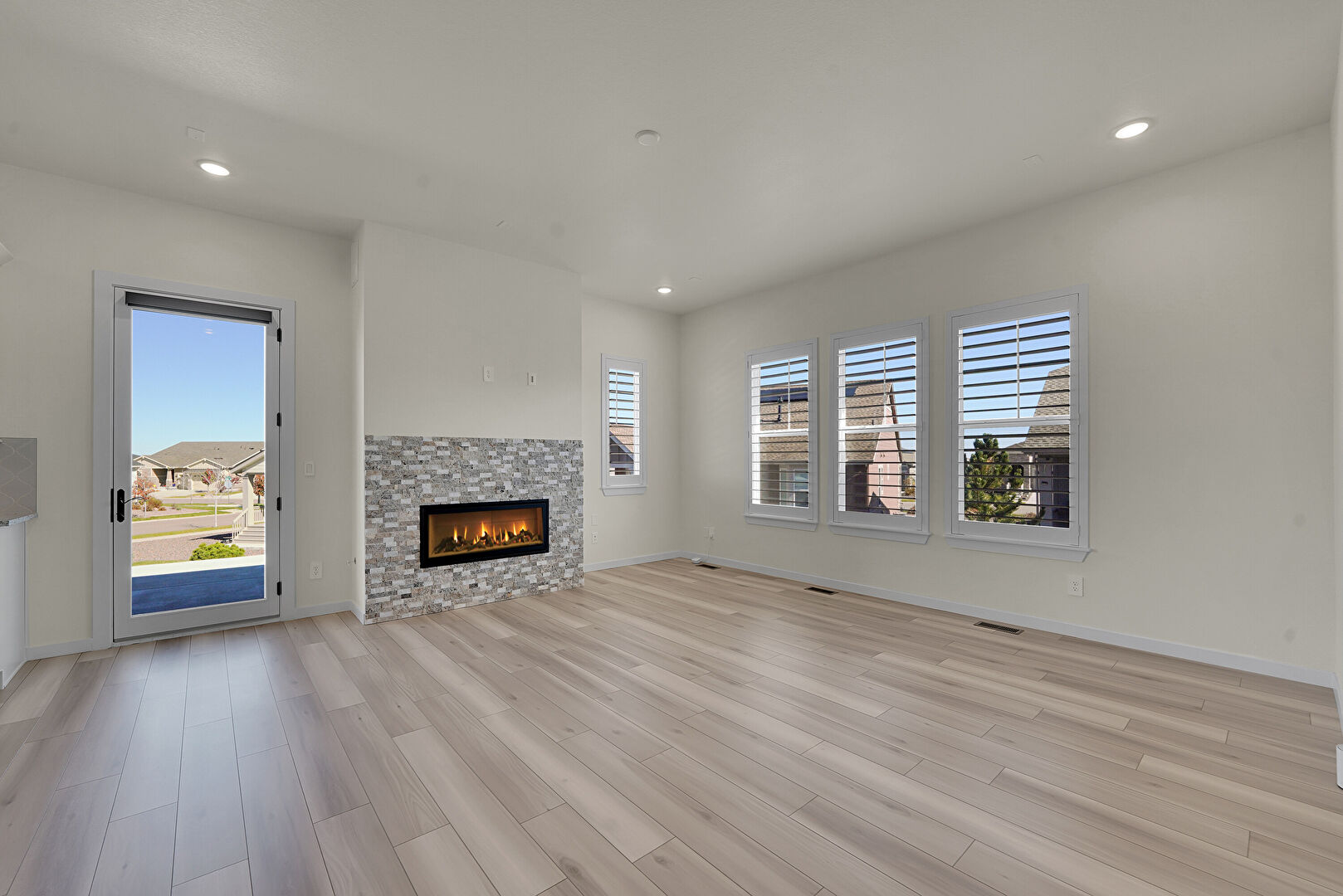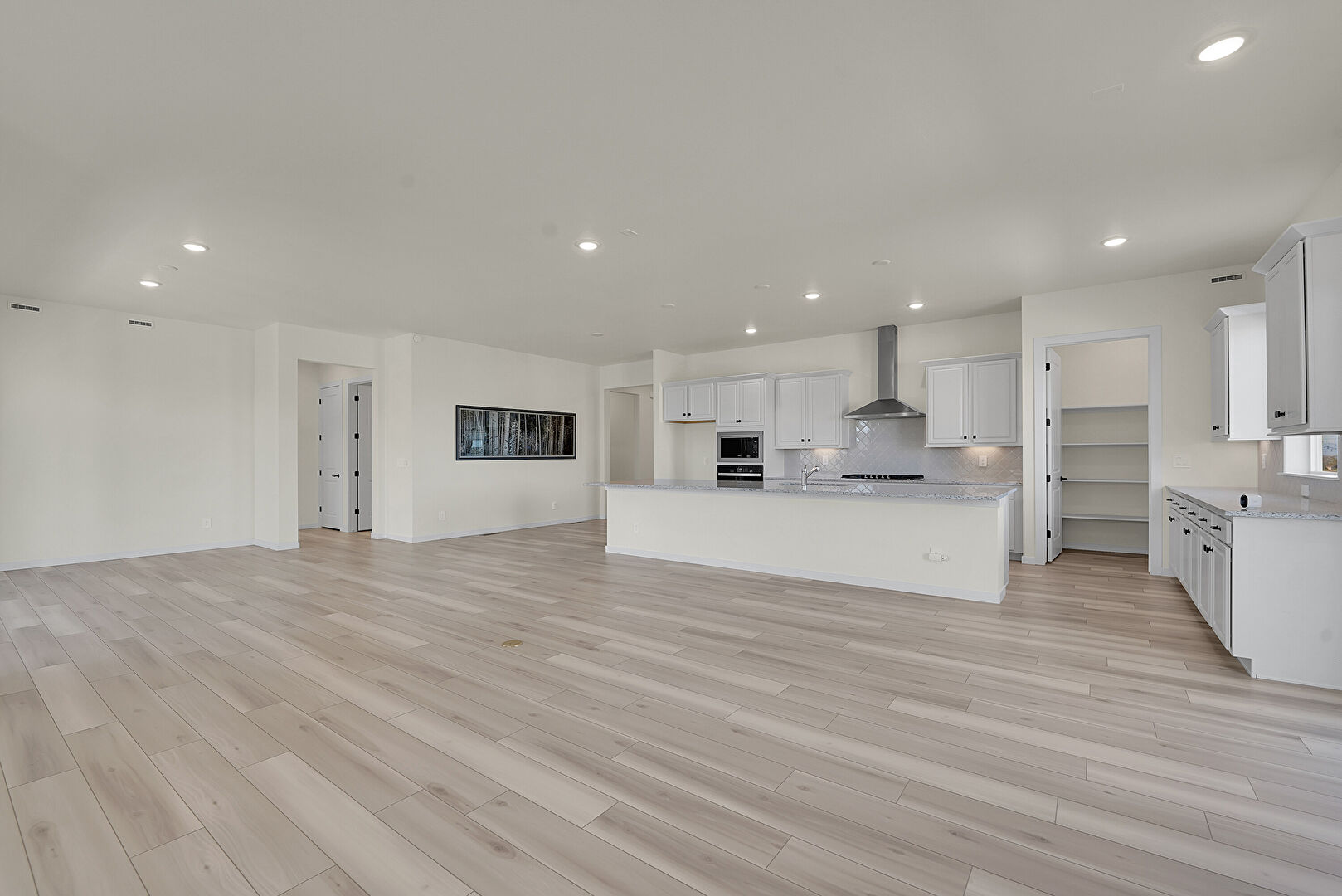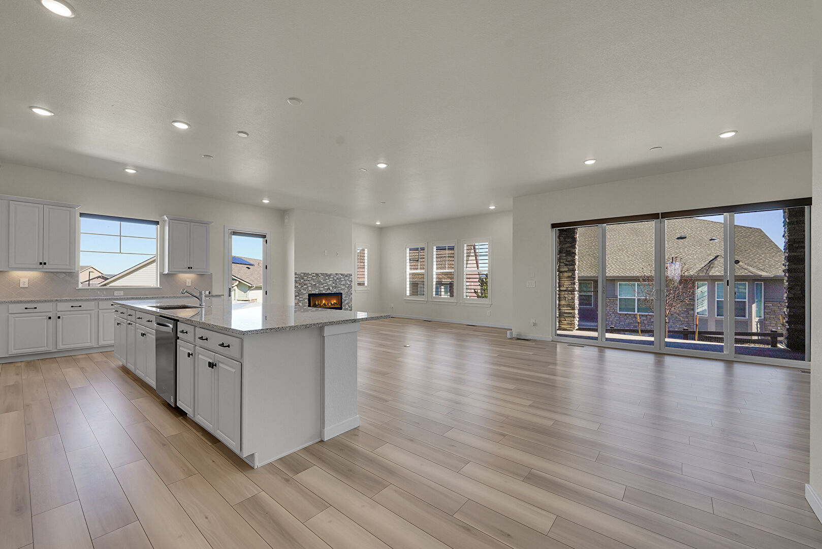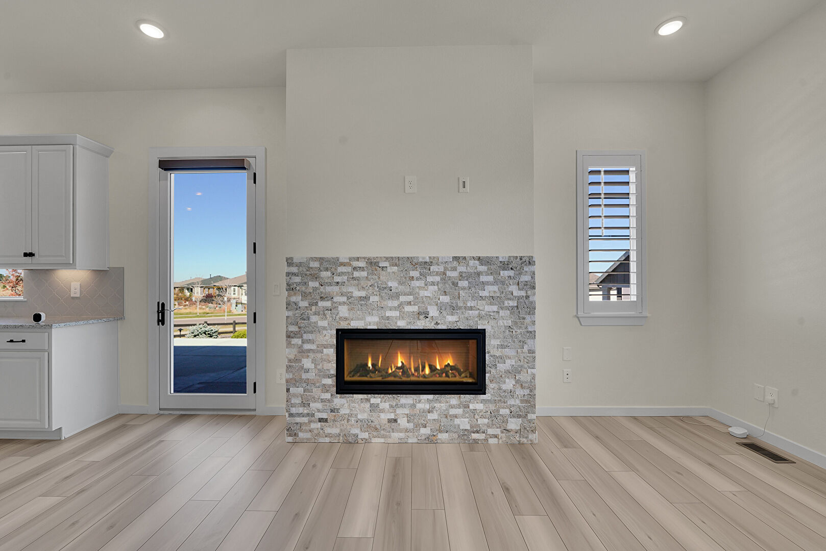 Baseboards Wall, Drywall, Fireplace, L Shaped Kitchen, Natural Light, Recessed Lighting, Vent, Wood Finish Floor, Fireplace, Natural Light, Recessed Lighting