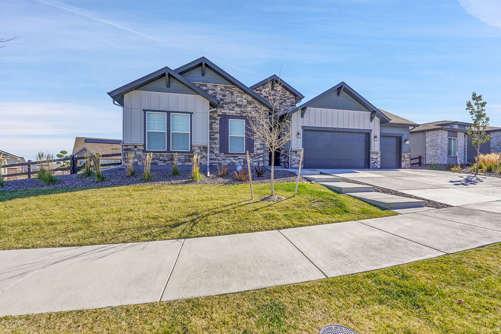 Board Batten Siding, Downspout, Driveway, Fence, Gutters, Horizontal Siding, Lawn, Residential View, Shingle Roof, Stone Siding, Stoop, Vertical Siding, Board Batten Siding, Driveway, Fence, Lawn