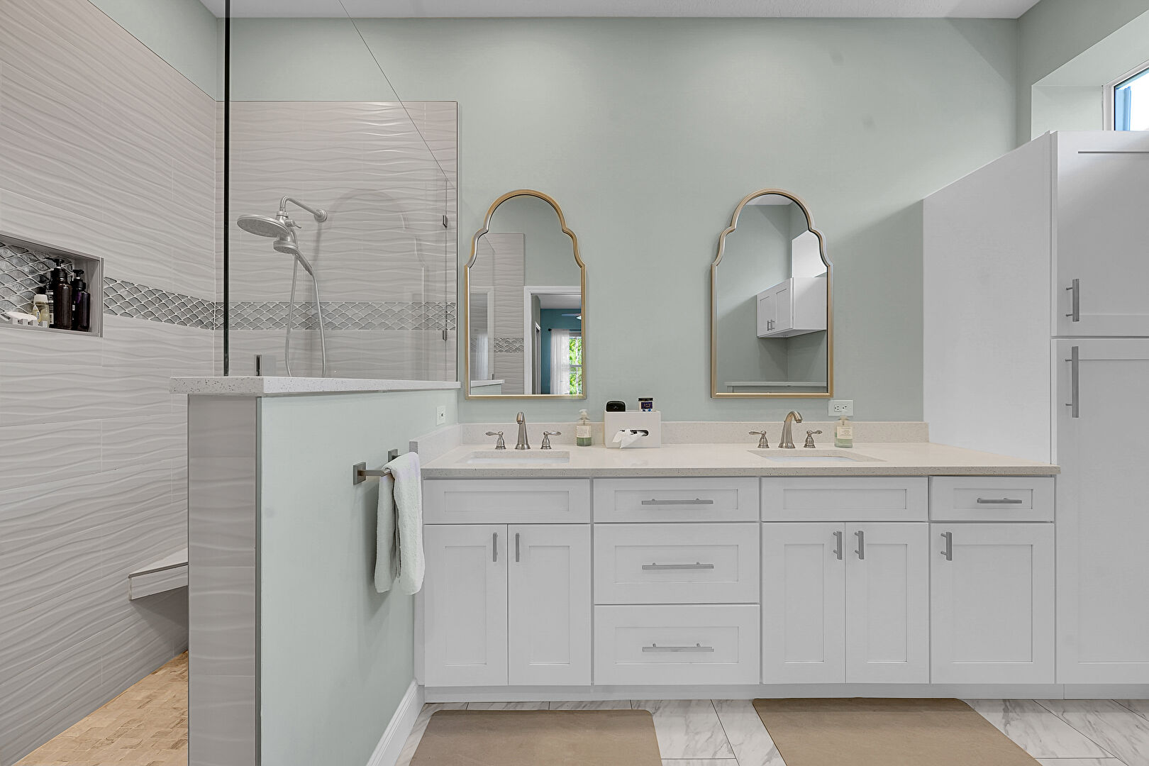Baseboards Wall, Double Vanity, Drywall, Full Bathroom, Marble Finish Floor, Natural Light, Recessed Lighting, Tile Floor, Vent, Double Vanity, Drywall, Natural Light