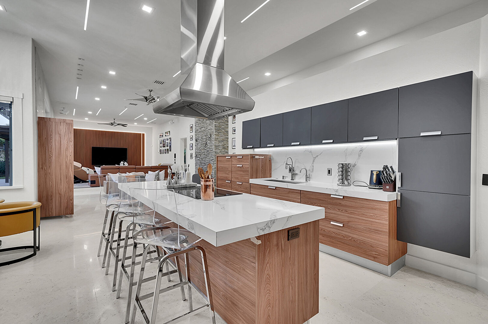 Black Cabinets, Ceiling Fan, Concrete Floor, Double Oven, Drywall, Flat Panel Cabinets, Gray Cabinets, Kitchen Bar, Kitchen Island, Medium Brown Cabinets, Notable Chandelier, Office Area, One Wall Kitchen, Opens To Living Area, Pendant Lighting, Recessed Lighting, Stone Countertops, Stone Wall, Vent, Drywall, Fireplace, Kitchen Bar, Medium Brown Cabinets, Natural Light, Notable Chandelier, Recessed Lighting
