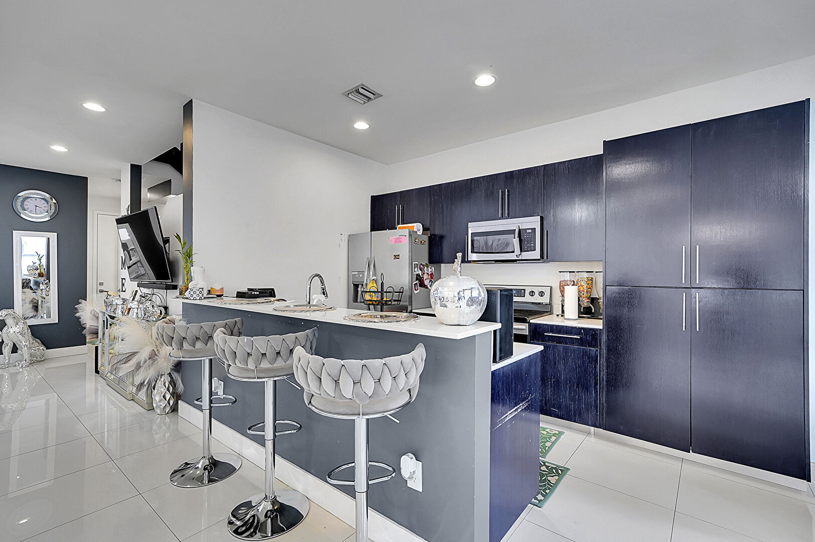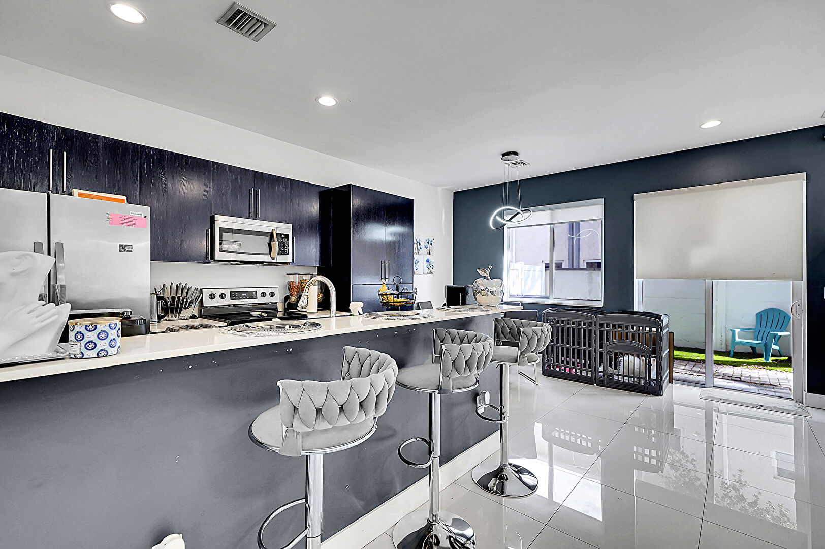Baseboards Wall, Black Cabinets, Drywall, Flat Panel Cabinets, Galley Kitchen, Kitchen Bar, Kitchen Peninsula, Natural Light, Notable Chandelier, Pendant Lighting, Recessed Lighting, Stone Countertops, Tile Floor, Vent, Drywall, Kitchen Peninsula, Tile Floor