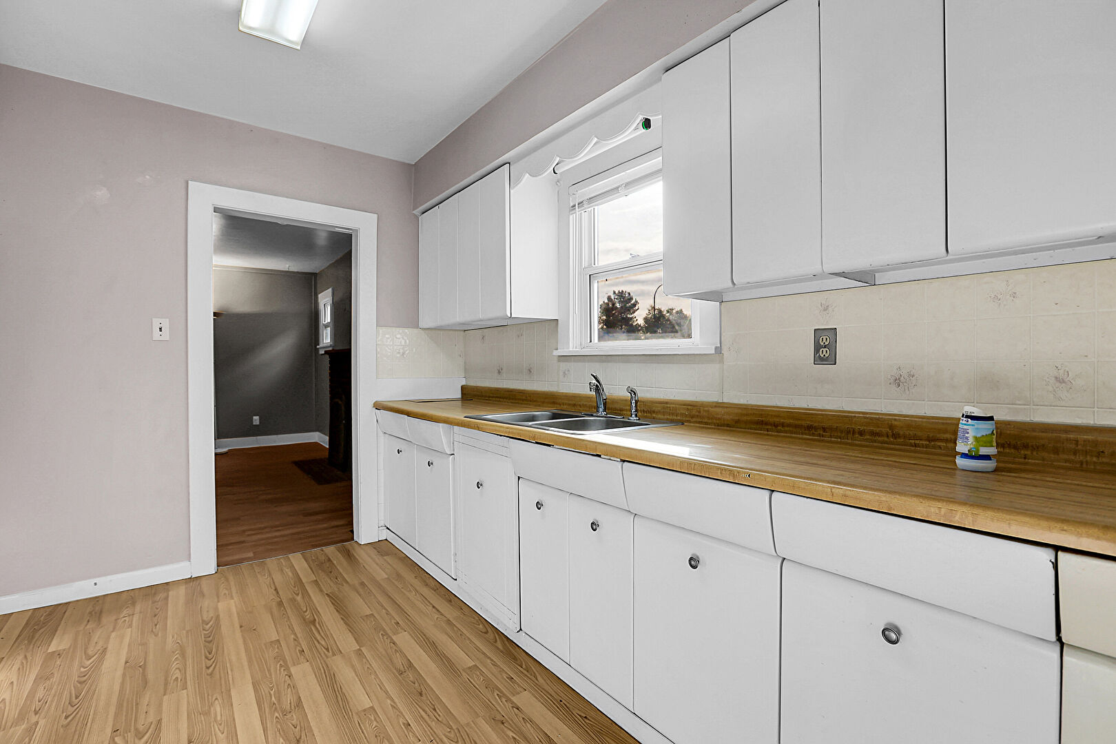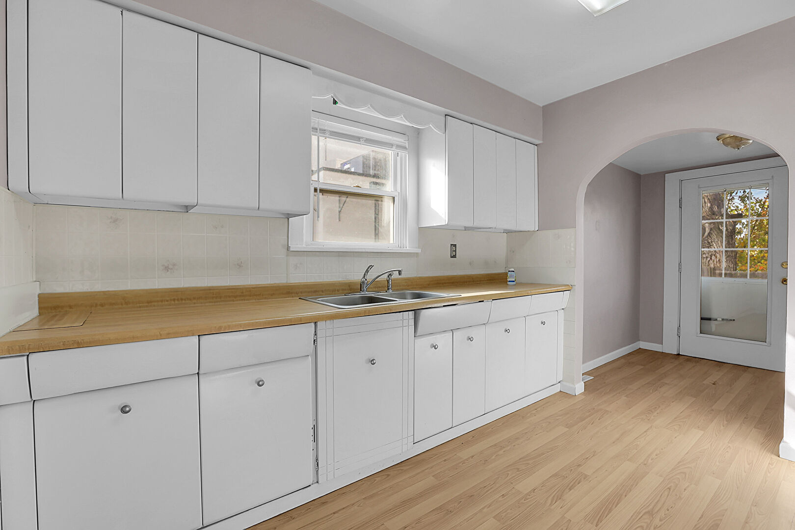 Arched Walkways, Baseboards Wall, Butcher Block Countertops, Drywall, Natural Light, Open Shelves, Vent, Wood Finish Floor, Arched Walkways, Baseboards Wall, Wood Finish Floor
