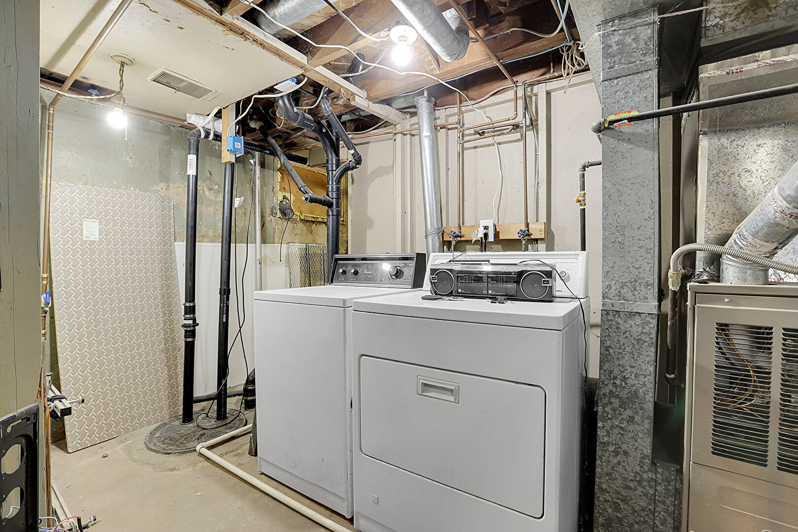 Concrete Floor, Furnace, Laundry, Sump Pump, Vent, Washer Hookup, Basement