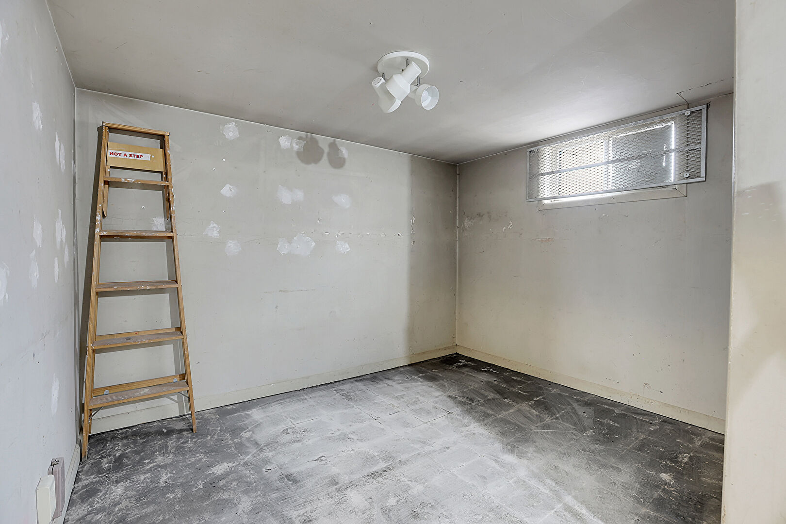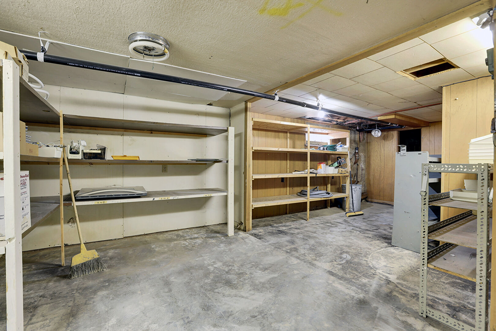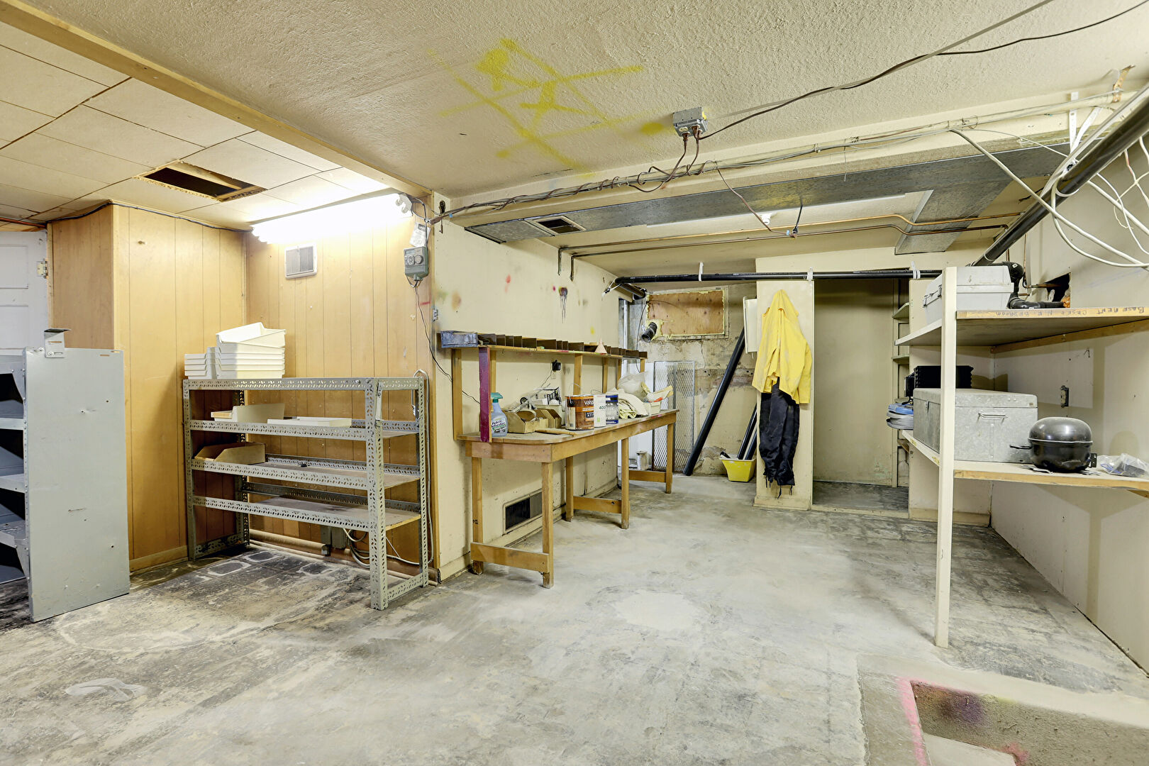 Baseboards Wall, Basement, Drywall, Textured Ceiling, Vent, Wood Wall, Workshop, Basement, Natural Light, Wood Wall