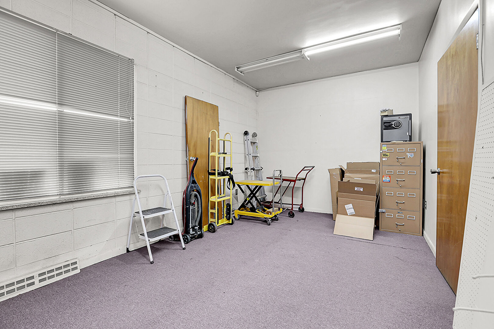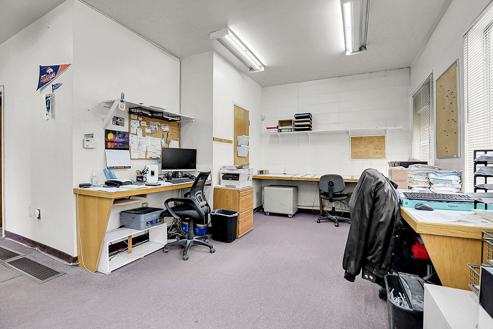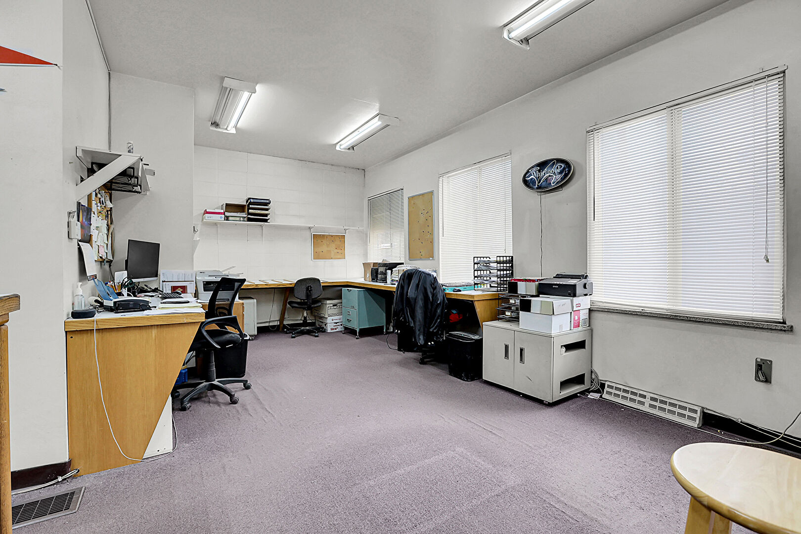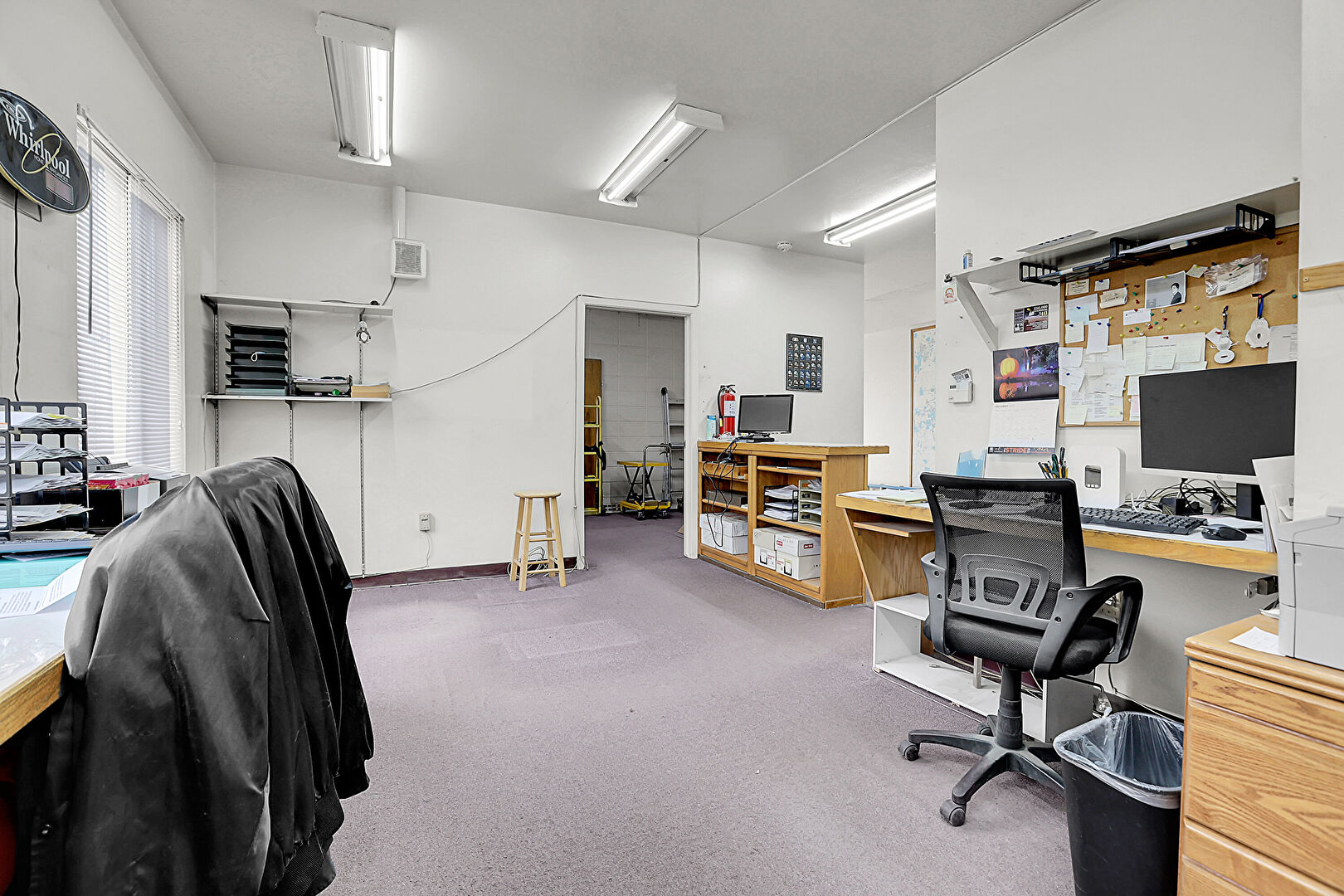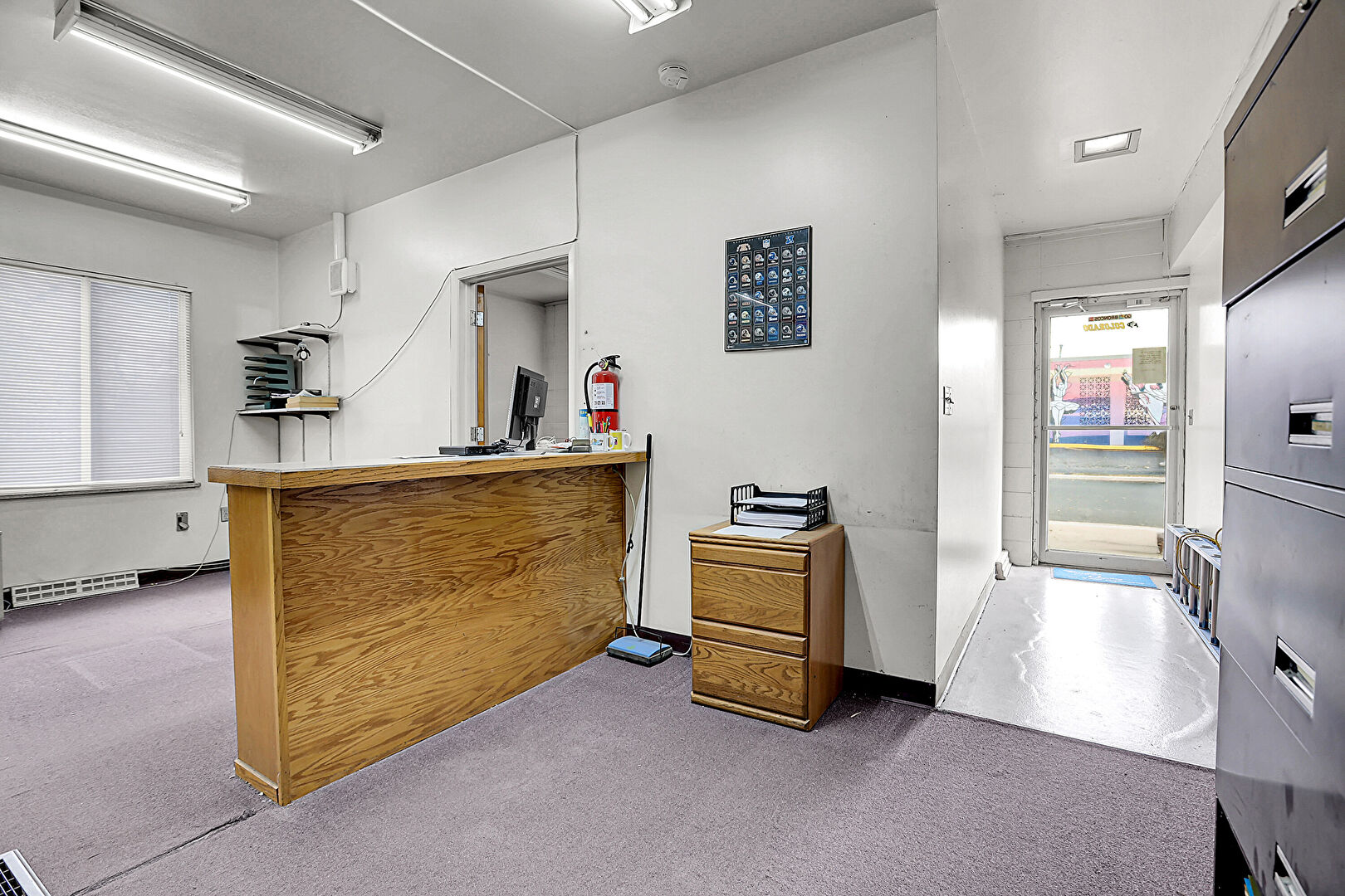Baseboards Wall, Carpet, Drywall, Fire Extinguisher, Natural Light, Office Area, Vent, Built In Desk, Natural Light, Office Area