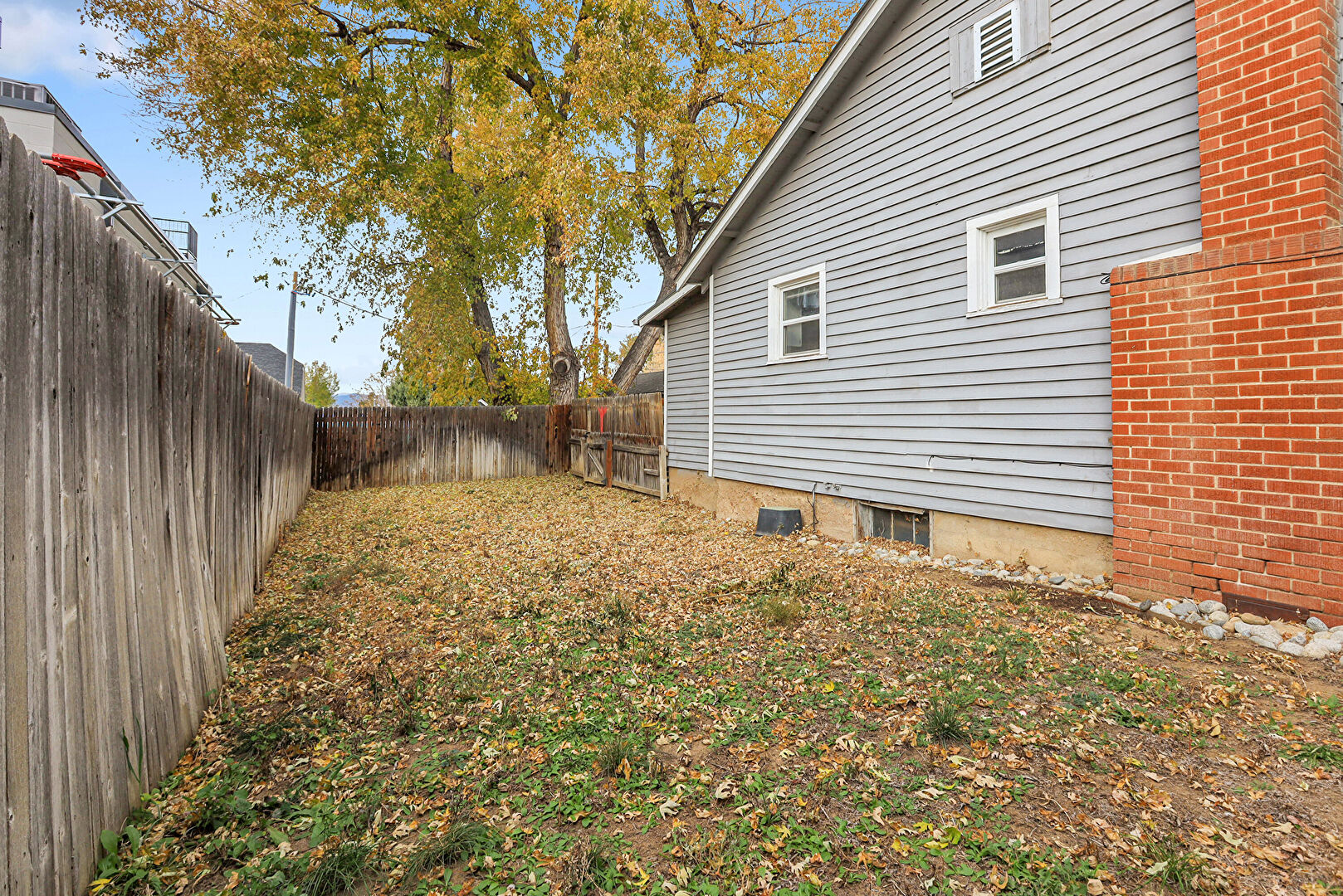 Chimney, Concrete Foundation, Downspout, Fence, Gate, Horizontal Siding, Gutters