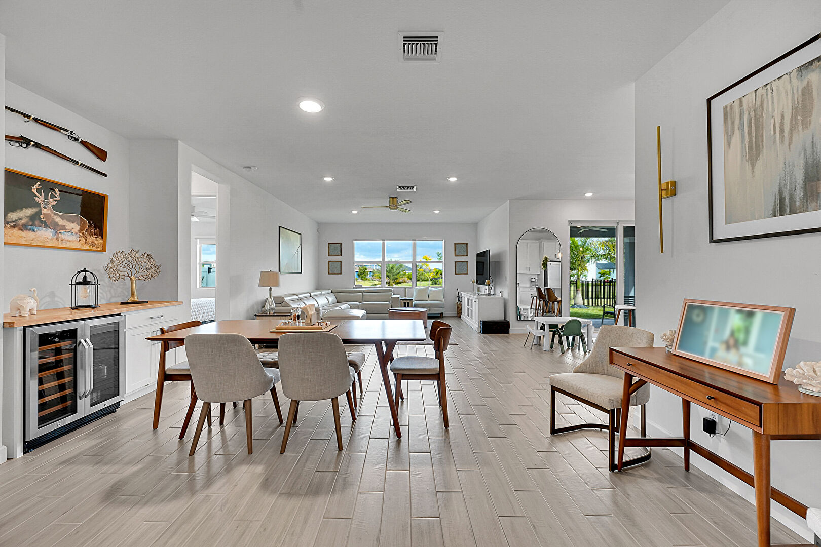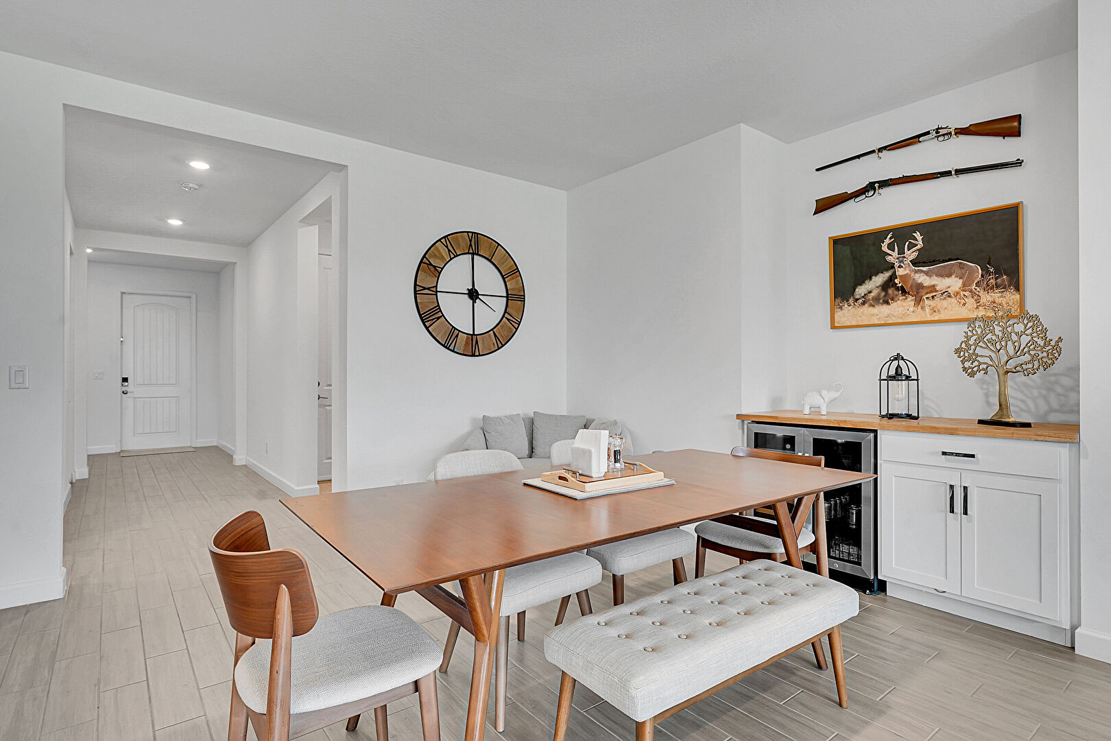 Baseboards Wall, Ceiling Fan, Drywall, Recessed Lighting, Vent, Wine Cooler, Wood Finish Floor, Baseboards Wall, Natural Light
