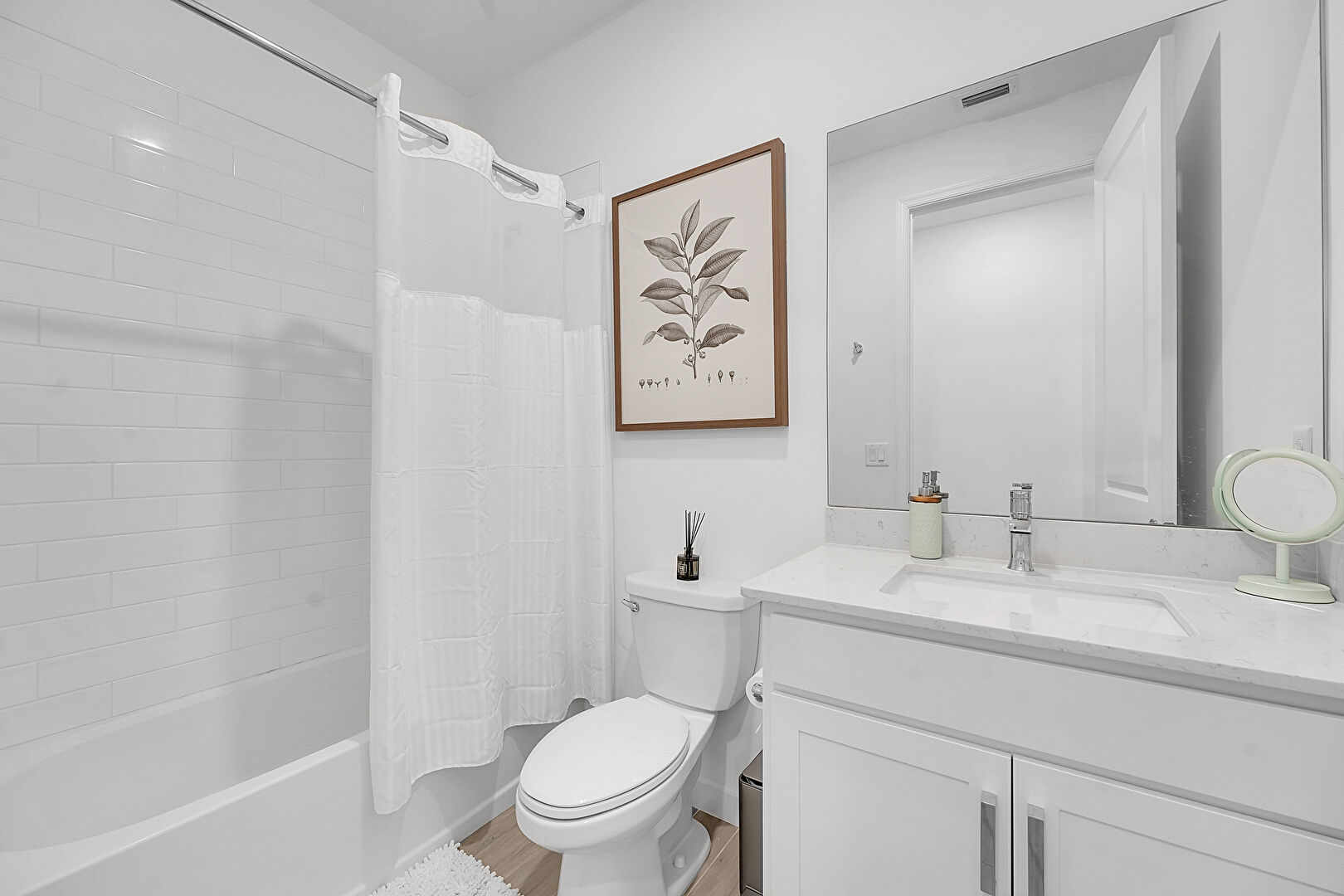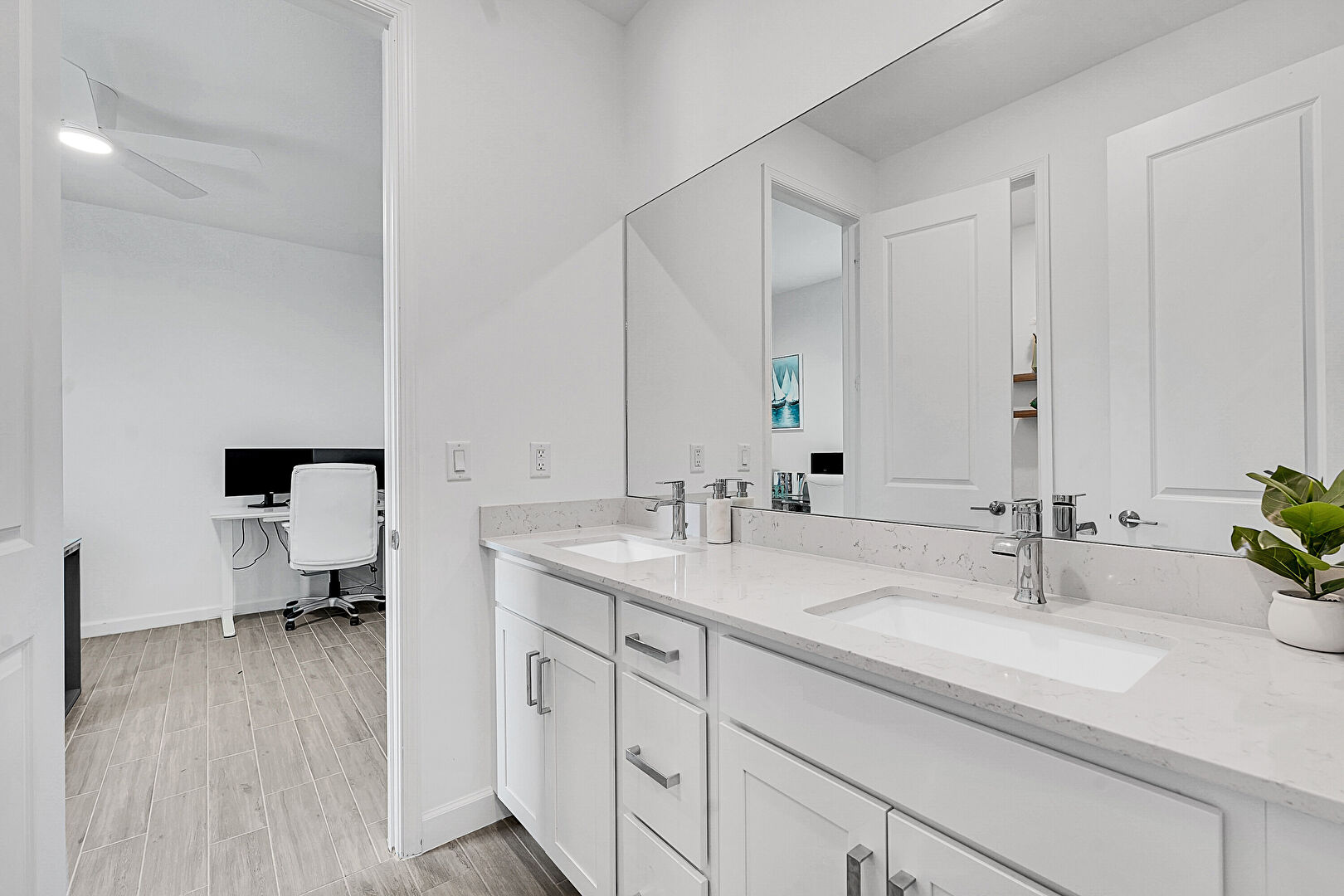 Baseboards Wall, Ceiling Fan, Combined Bath Shower, Double Vanity, Drywall, Full Bathroom, Natural Light, Recessed Lighting, Vanity, Vent, Wood Finish Floor, Baseboards Wall, Wood Finish Floor